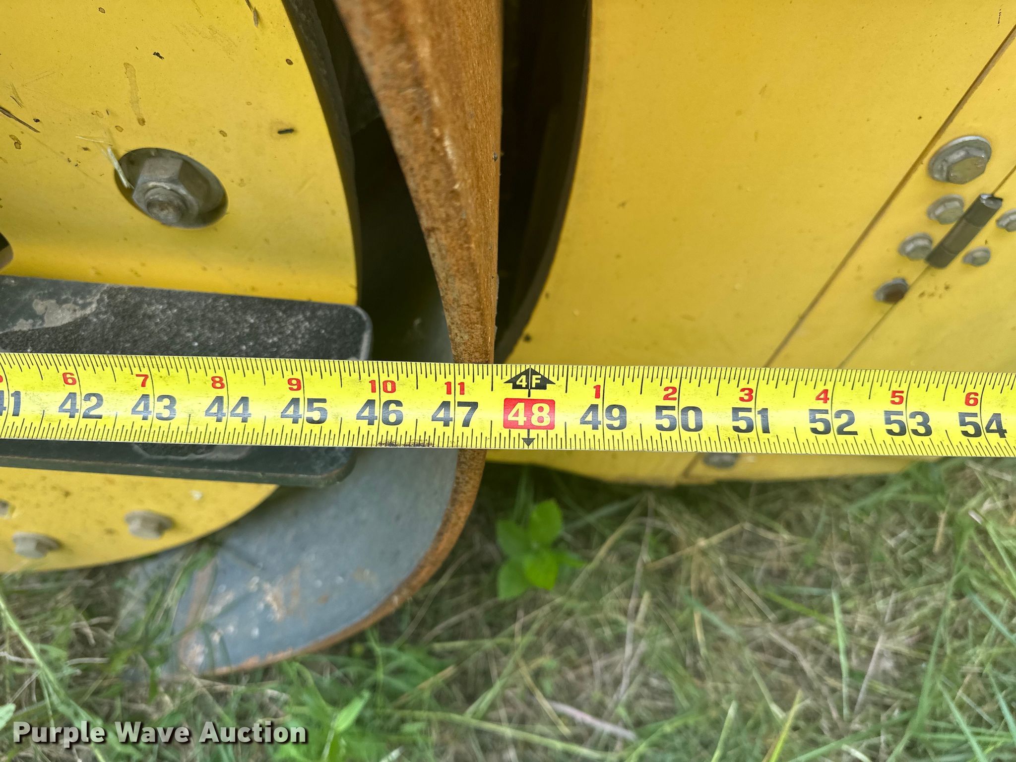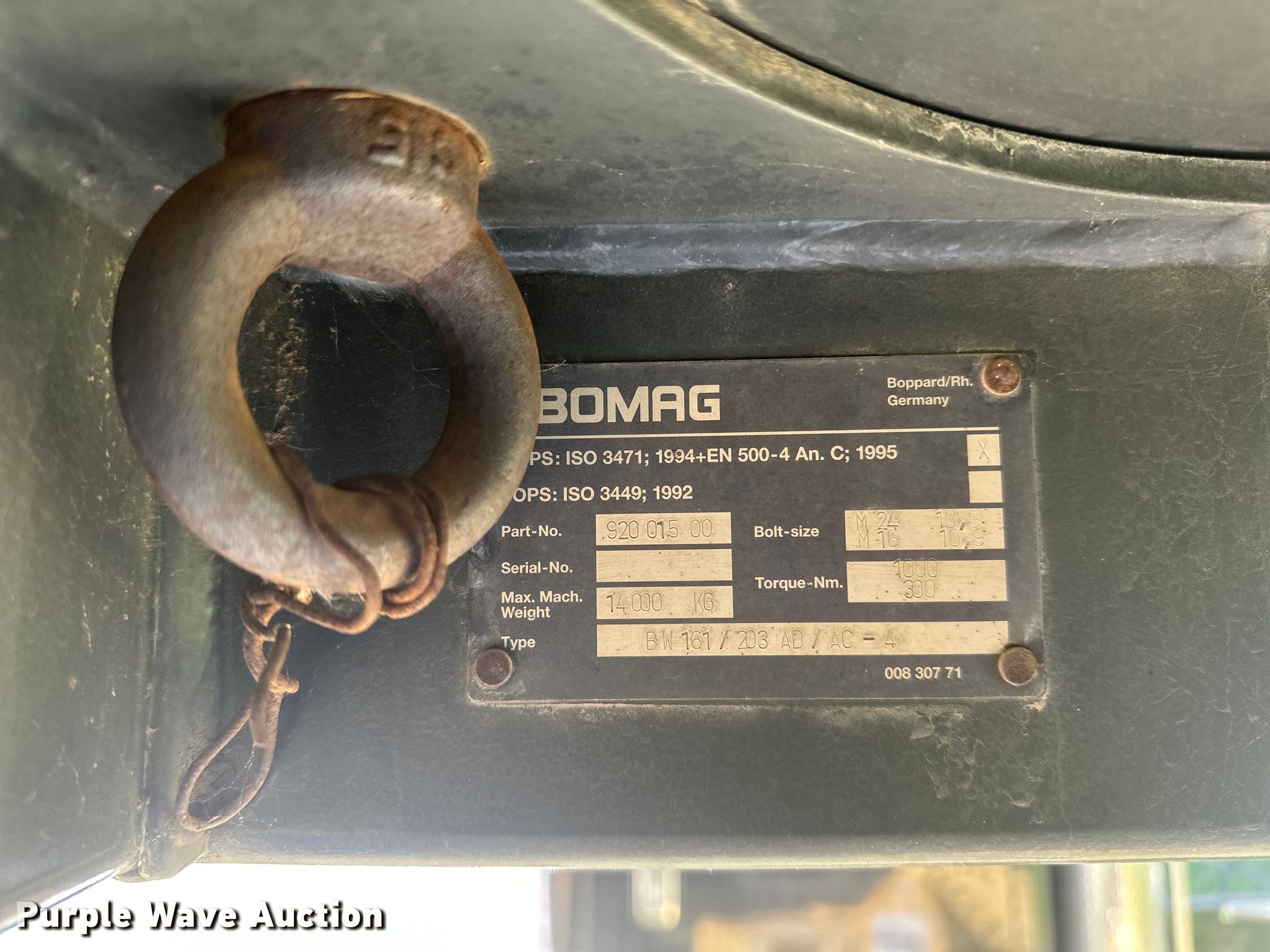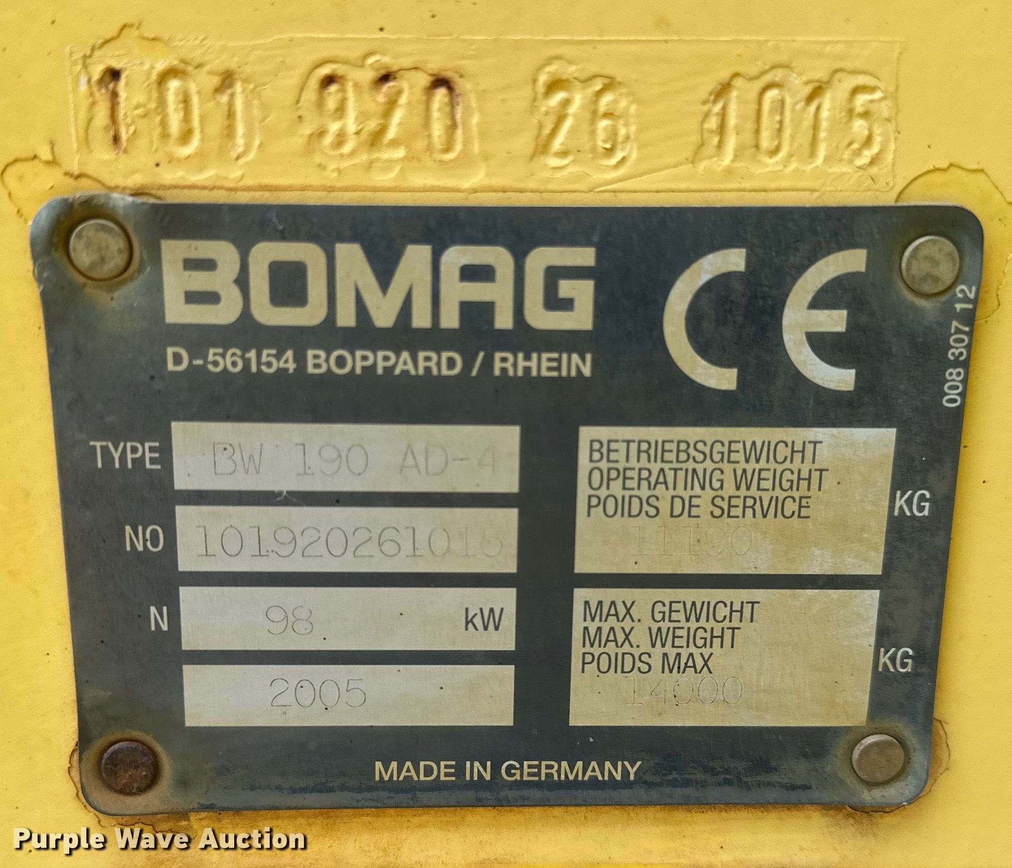 2005 Bomag BW190 AD-4 double drum vibratory roller. Hours: Unknown, Serial: 101920261015. Engine Deutz BF4M, Serial: 10013763, Displacement: 4.038L, Cylinders: 4, Fuel type: Diesel, HP: 131, kW: 98. Transmission Hydrostatic, Two speed travel. Operators station OROPS, Vandal cover. Features Drum: Smooth, Vibratory system: Double, Independent drum controls, Two speed, Front drum Width: 79", Diameter: 48", Rear drum Width: 79", Diameter: 48", Drum scrapers: Front, Rear, Water spray applicator: Front, Rear. Tires Steel wheels. Notes Dead battery, Engine issues, Non-operational unit. JOB Construction, Inc.. Poteau, OK 74953