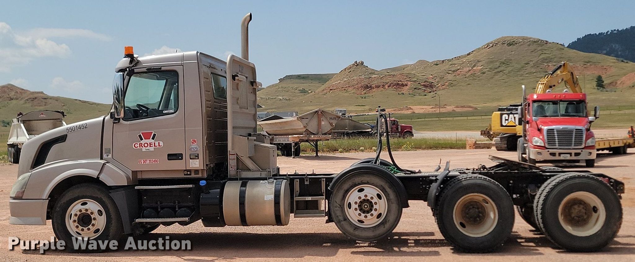 2014 Volvo VNL semi truck. Miles: 140,408 on odometer, VIN: 4V4N99KL6EN172247. Engine Volvo D16, Cylinders: 6, Fuel type: Diesel. Transmission Automatic. Chassis Axles: Triple, Pusher axle Steerable, Differential lock: Inter-axle, Suspension: Air, Brakes: Air, PTO. Interior AC, Heat, Heated mirrors, Cruise control. Features Fifth wheel type: Air operated, Sliding, Fuel tank: Dual. Tires Front: 11 R22.5, Rear: 11R22.5, Lift axle: 295/75R22.5. Notes Dash warning indicator: Check engine, Traction control, Open brake circuit, Check engine fault. Iowa title. Title distribution may be delayed up to 14 days from verification of funds. Croell Redi-Mix. Sundance, WY 82729
