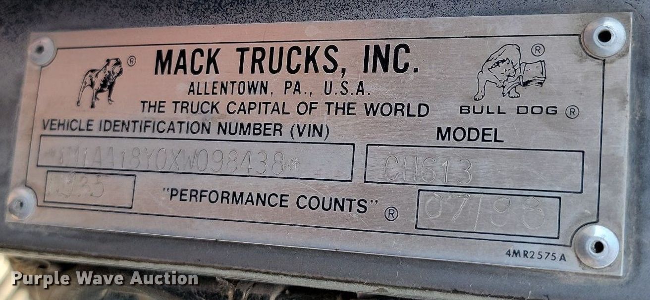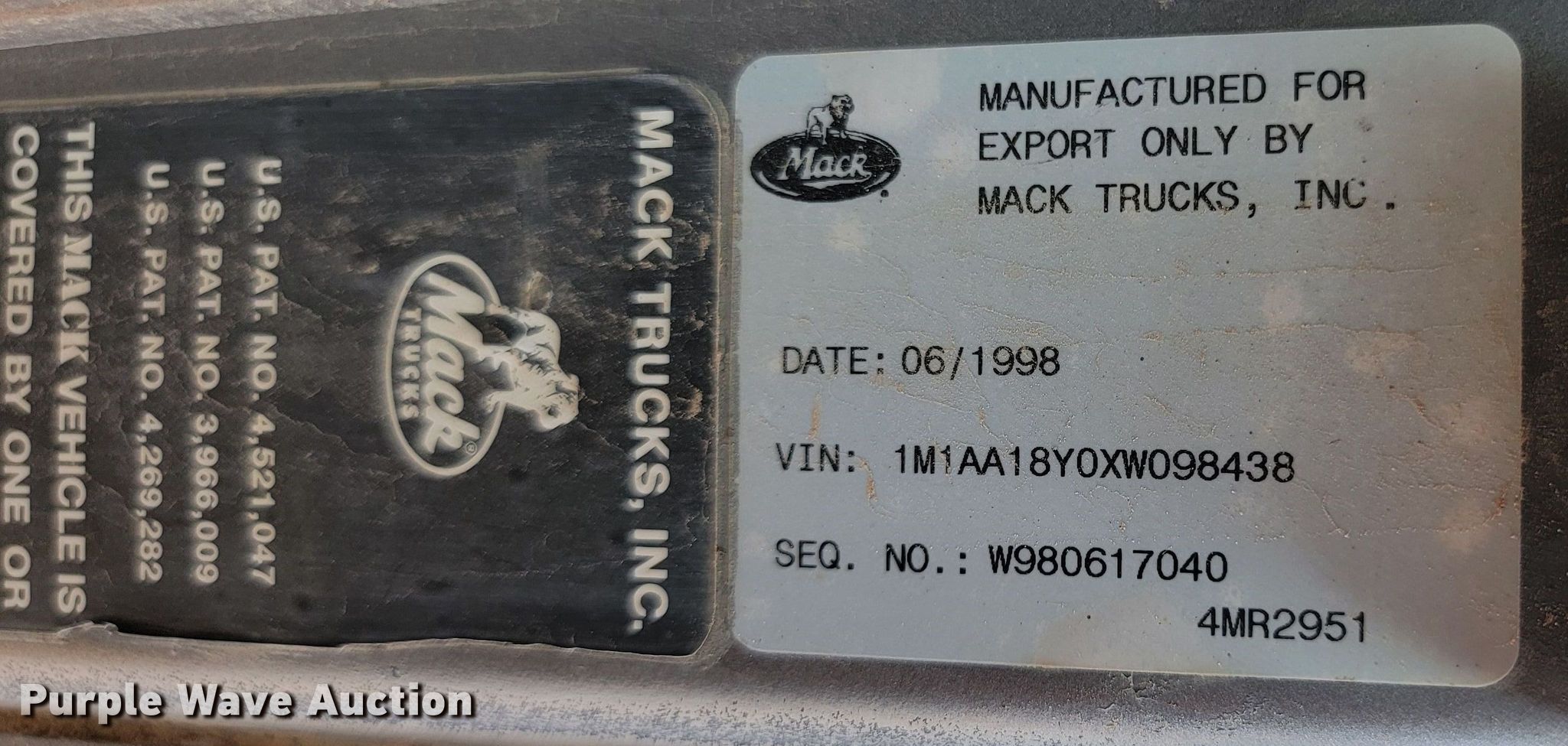 Purple Wave is selling a used Construction Dump Truck in Wyoming. This item is a 1999 Mack CH600 dump truck with the following: Miles: 217,776 on odometer, Hours: 33,414 on meter, VIN: 1M1AA18Y0XW098438