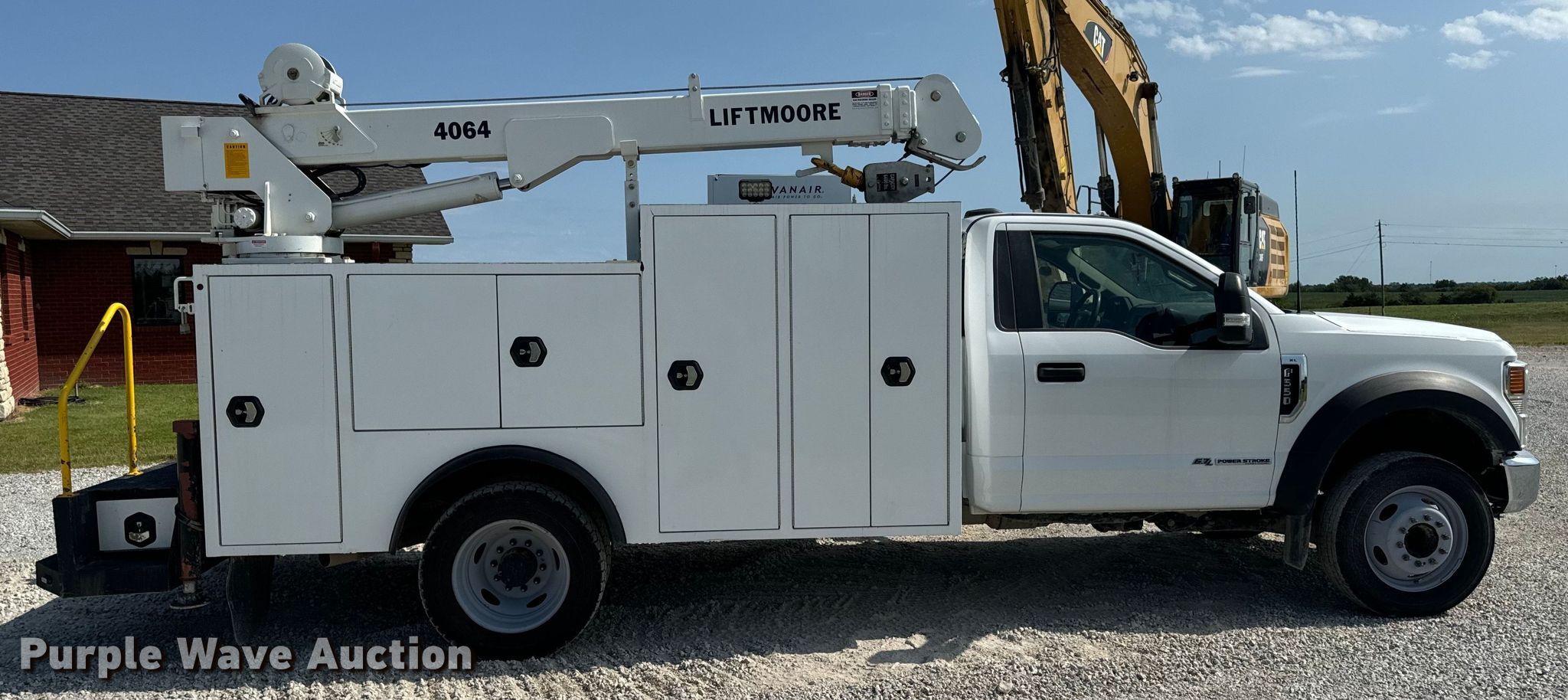 2022 Ford F550 XL utility / service truck. Miles: 21,163 on odometer, Hours: 2,832 on meter, VIN: 1FDUF5GT3NED63377, Unit #: 3606. Engine Power Stroke, Displacement: 6.7L, Cylinders: 8, Fuel type: Diesel. Transmission Automatic. Chassis Axles: Single, Suspension: Spring, Brakes: Hydraulic, PTO, Wet kit, GVWR: 19,500 lbs. Interior AC, Heat, Heated mirrors, Power windows, Power locks, Cruise control, Auxiliary controls, Brake controller. Features Bed 11' L x 94" W, Torch bottle rack, Air compressor VanAir RC40 Reliant, Crane Liftmoore 4064, Maximum boom length: 23' Maximum lift capacity: 6,400 lbs.. Tires Size: 225/70R19.5. Missouri title. Title distribution may be delayed up to 30 days from verification of funds. Hardy Holding Inventory Realignment. Boonville, MO 65233