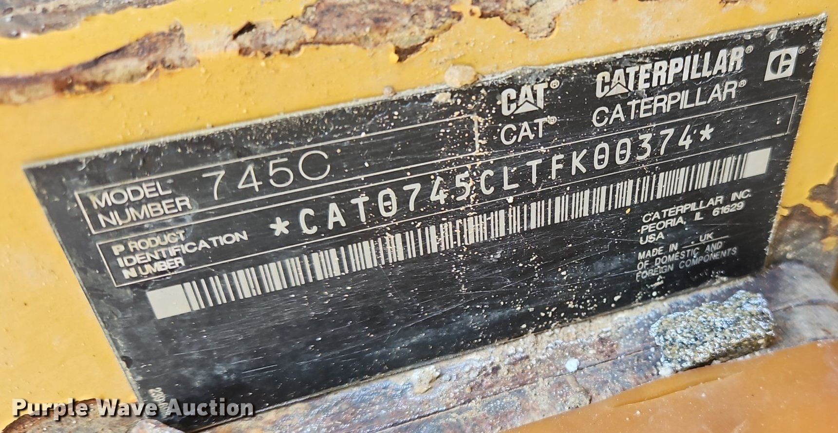 2015 Caterpillar 745C haul truck. Hours: 11,605 on meter, Serial: CAT0745CLTFK00374. Engine Caterpillar C18, Displacement: 18.1L, Cylinders: 6, Fuel type: Diesel. Transmission Automatic. Interior AC, Heat, Backup camera. Features Dump bed, On-board scales. Tires Size: 29.5R25. Notes Dash warning indicator: Brake, Service brake fault. View repairs. Hardy Holding Inventory Realignment. Hardinsburg, KY 40143