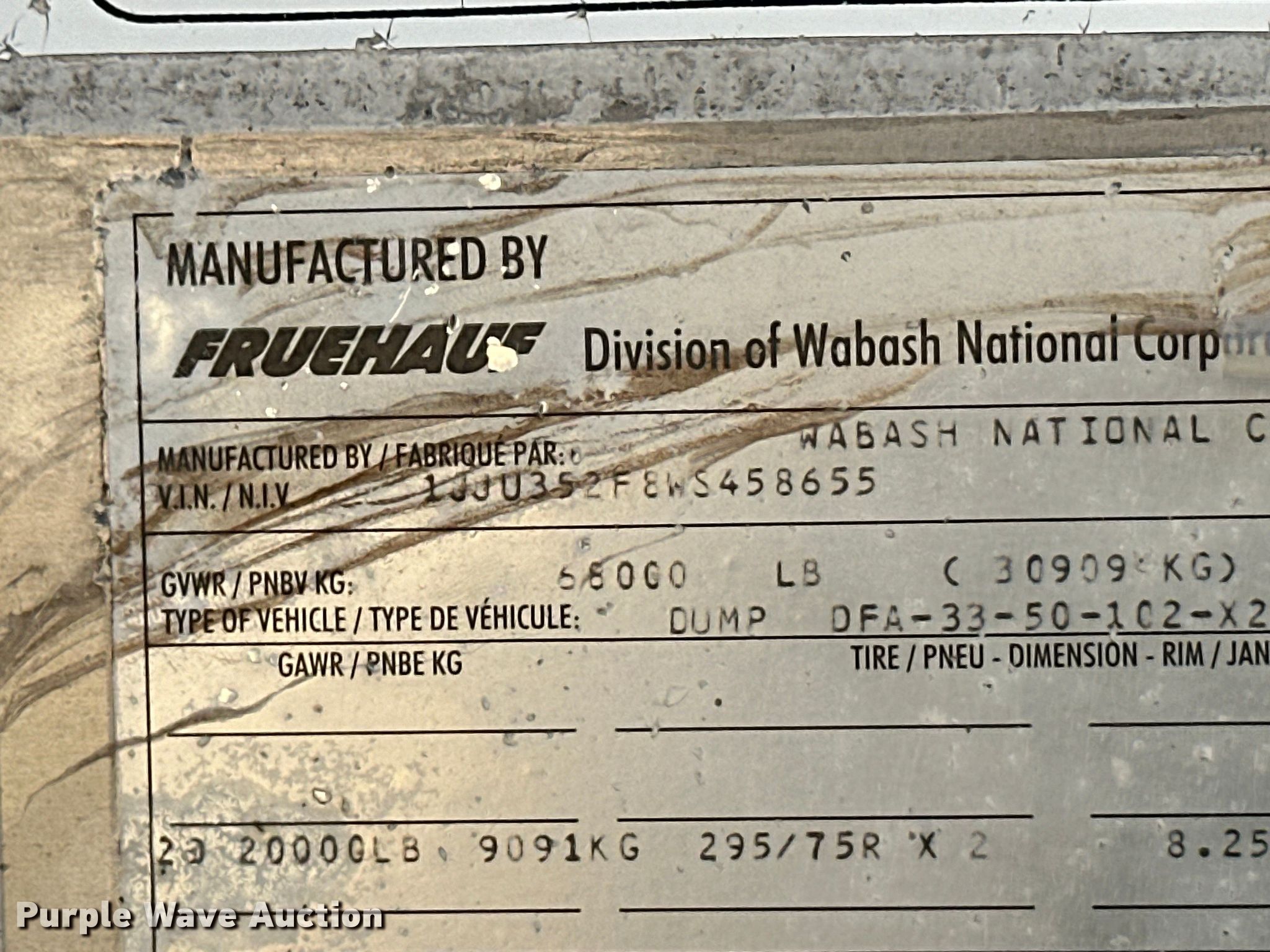 1998 Fruehauf end dump trailer. VIN: 1JJU352F8WS458655. Dimensions Overall: 35' L x 94" W, Side height: 50". Features Body type: Aluminum, Ram: Single, End gate: Air operated. Chassis Landing gear: Dual, Suspension: Air, Brakes: Air, Axles: Tandem. Tires Aluminum wheels, Size: 11R22.5. Iowa title. Title distribution may be delayed up to 14 days from verification of funds. Croell Redi-Mix. Woodward, OK 73801