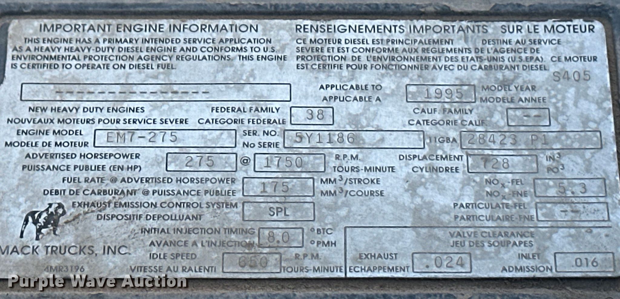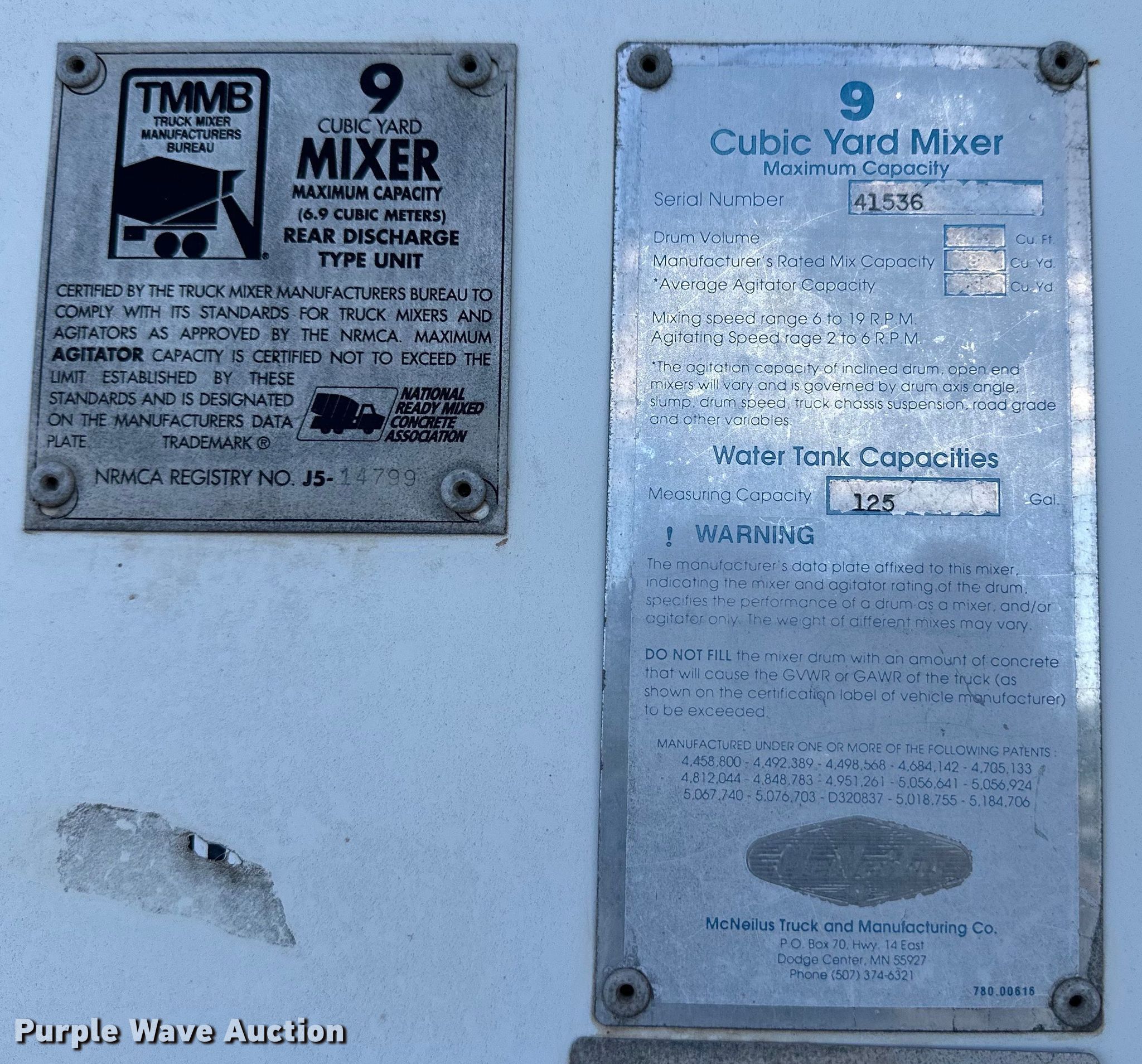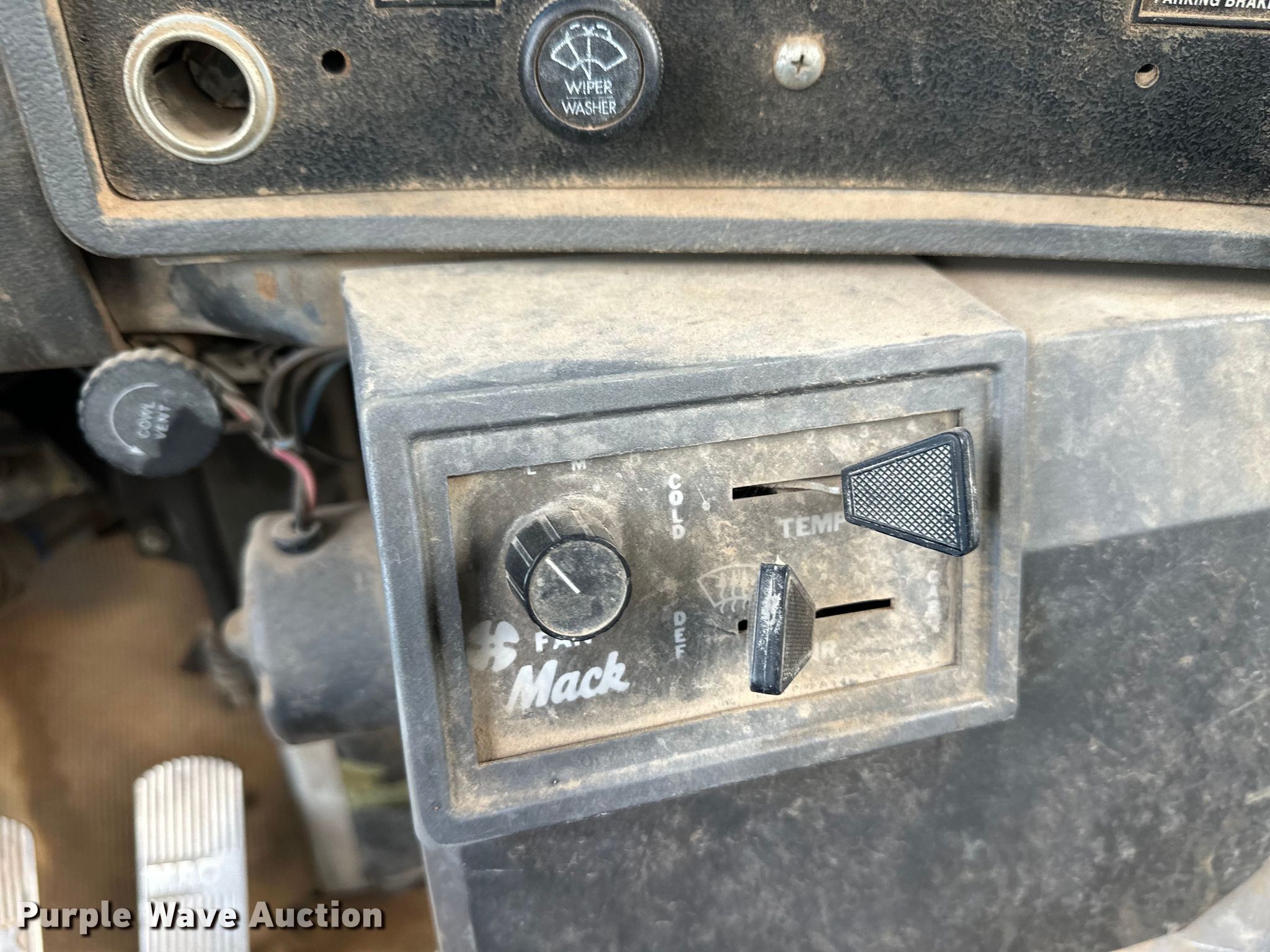 1996 Mack DM690S ready mix truck. Miles: 103,716 on odometer, Hours: 11,652 on meter, VIN: 1M2B221C6TM018616. Engine Mack, Displacement: 728 C.I.D., Cylinders: 6, Fuel type: Diesel. Transmission Manual. Chassis Axles: Tandem, Differential lock: Inter-axle, Suspension: Spring, Brakes: Air, Front mount PTO. Interior Heat, Heated mirrors. Features Mixer McNeilus, Capacity: 9 cu.yd., Discharge: Rear, In-cab controls, Rear drum controls, Water tank capacity: 125 gallons, Chute Extensions: 3, Chute type: Steel.. Tires Front: 425/65R22.5, Rear: 11R22.5. Notes No battery. Iowa title. Title distribution may be delayed up to 14 days from verification of funds. Laverne, OK 73848
