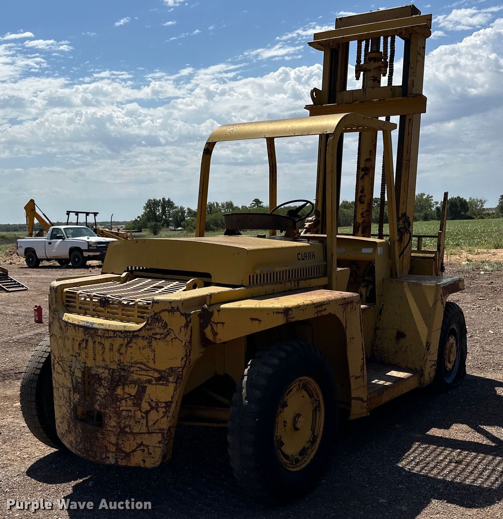 1963 Clark 392439 forklift. Hours: 5,395 on meter, Serial: AL24RS. Engine Cylinders: 6, Fuel type: Gas. Transmission Powershift, 2F - 2R. Operators station Canopy. Features Maximum lift capacity: 15,000 lbs, Mast stages: 3, Mast tilt, Fork length: 48". Tires Size: 9.00-26. Notes Engine issues, shuts off while driving Needs starter. Collingsworth County, TX. Wellington, TX 79095
