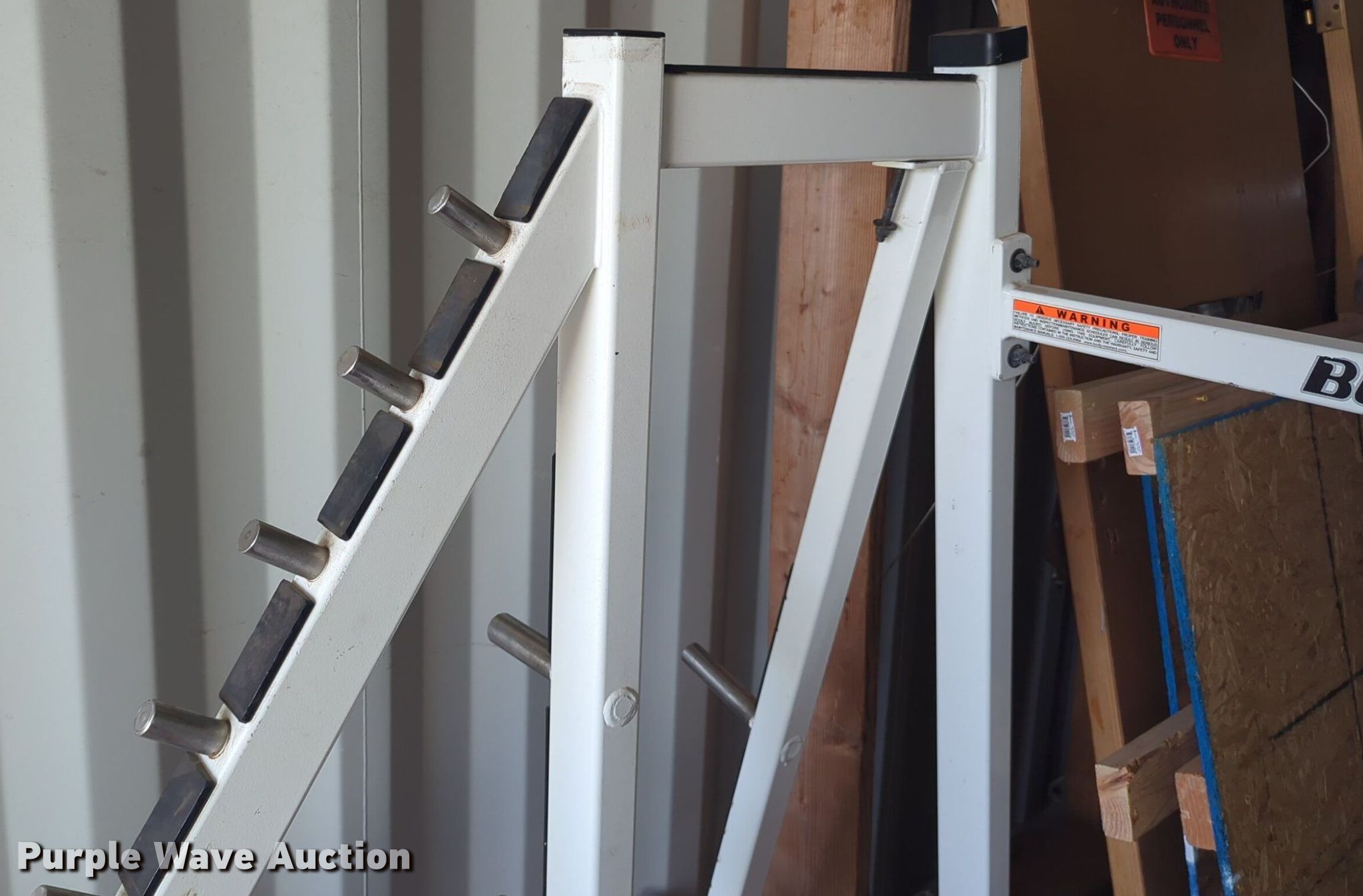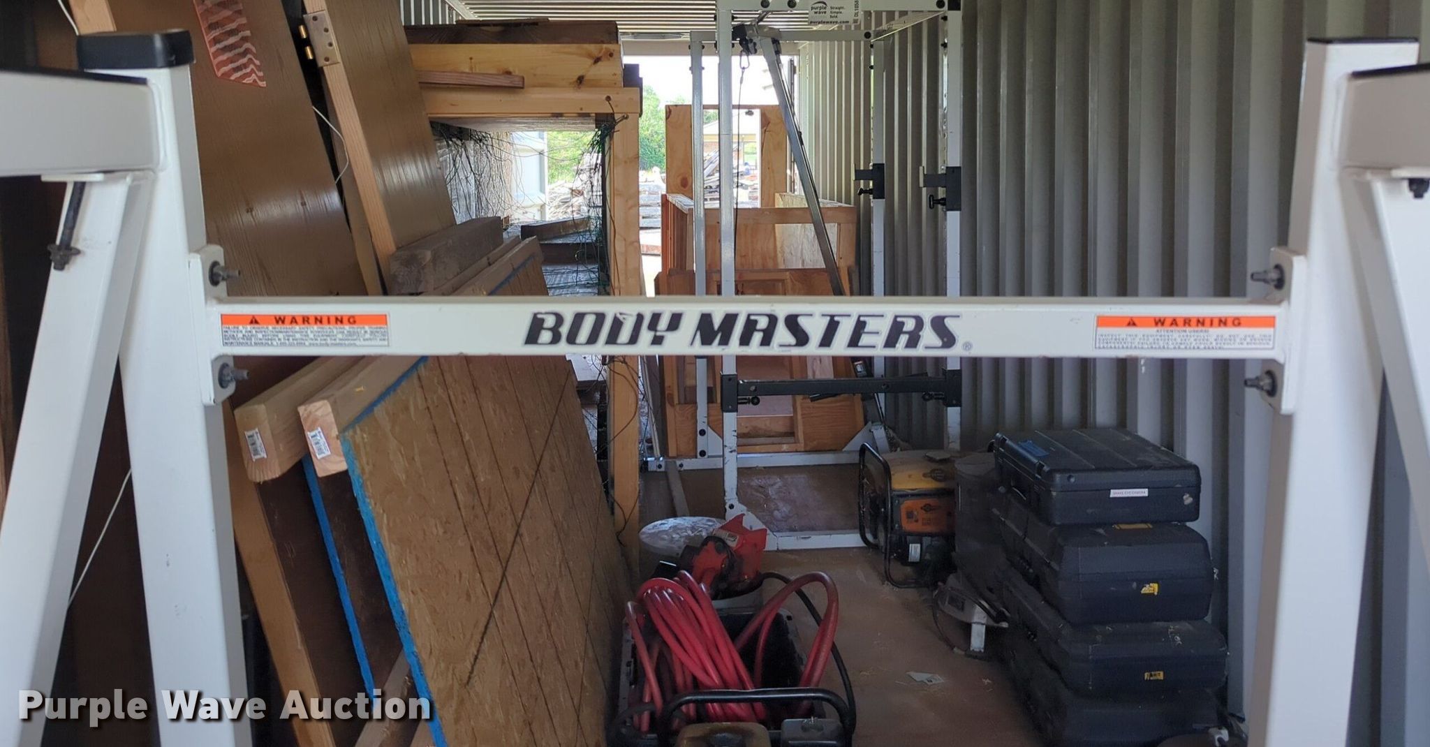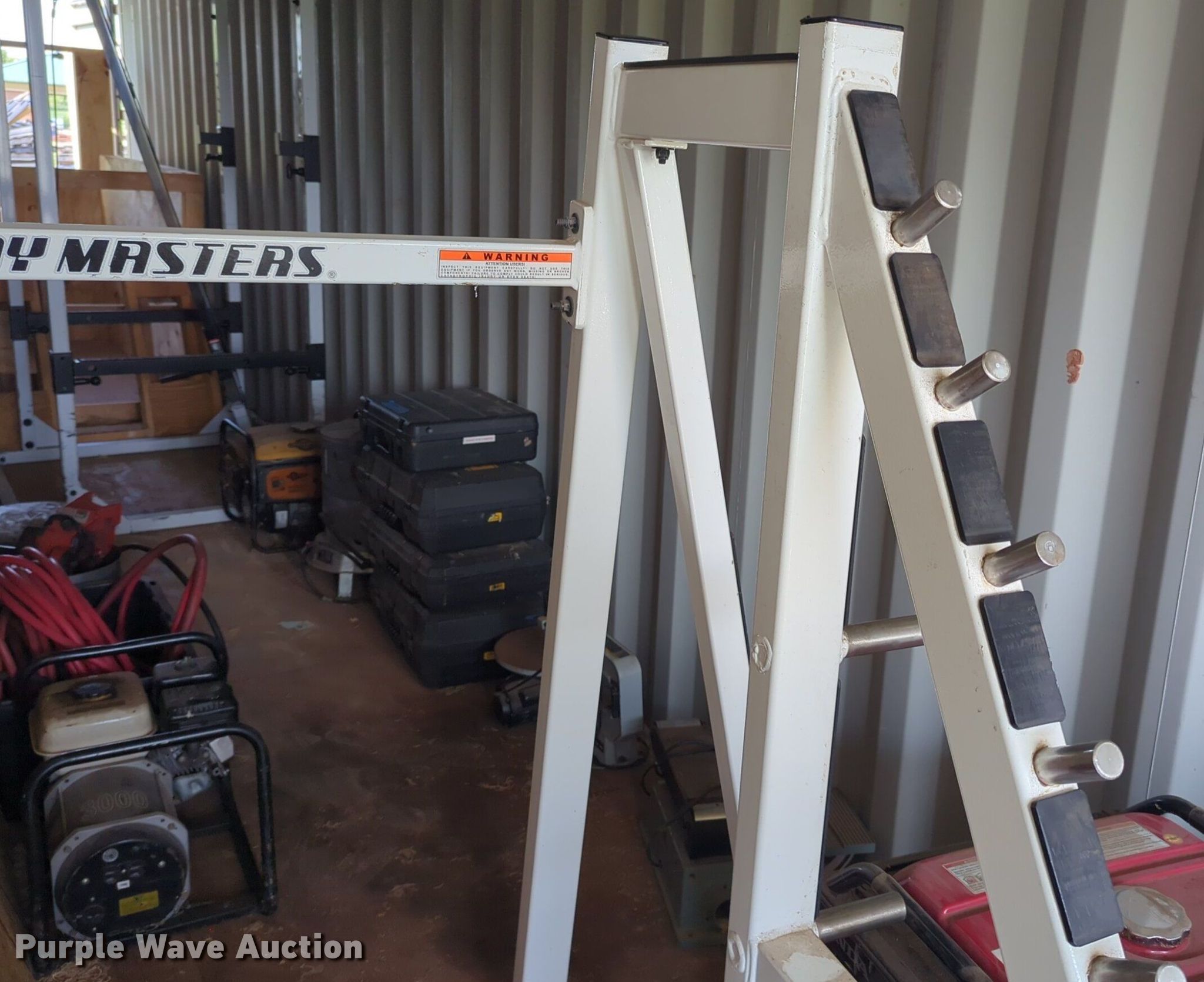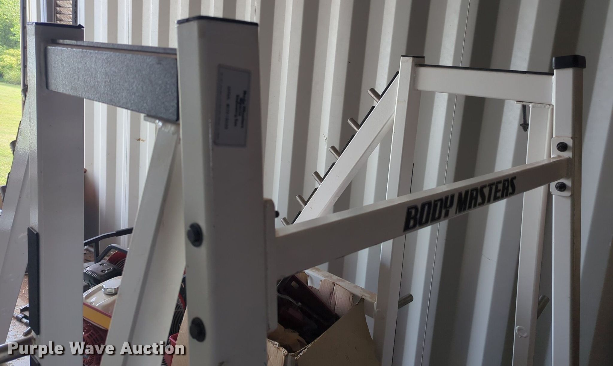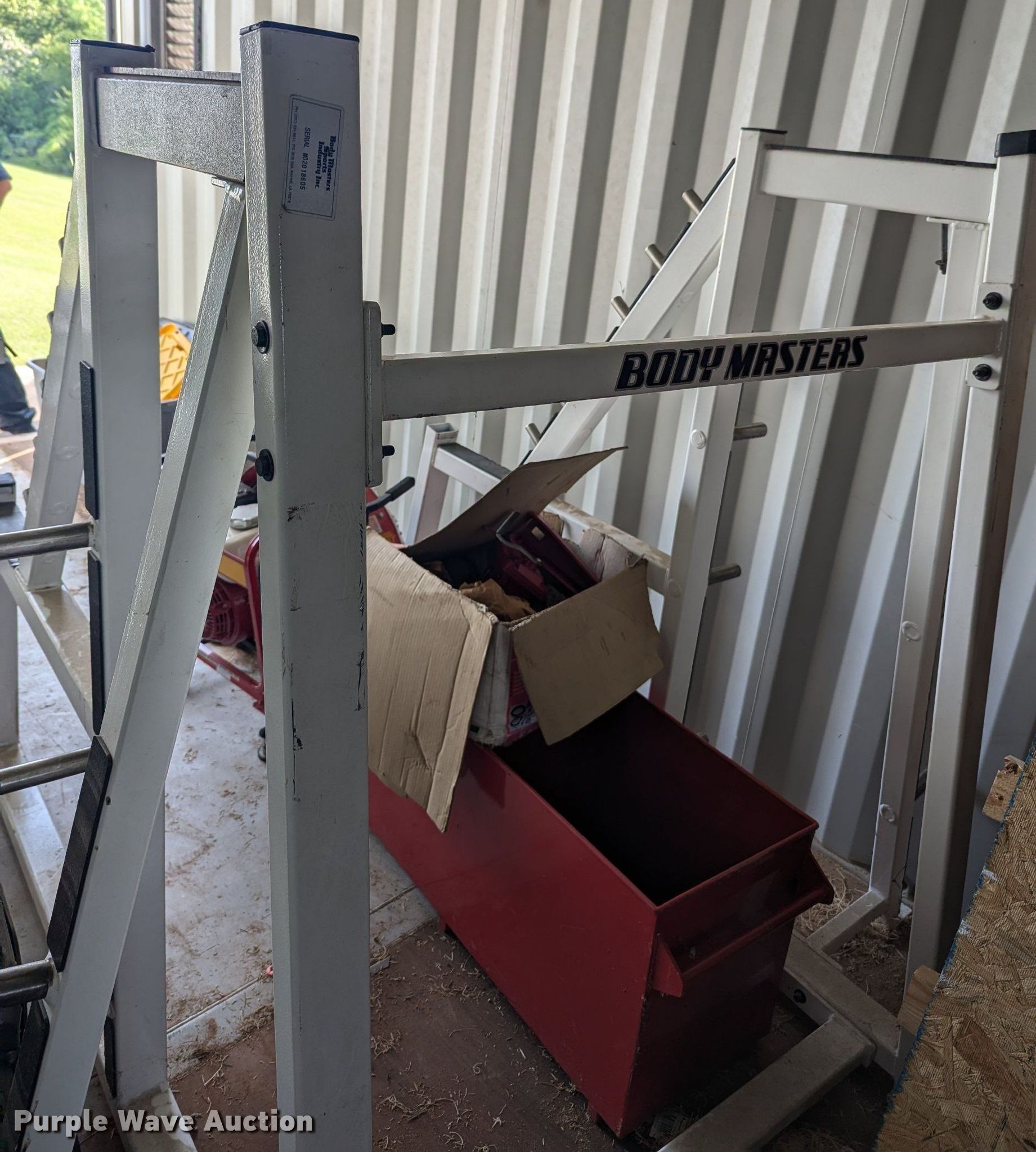 Purple Wave is selling a used Sporting Goods in Oklahoma. This item is a Body Masters workout equipment with the following: Squat rack, Bench press bench, Weight rack