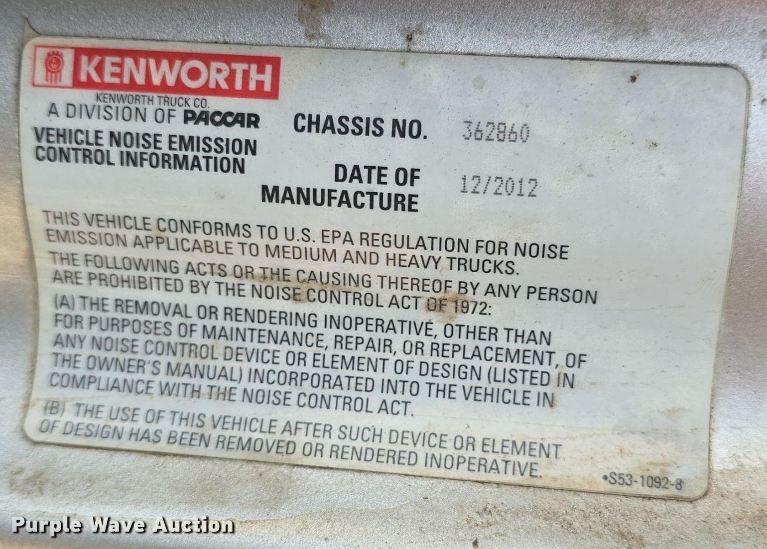 2013 Kenworth T680 semi truck. Miles: Unknown, VIN: 1XKYDP9XXDJ362860. Engine Paccar, Displacement: 12.9L, Cylinders: 6, Fuel type: Diesel, Engine brake. Transmission Eaton Fuller, Automated manual. Chassis Axles: Tandem, Differential lock: Inter-axle, Suspension: Air Dump valves, Brakes: Air, PTO, GVWR: 53,200 lbs FAWR: 13,200 lbs, IAWR: 20,000 lbs, RAWR: 20,000 lbs, Wheelbase: 228". Interior AC, Heat, Power windows, Power locks, Cruise control, Sleeper Sleeper length: 88", Beds: Double bunk, Refrigerator, Microwave, Rear climate control. Features Fifth wheel type: Air operated, Sliding, Fuel tank: Dual. Tires Size: 295/75R22.5. Notes Windshield chipped or cracked, Dead battery, Unknown operating condition. Kansas title. Mileage has not been verified. Odometer discrepancy will be marked on the title. Title distribution may be delayed up to 30 days from verification of funds. Junction City, KS 66441