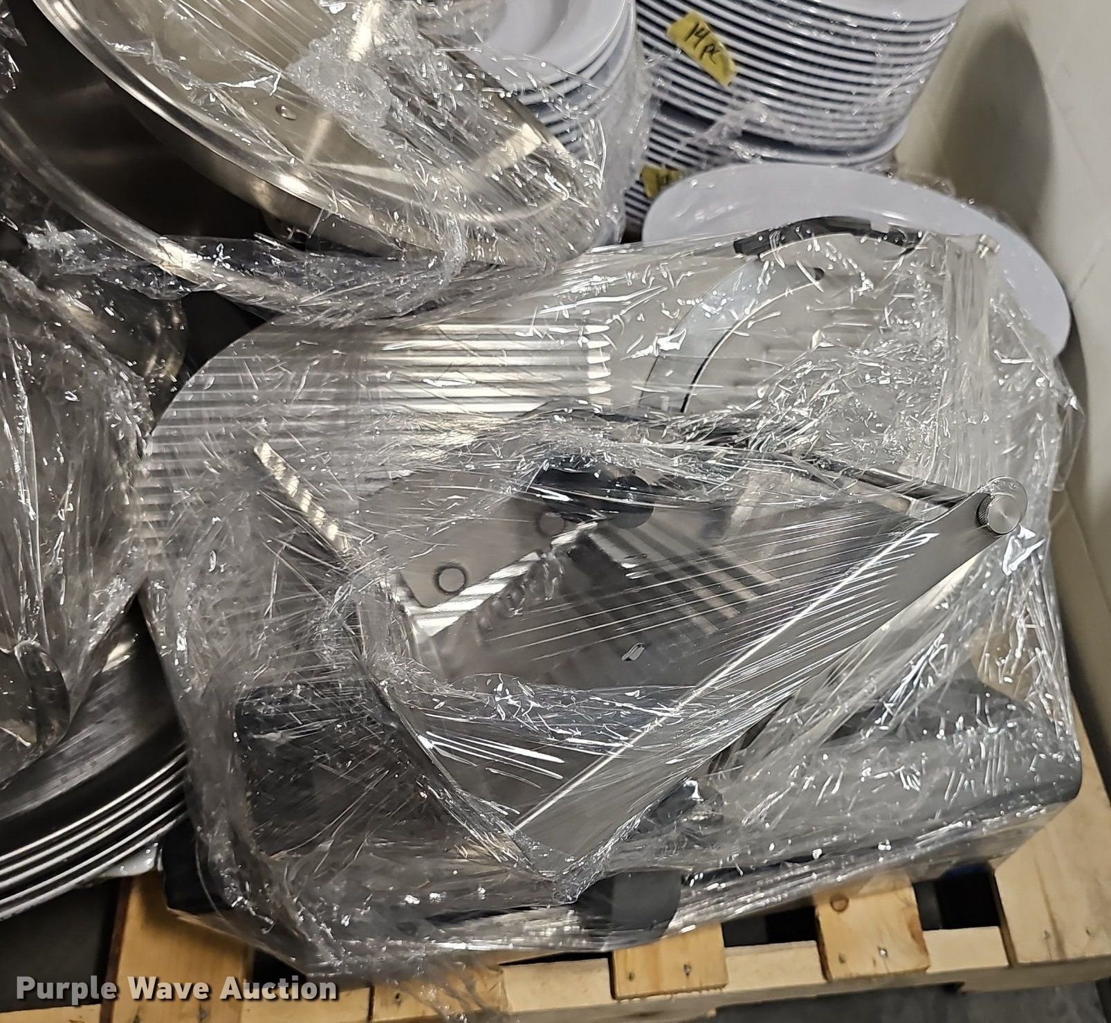 Restaurant equipment. Globe meat slicers, Varimixer mixer, Fryer, (5) coolers, Lights, (178) platters, (92) pans, (93) bowls. City of Lincoln -Pinnacle Bank Arena- Main Kitchen. Lincoln, NE 68508