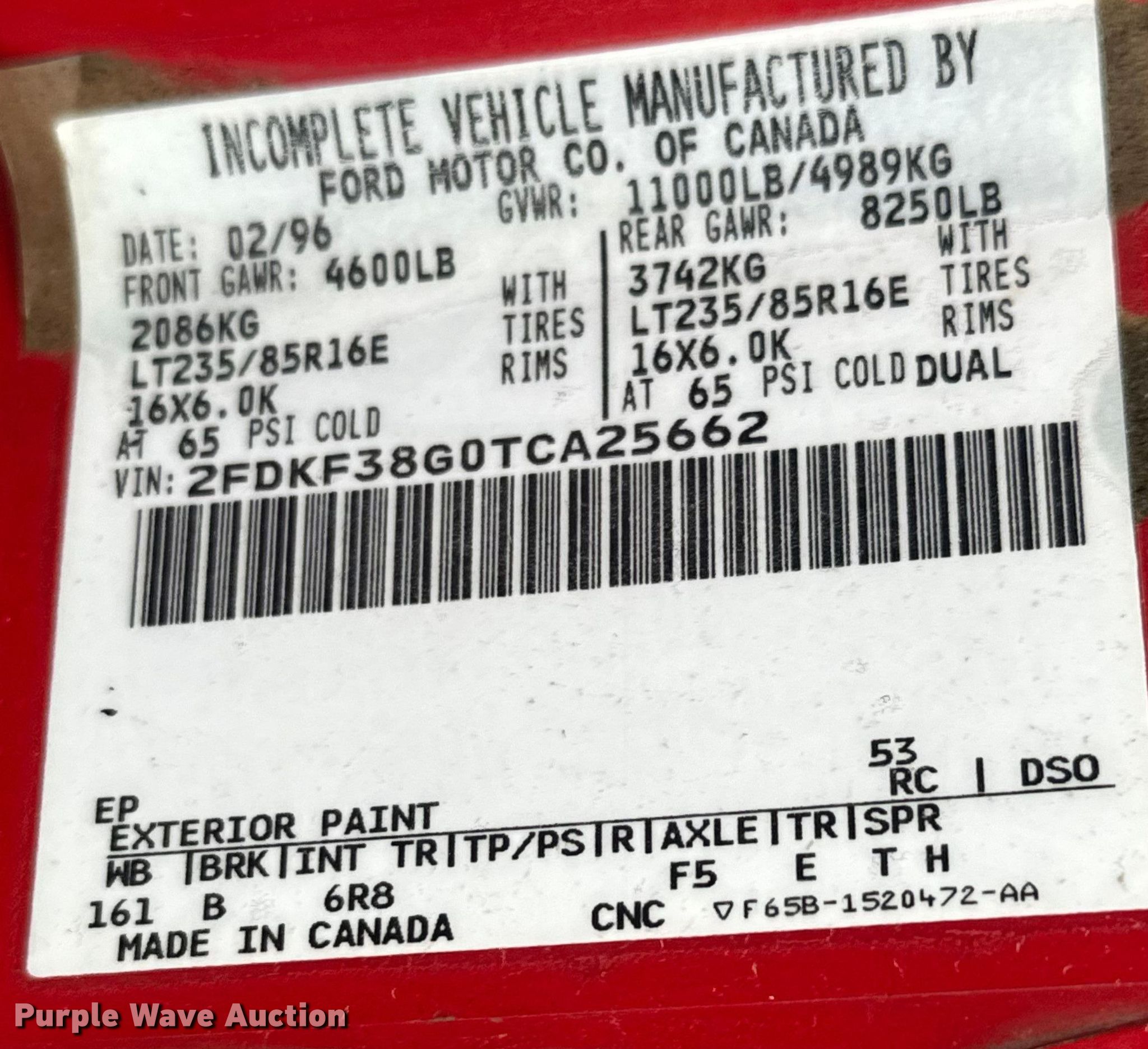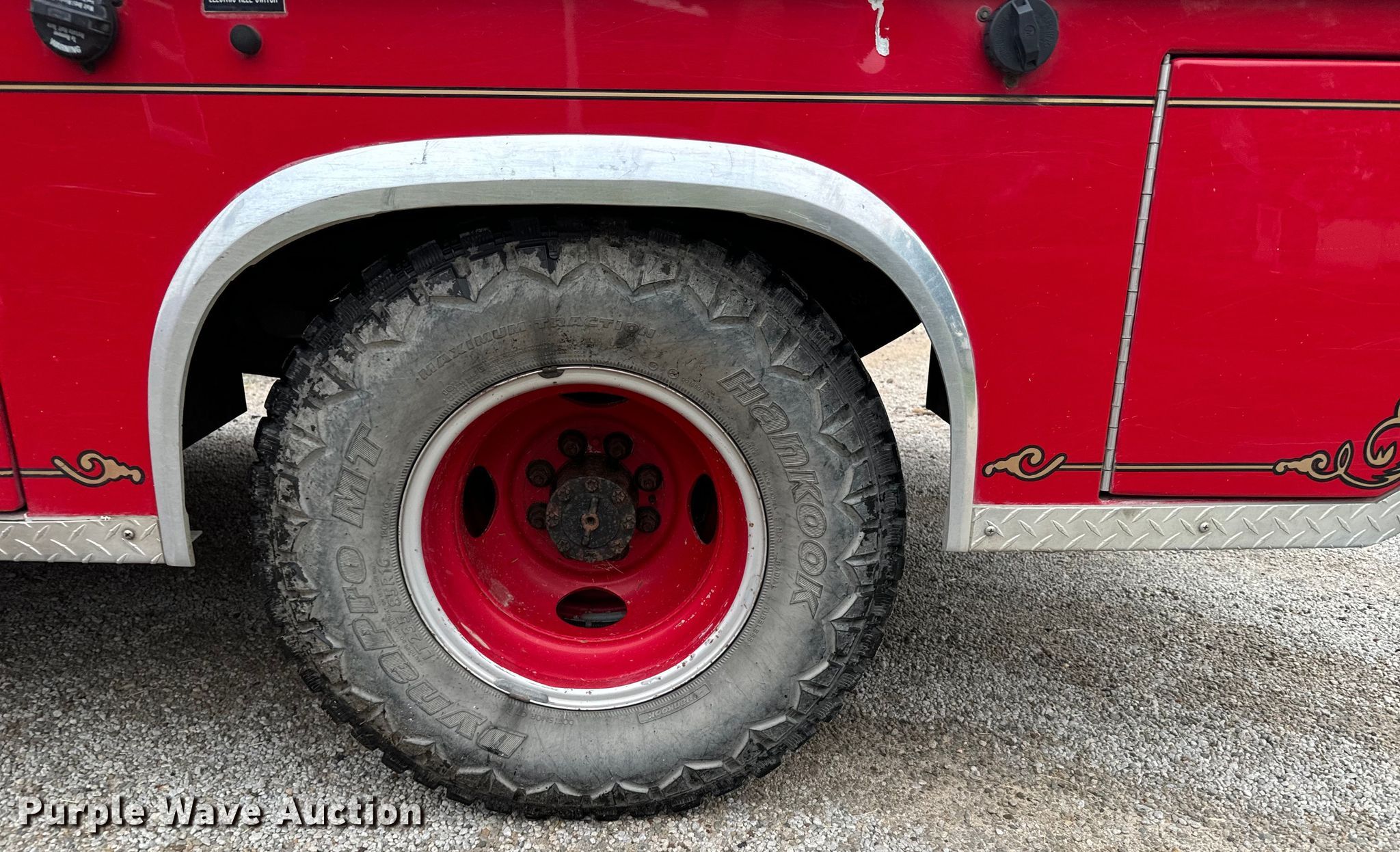1996 Ford F350 brush fire truck. Miles: 15,937 on odometer, VIN: 2FDKF38G0TCA25662. Engine Displacement: 7.5L V8 OHV, Cylinders: 8, Fuel type: Gas. Transmission Automatic. Chassis Four wheel drive, Axles: Single, Suspension: Spring, Brakes: Hydraulic, GVWR: 11,000 lbs. Interior AC, Heat. Features Fire truck body Tank Capacity: 300 gallons, Pump Vanguard gas engine Single cylinder, HP: 18, GPM: 250, PA/ siren controls. Tires Size: 235/85R16. Notes Fire extinguishers not included. Kansas title. City of Wilson. Wilson, KS 67490
