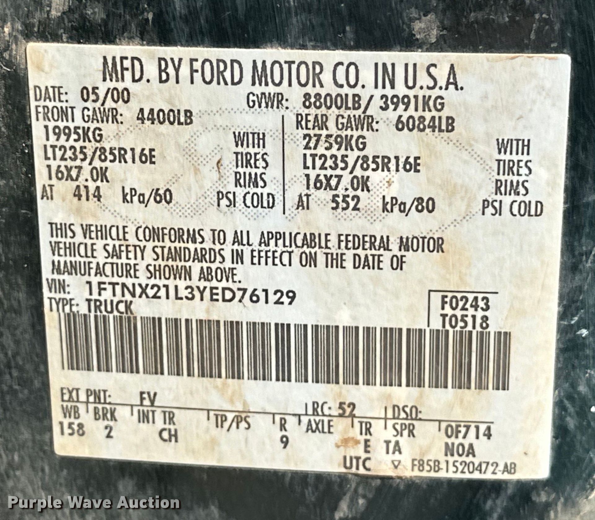 Purple Wave is selling a used 3/4 or 1 Ton Pickup or Van in Oklahoma. This item is a 2000 Ford F250 Super Duty SuperCab flatbed pickup truck with the following: Miles: 247,296 on odometer, VIN: 1FTNX21L3YED76129, Unit #: 354