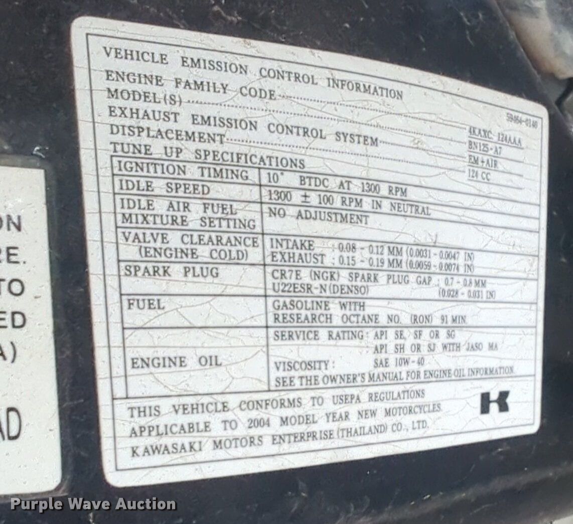 2004 Kawasaki Eliminator motorcycle. Miles: 6,848 on odometer, VIN: JKABNRA134DA09339, Sale #: 2515-KP. Engine Kawasaki BN125-A7, Displacement: 124 cc, Cylinders: 1, Fuel type: Gas. Transmission Manual. Tires Front: 90-90-17, Rear: 130-90-15. Notes No battery, Unknown operating condition. Oklahoma title. Title distribution may be delayed up to 30 days from verification of funds. Oklahoma State University. Oklahoma City, OK 73107