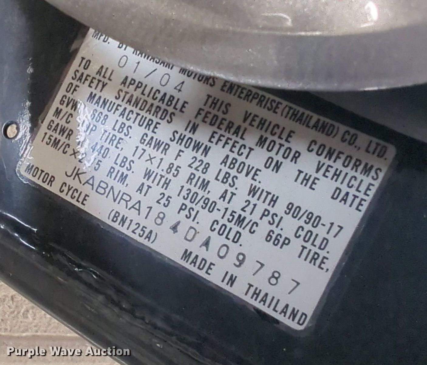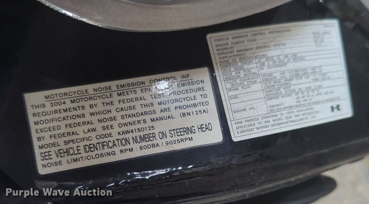 Purple Wave is selling a used Motorcycle in Oklahoma. This item is a 2004 Kawasaki Eliminator motorcycle with the following: Miles: 8,299 on odometer, VIN: JKABNRA184DA09787, Sale #: 2515-KP