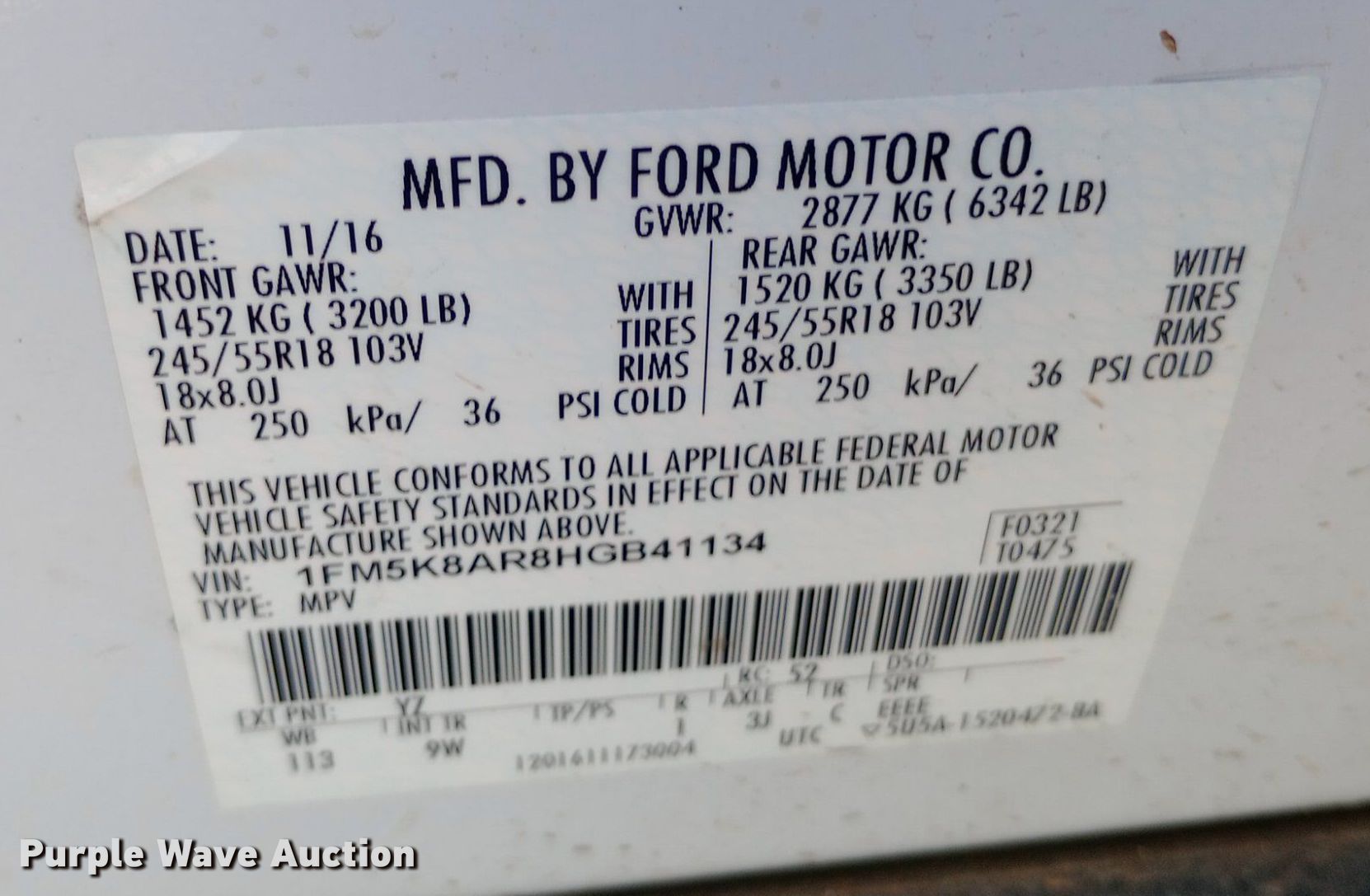 - VIN: 1FM5K8AR8HGB41134