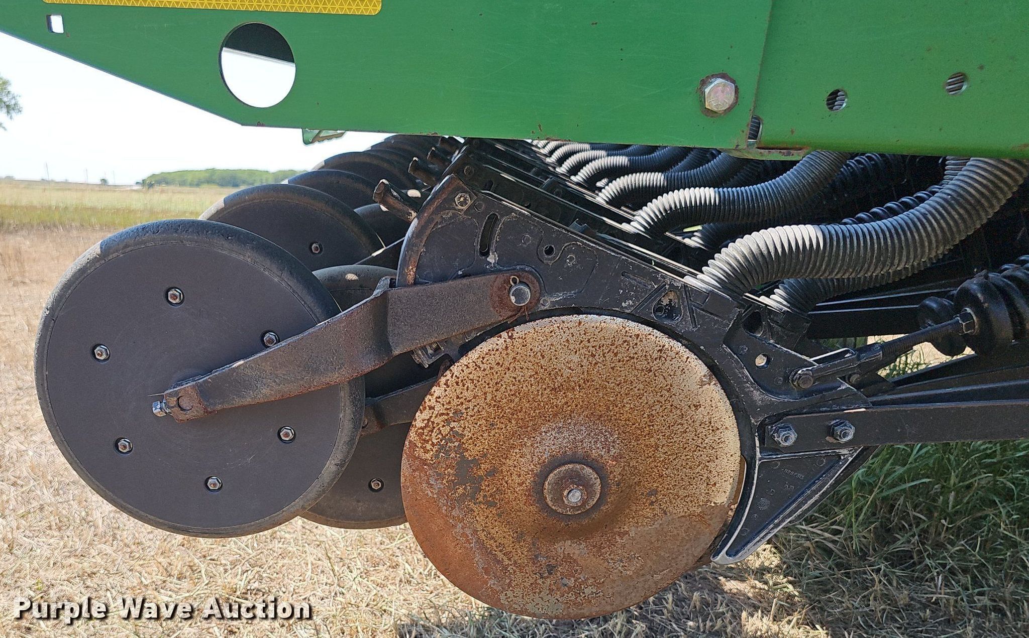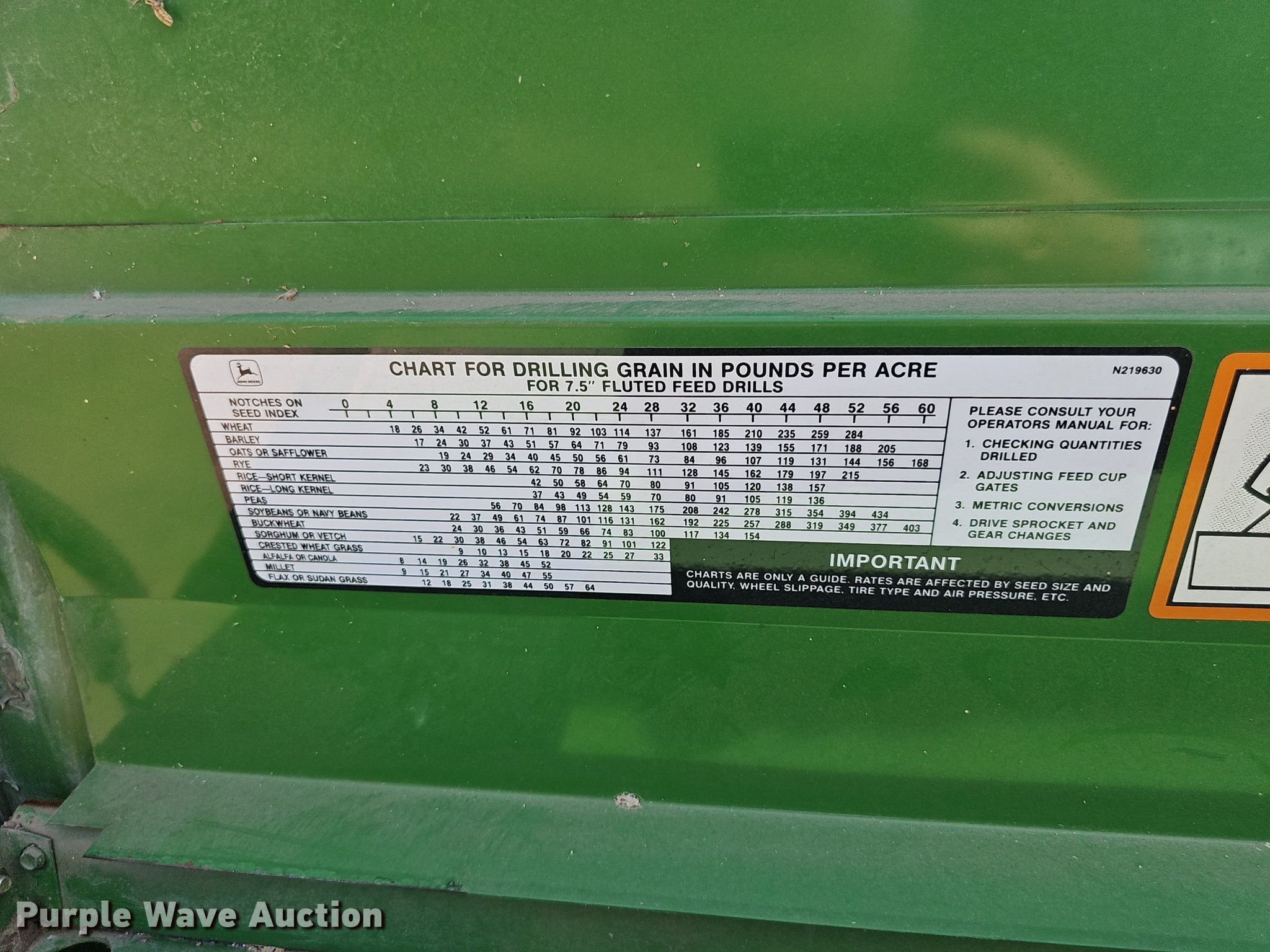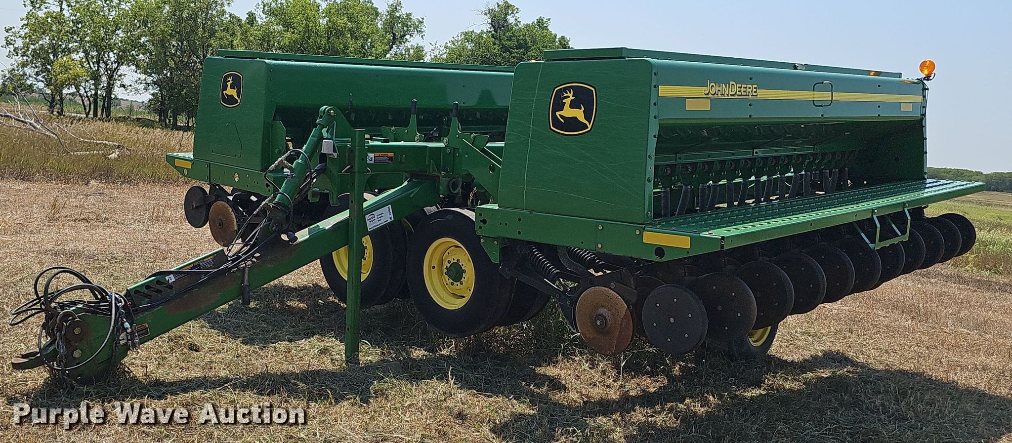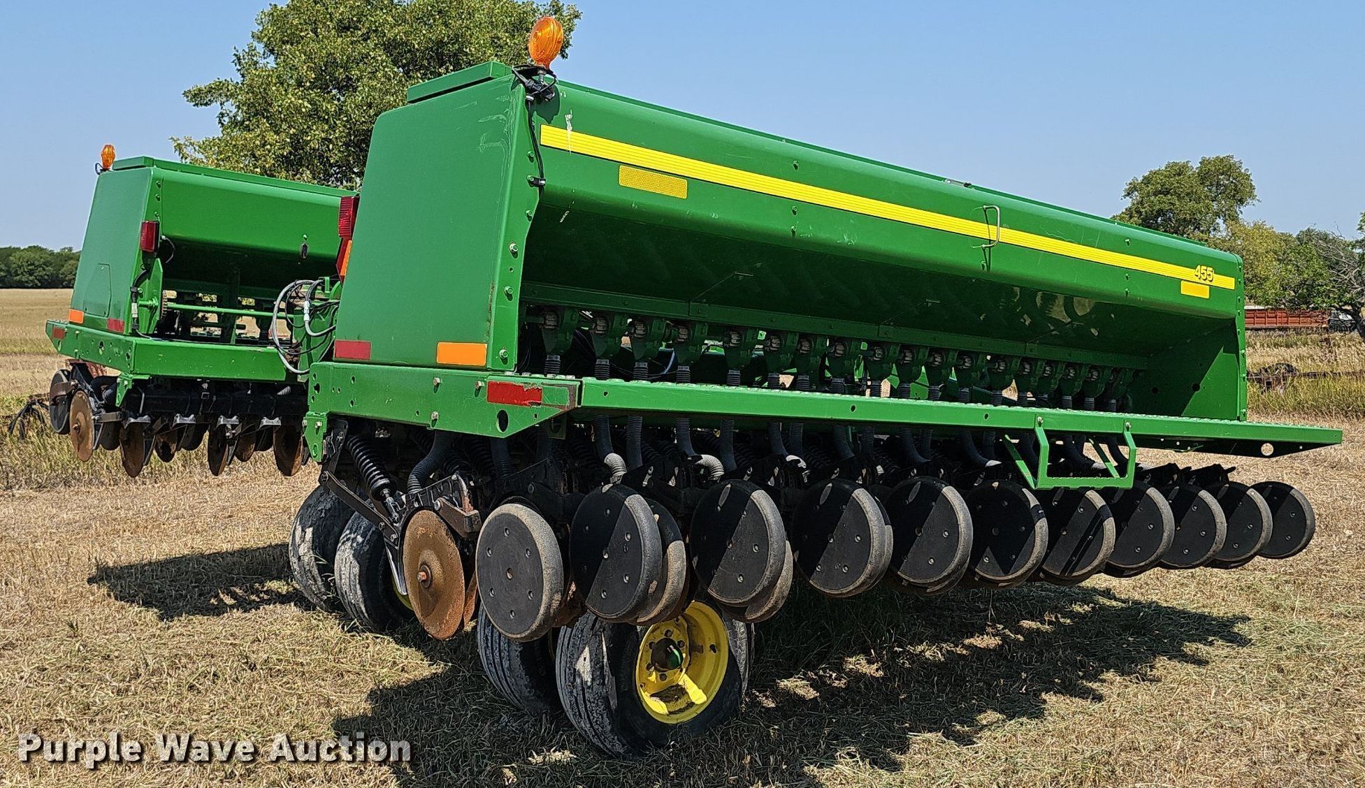 Purple Wave is selling a used Grain Drill or Seeder in Kansas. This item is a John Deere 455 grain drill with the following: Width: 24', Row units: 40, Row spacing: 7", Serial: N00455X705191