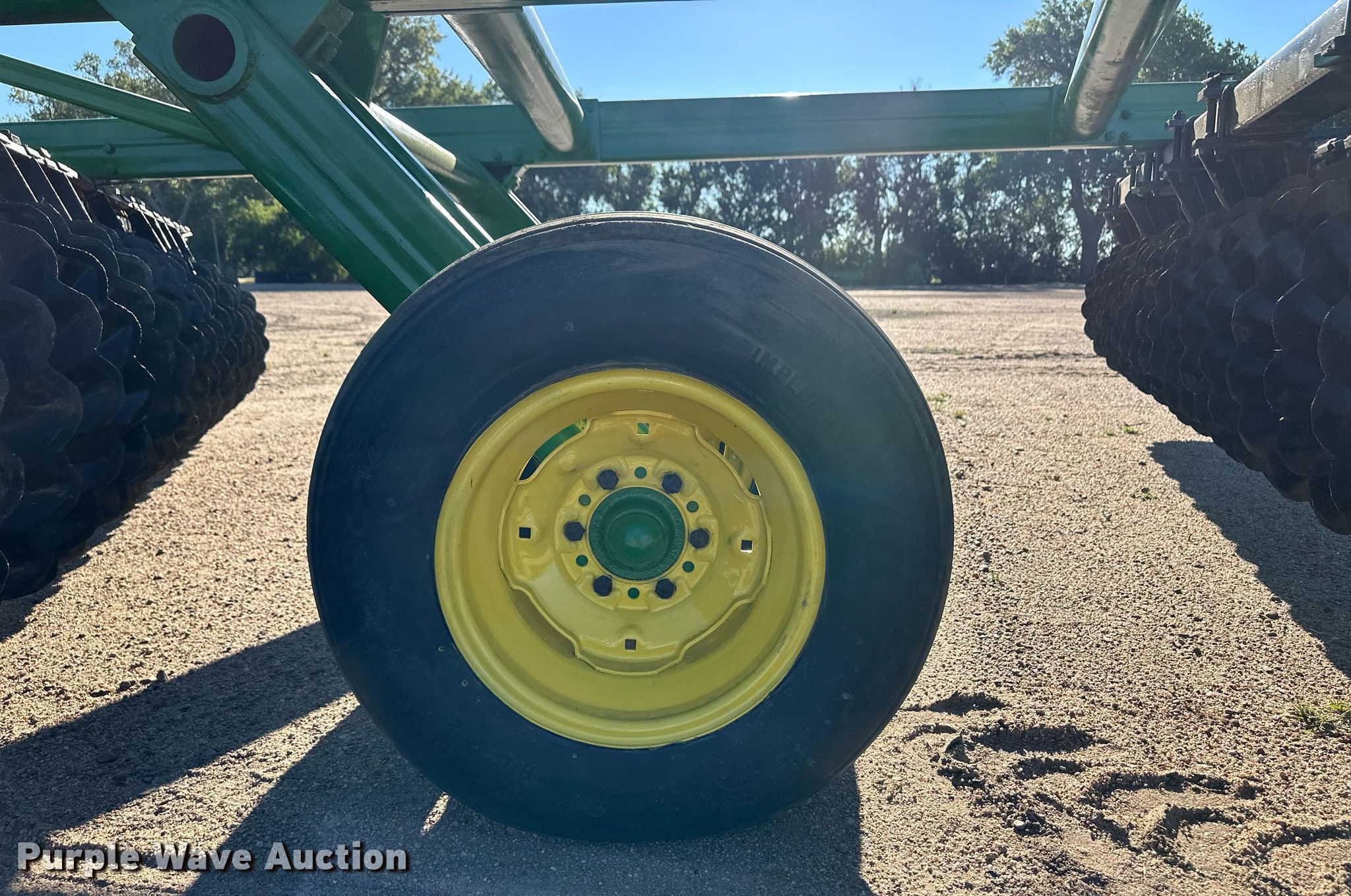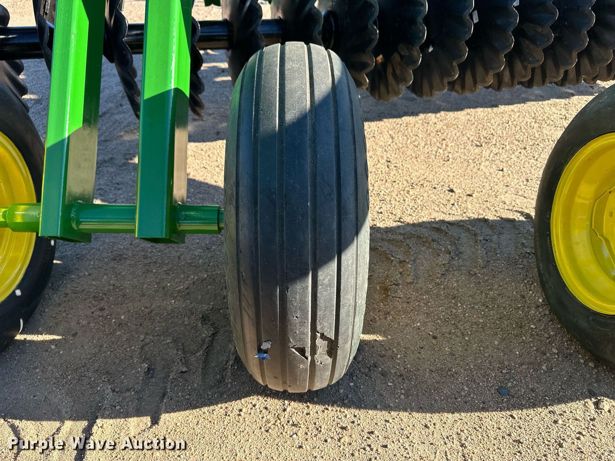 John Deere 340 off-set disk. Overall width: 13'. Features Front blades Diameter: 26", Spacing: 9", Rear blades Diameter: 26", Spacing: 9", Disk scrapers, Operation Hydraulic lift. Tires Tire size: 9.5L-15. Kinsley, KS 67547