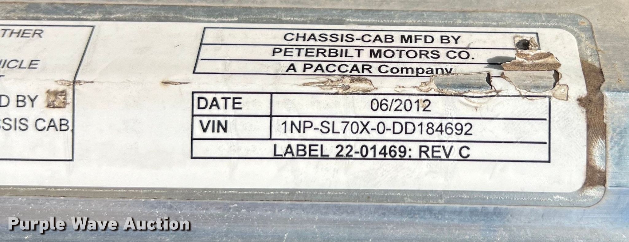 Purple Wave is selling a used Rollback or Tow Truck in Texas. This item is a 2013 Peterbilt 365 roll-off container truck with the following: Miles: 375,149 on odometer, Hours: 20,883 on meter, VIN: 1NPSL70X0DD184692, Unit #: 1576