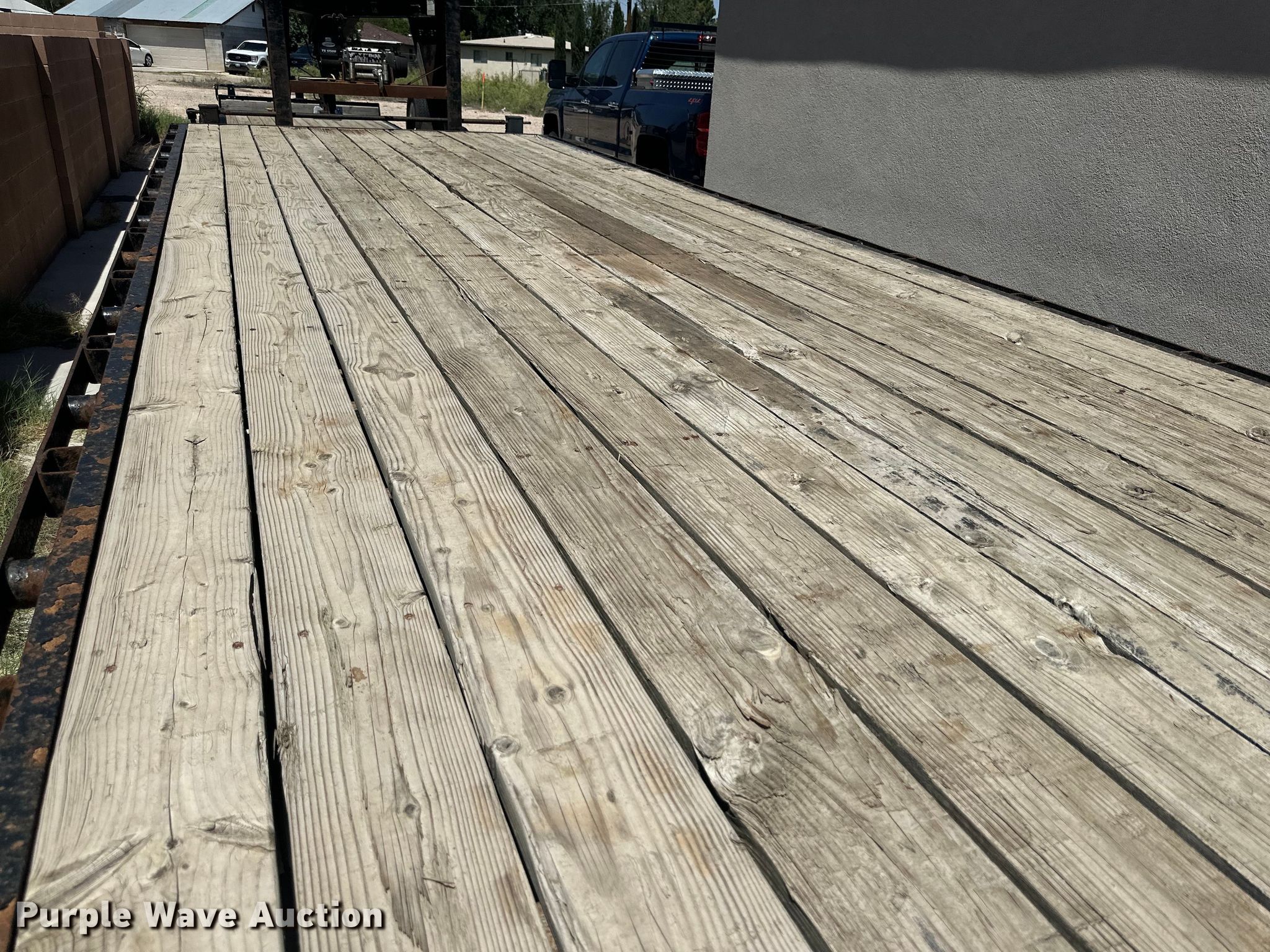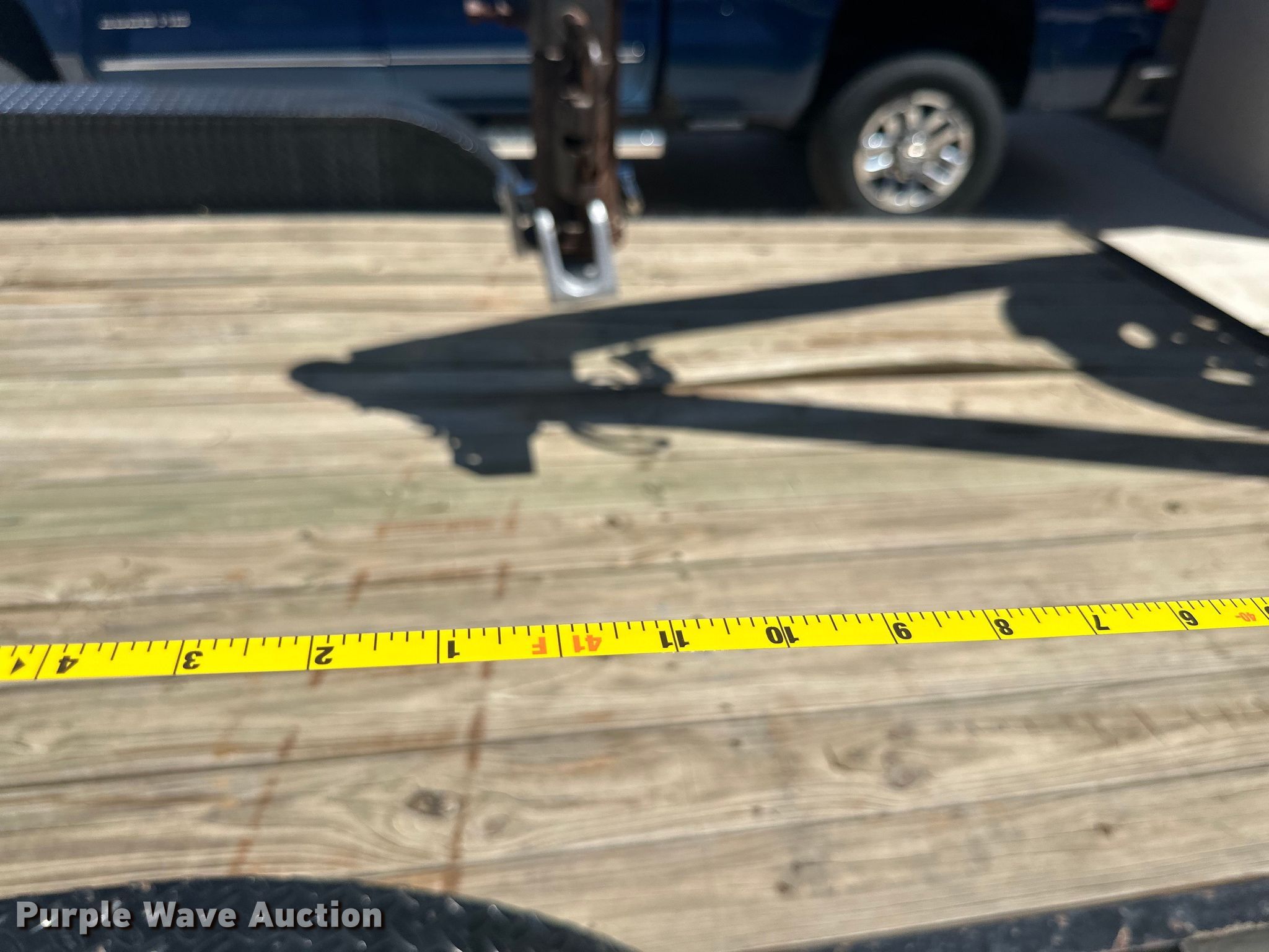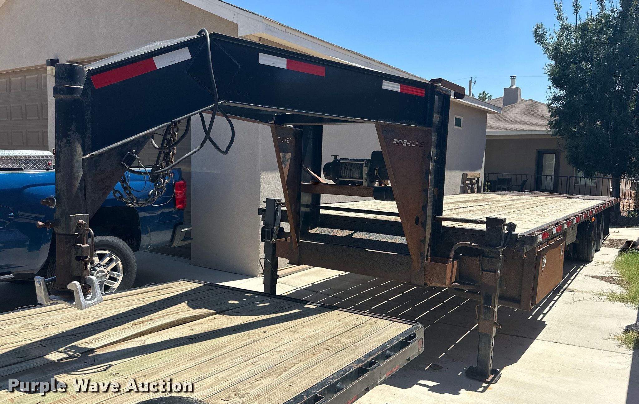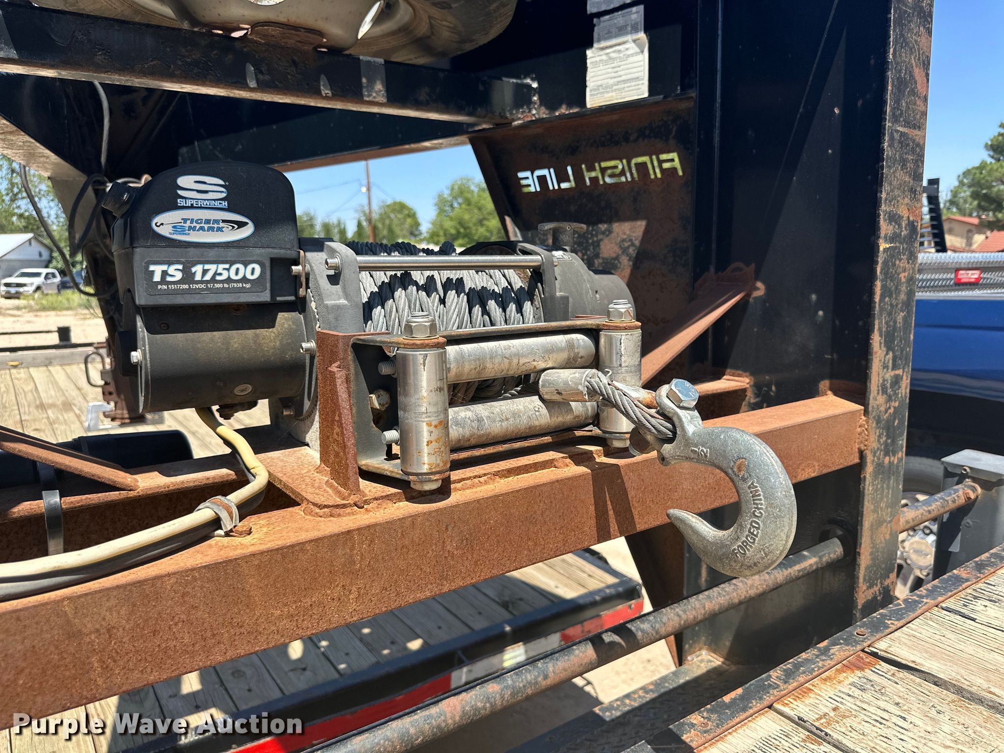 2013 Finish Line Deckover tilt deck equipment trailer. VIN: 52WGV3223DR005482. Dimensions Overall: 41' L x 102" W, Deck: 23' L x 102" W, Hydratail length: 8' 10". Features Deck type: Wood, Winch Tiger shark TS17500, Hydraulic controls: Remote control. Chassis Hitch: Gooseneck, Landing gear: Dual, Suspension: Spring, Brakes: Electric, Axles: Tandem, GVWR: 20,000 lbs, GAWR: 10,000 lbs. Tires Steel wheels, Size: 235/85R16. New Mexico title. ODell Ag Farms. Carlsbad, NM 88220