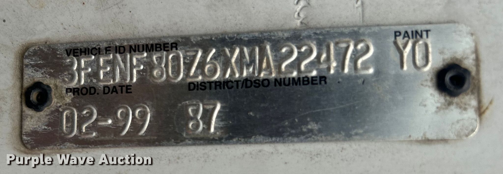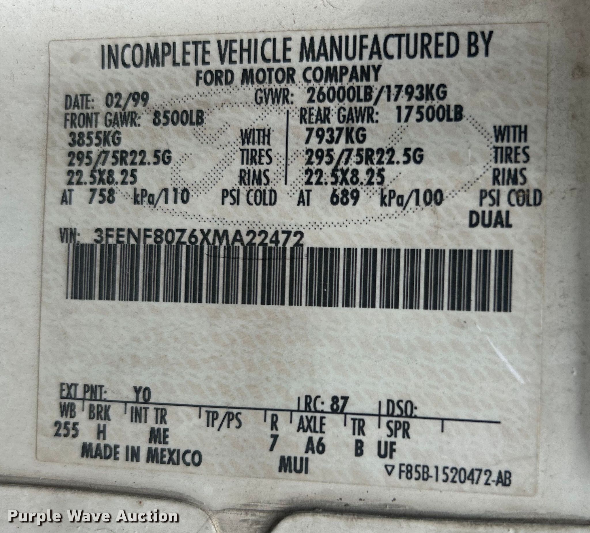 Purple Wave is selling a used Truck Chassis in Oklahoma. This item is a 1999 Ford F800 truck cab and chassis with the following: Miles: 267,831 on odometer, VIN: 3FENF80Z6XMA22472, Unit #: 106017