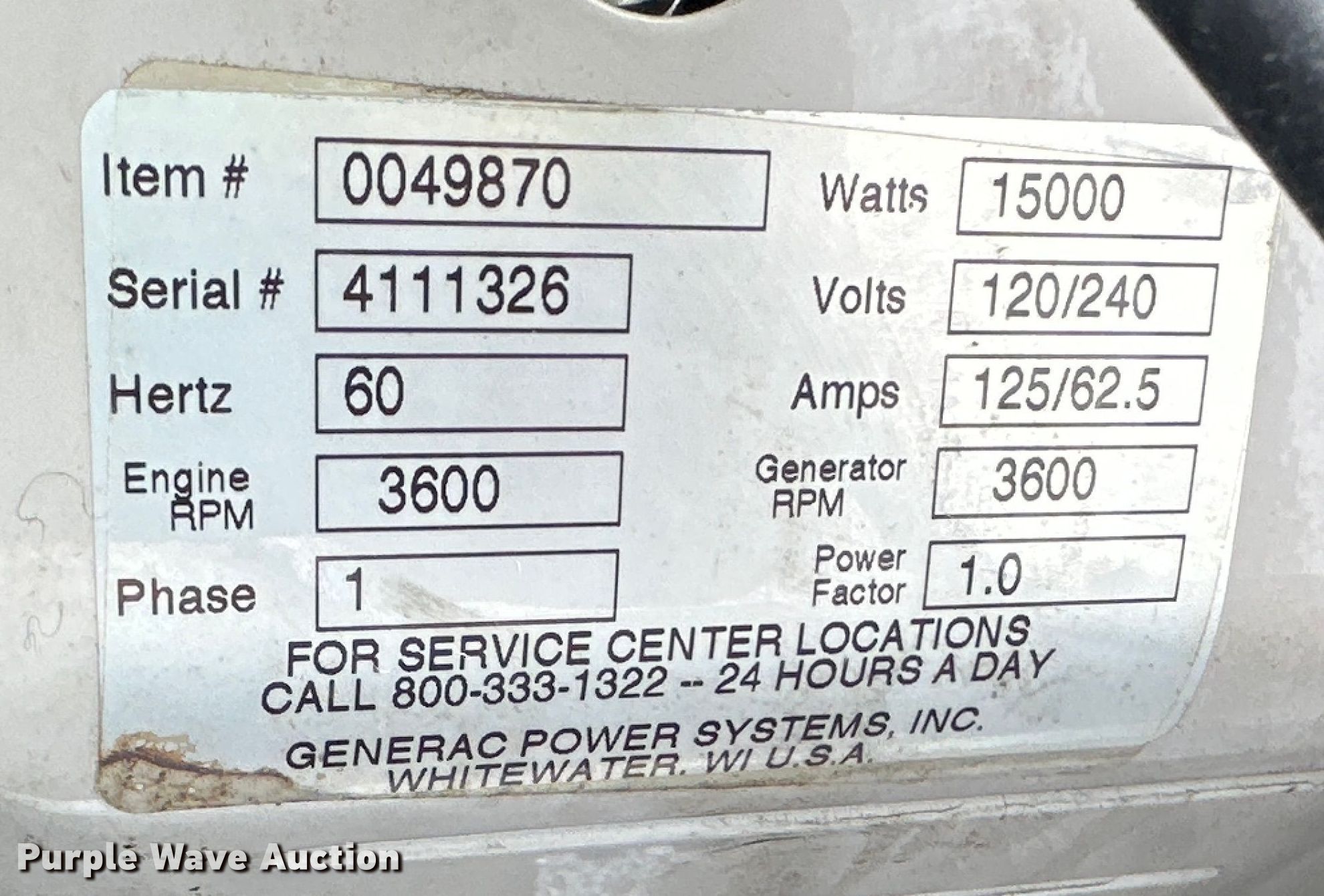 Purple Wave is selling a used Generator Set in Kansas. This item is a Centurion 15000 generator with the following: Serial: 4111326