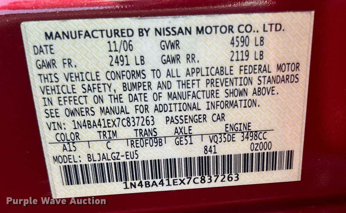 Purple Wave is selling a used Passenger Vehicle in Kansas. This item is a 2007 Nissan Maxima with the following: Miles: 112,165 on odometer, VIN: 1N4BA41EX7C837263