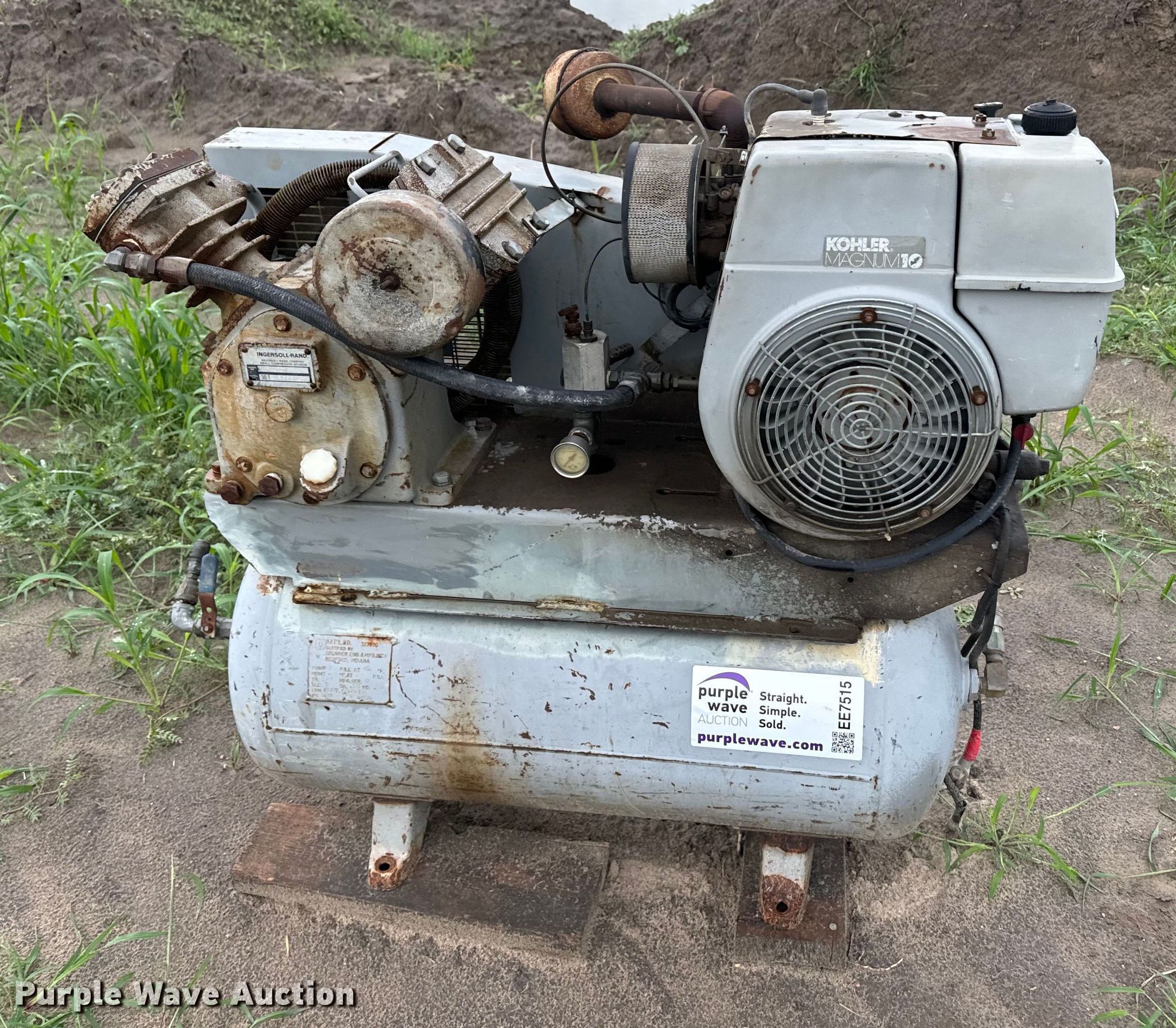 Ingersoll Rand 10FGT air compressor. Serial: 30T699614. Engine Kohler Magnum10, Cylinders: 1, Fuel type: Gas. Notes Non-operational electric start, Unknown operating condition. Scandia, KS 66966