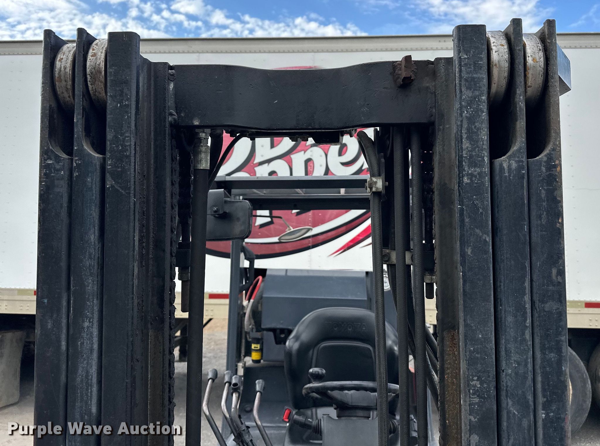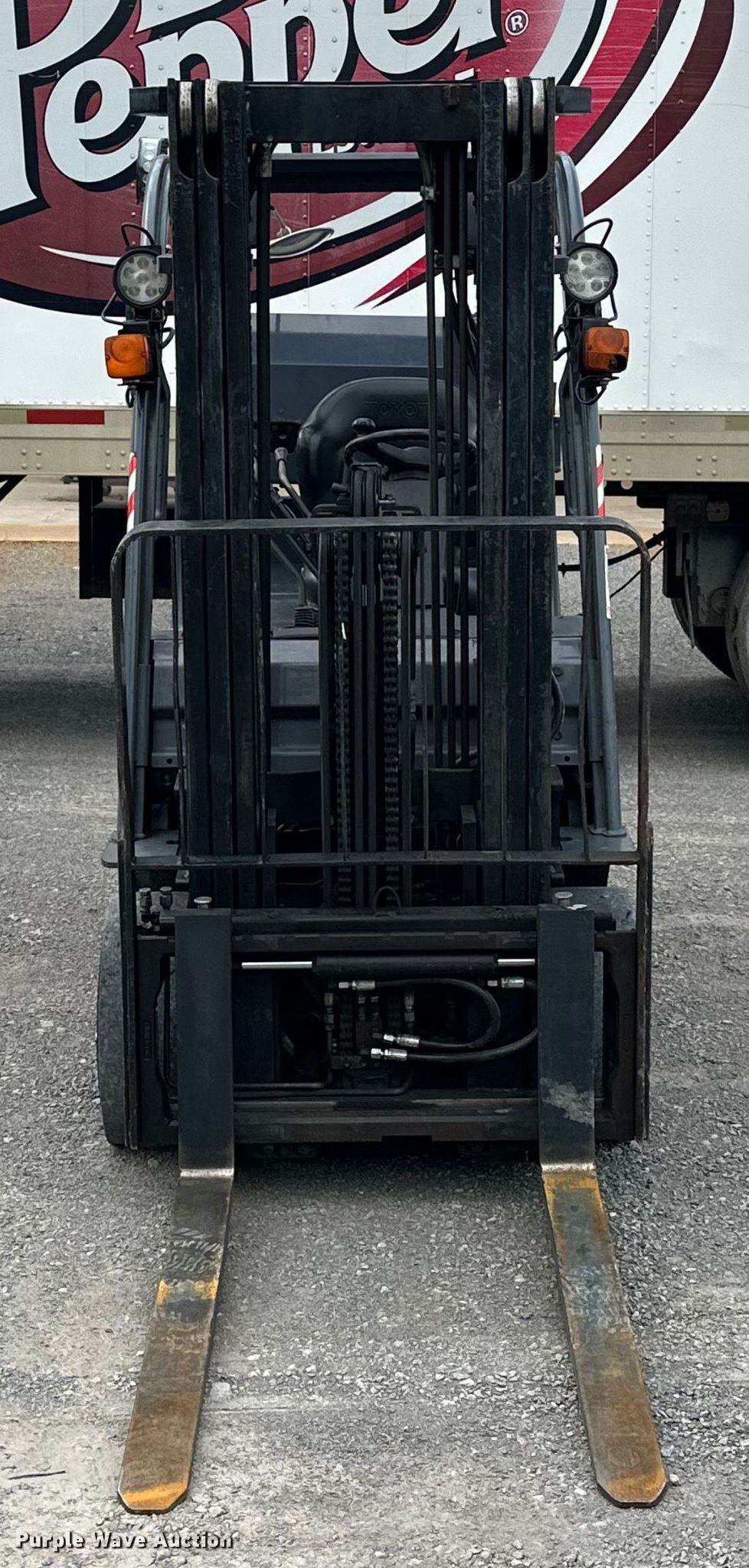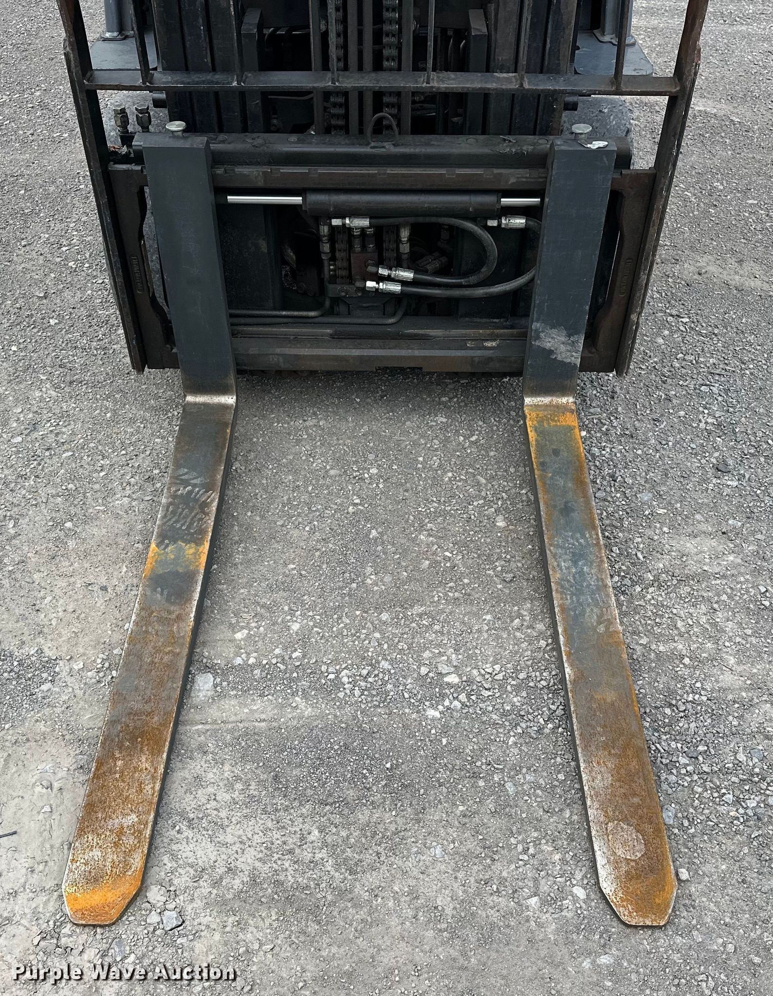 2009 Toyota 8FGCU25 forklift. Hours: 20,864 on meter, Serial: 25111. Engine Toyota, Cylinders: 4, Fuel type: Dual fuel LP bottle: Included. Transmission Powershift. Operators station OROPS, Canopy, Steering: Crab. Features Maximum lift capacity: 3,850 lbs, Maximum lift height: 189", Mast stages: 3, Side shift, Mast tilt, Fork length: 41.5". Tires Front: 21X7X15, Rear: 16X5X10.5, Solid. Love Bottling Company. Muskogee, OK 74401