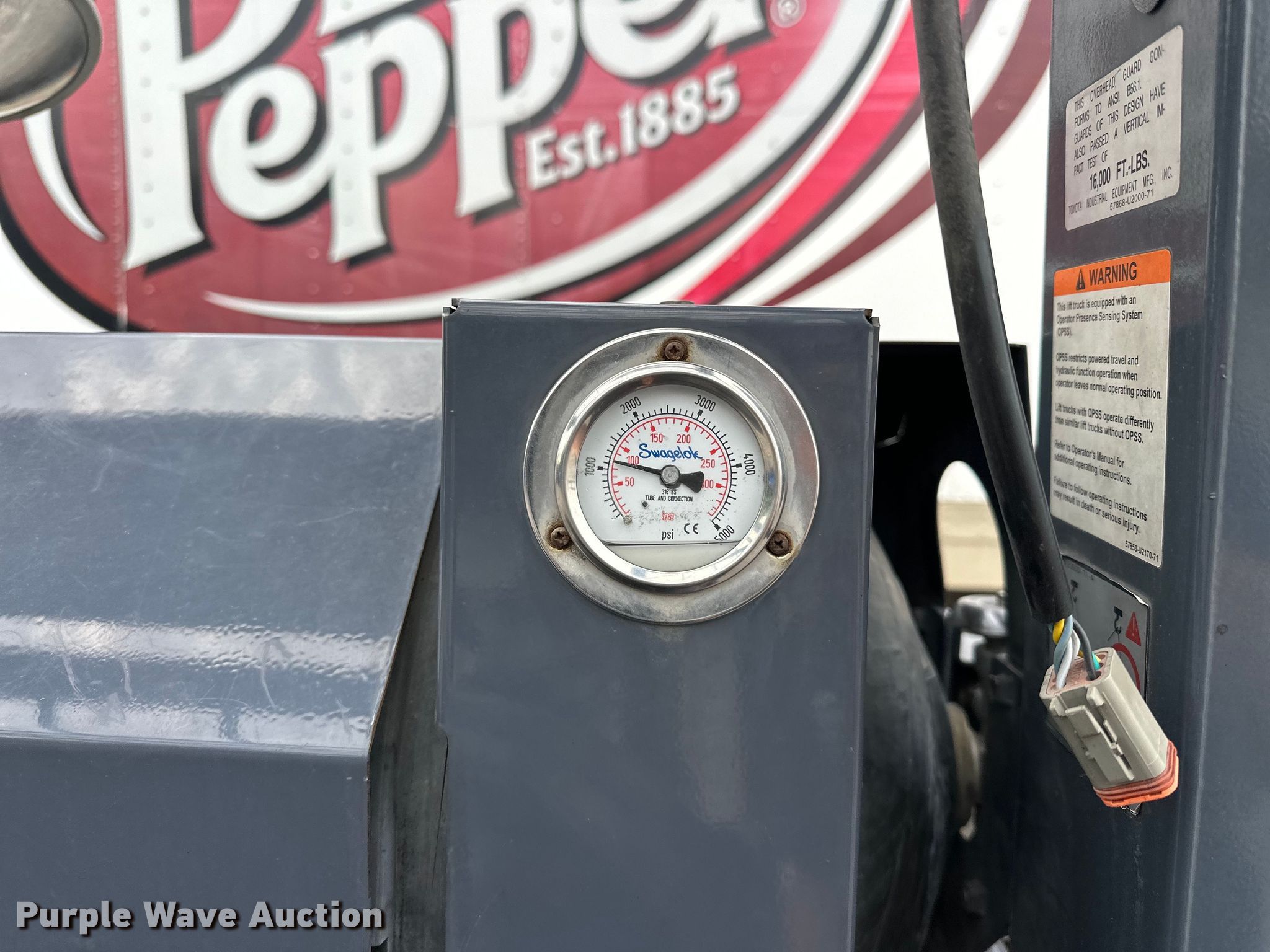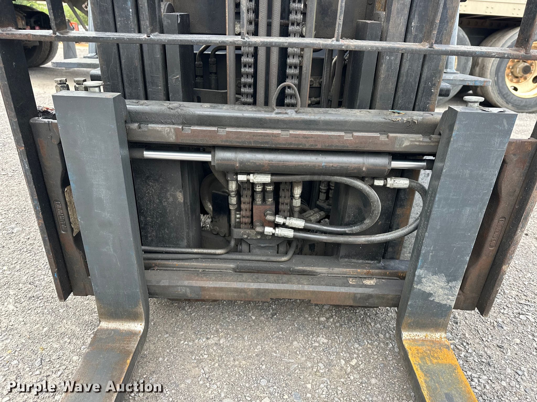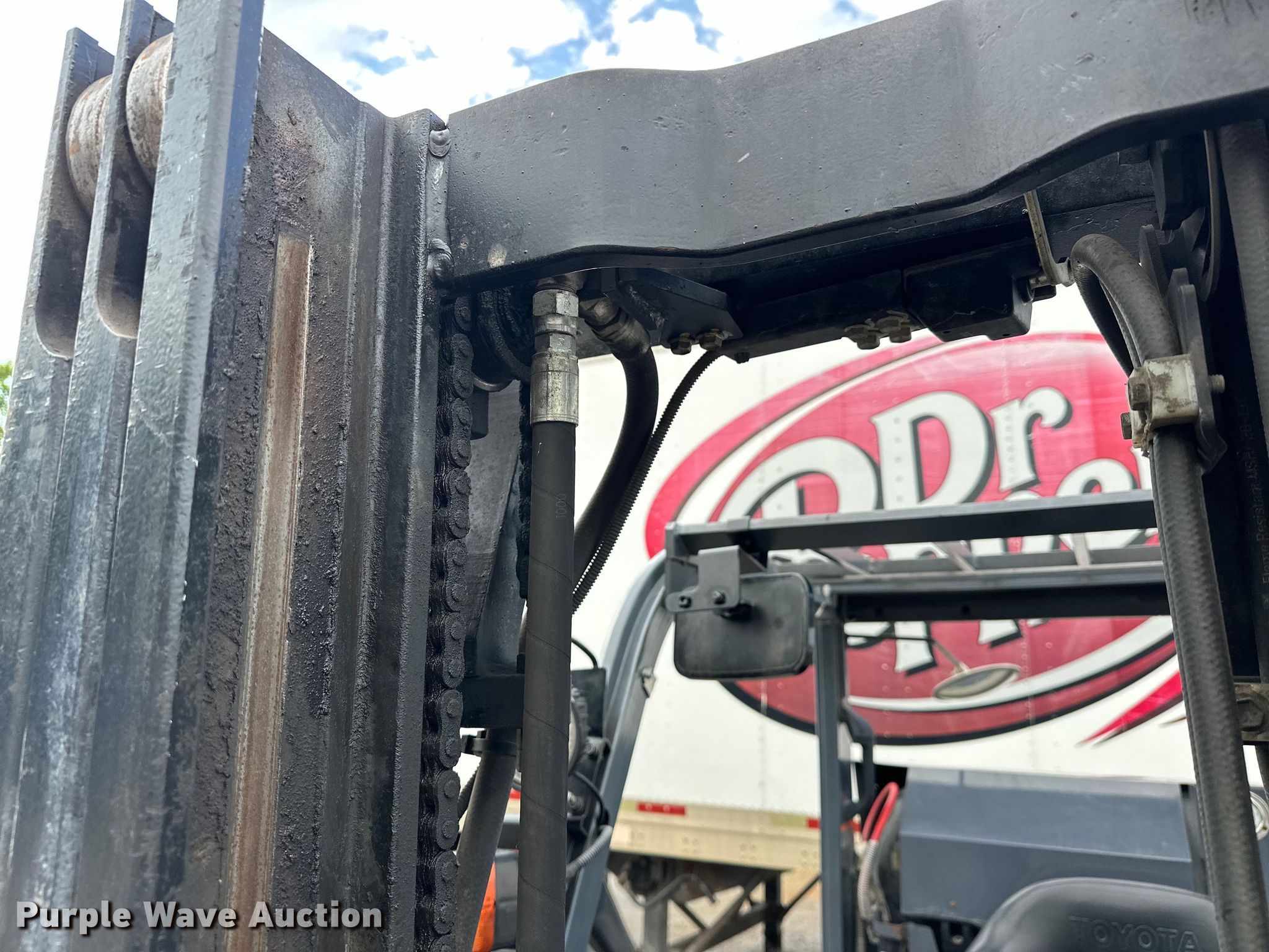 2009 Toyota 8FGCU25 forklift. Hours: 20,864 on meter, Serial: 25111. Engine Toyota, Cylinders: 4, Fuel type: Dual fuel LP bottle: Included. Transmission Powershift. Operators station OROPS, Canopy, Steering: Crab. Features Maximum lift capacity: 3,850 lbs, Maximum lift height: 189", Mast stages: 3, Side shift, Mast tilt, Fork length: 41.5". Tires Front: 21X7X15, Rear: 16X5X10.5, Solid. Love Bottling Company. Muskogee, OK 74401