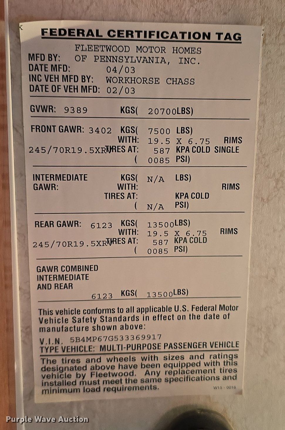 Purple Wave is selling a used RV or Camper in Nebraska. This item is a 2003 Southwind Workhorse Fleetwood RV with the following: Miles: 131,272 on odometer, Camper length: 32', VIN: 5B4MP67G533369917