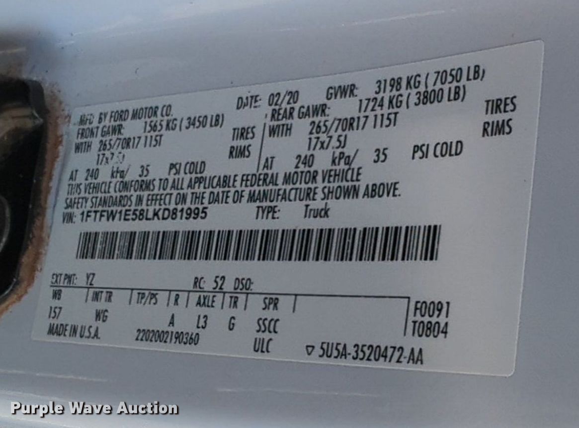 Purple Wave is selling a used 1/2 Ton Pickup or Van in Oklahoma. This item is a 2020 Ford F150 XL SuperCrew pickup truck with the following: Miles: 142,414 on odometer, VIN: 1FTFW1E58LKD81995, Unit #: 706208