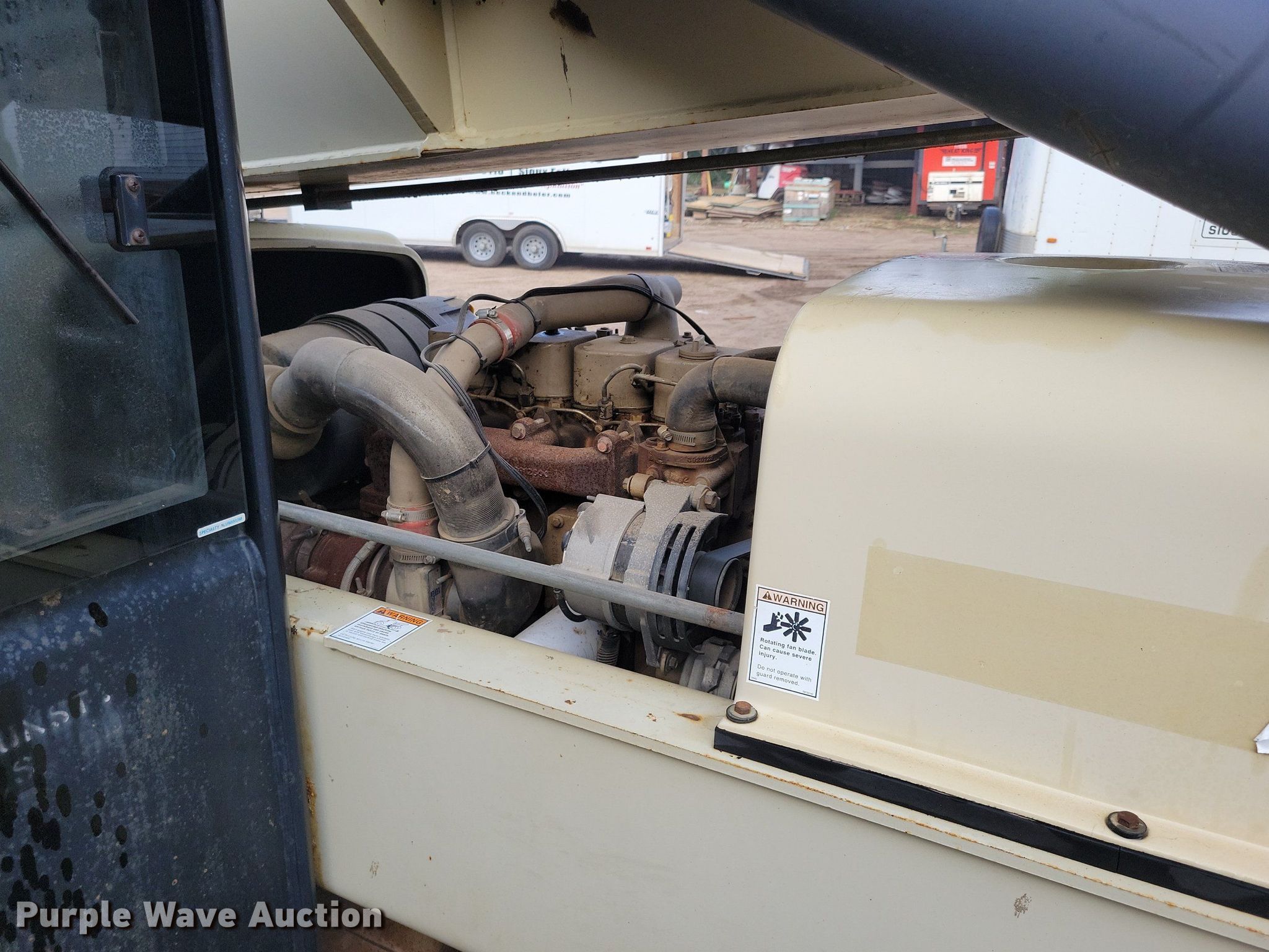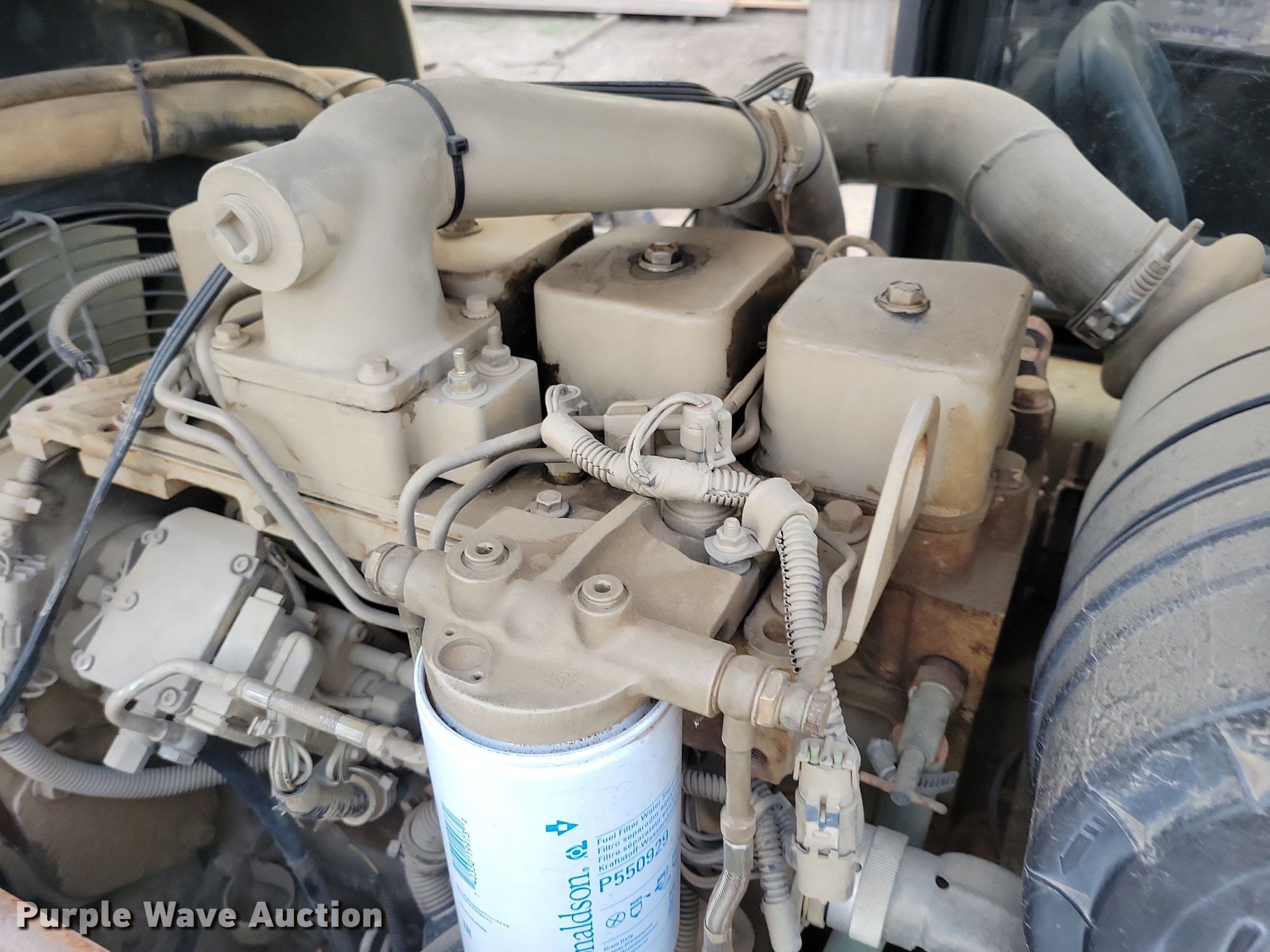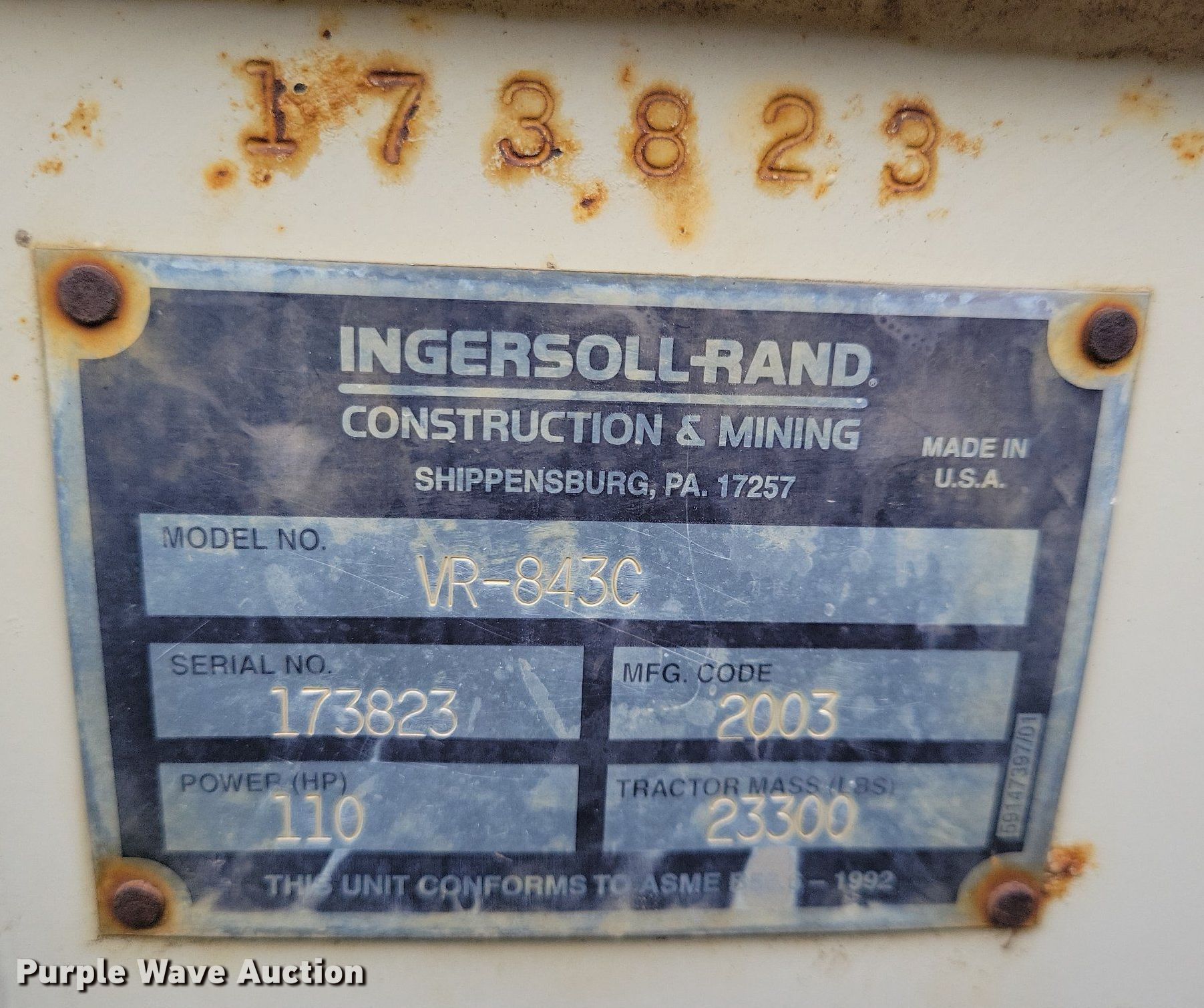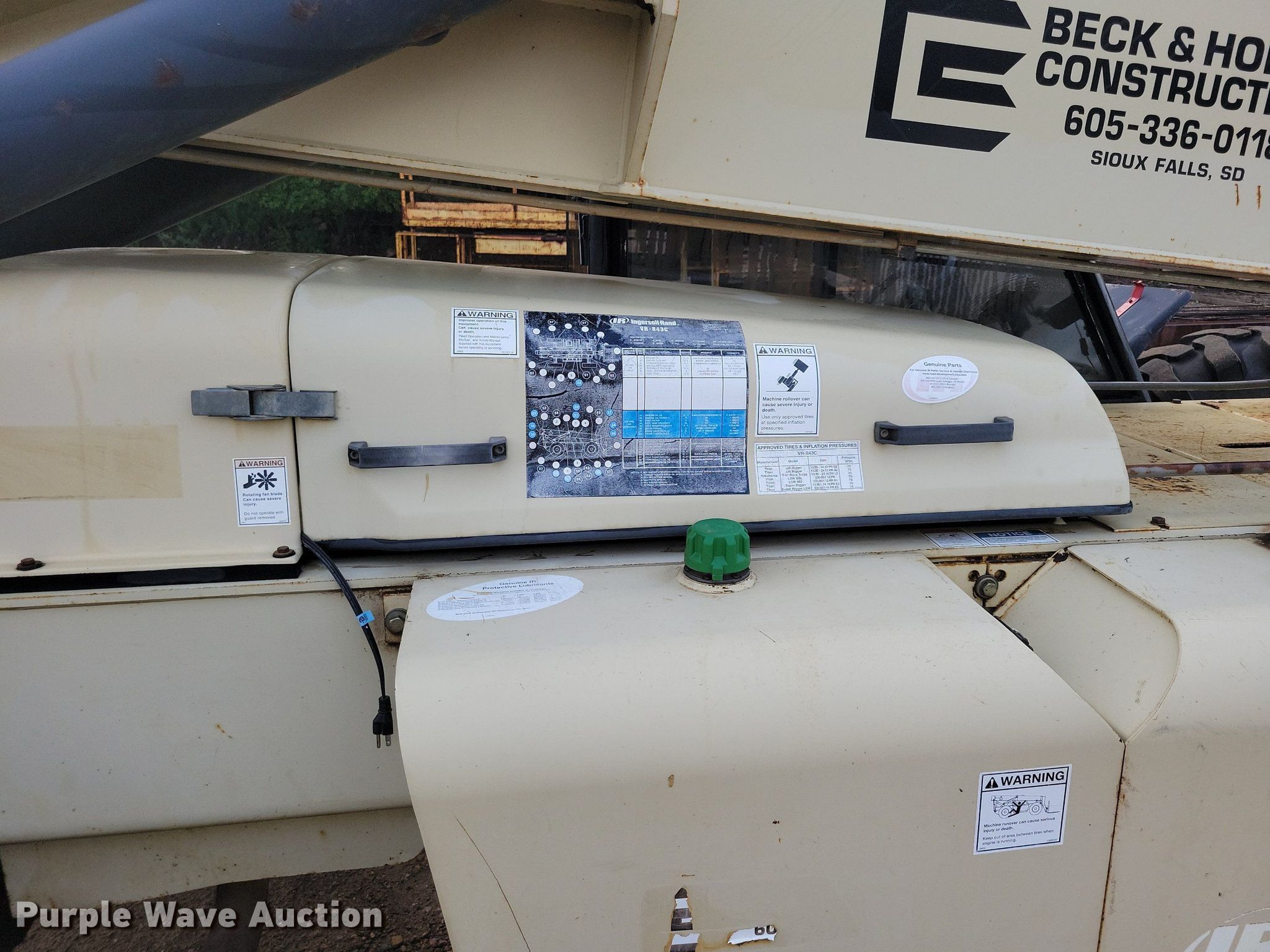 2003 Ingersoll-Rand VR-843C telehandler. Hours: 9,660 on meter, Serial: 173823. Engine Cummins QSB-110C, Serial: 46298867, Displacement: 4.5L, Cylinders: 4, Fuel type: Diesel, HP: 110. Transmission Powershift, 3F - 3R, Four wheel drive. Operators station Enclosed cab, Steering: Crab, Four wheel. Features Maximum lift capacity: 8,000 lbs, Maximum lift height: 43', Boom stages: 3, Fork length: 48", Hydraulic outriggers, Hydraulic leveling, Quick attach: Manual. Tires Size: 13-24TG. Notes Possible wheel hub issue. Beck & Hofer Construction. Sioux Falls, SD 57104