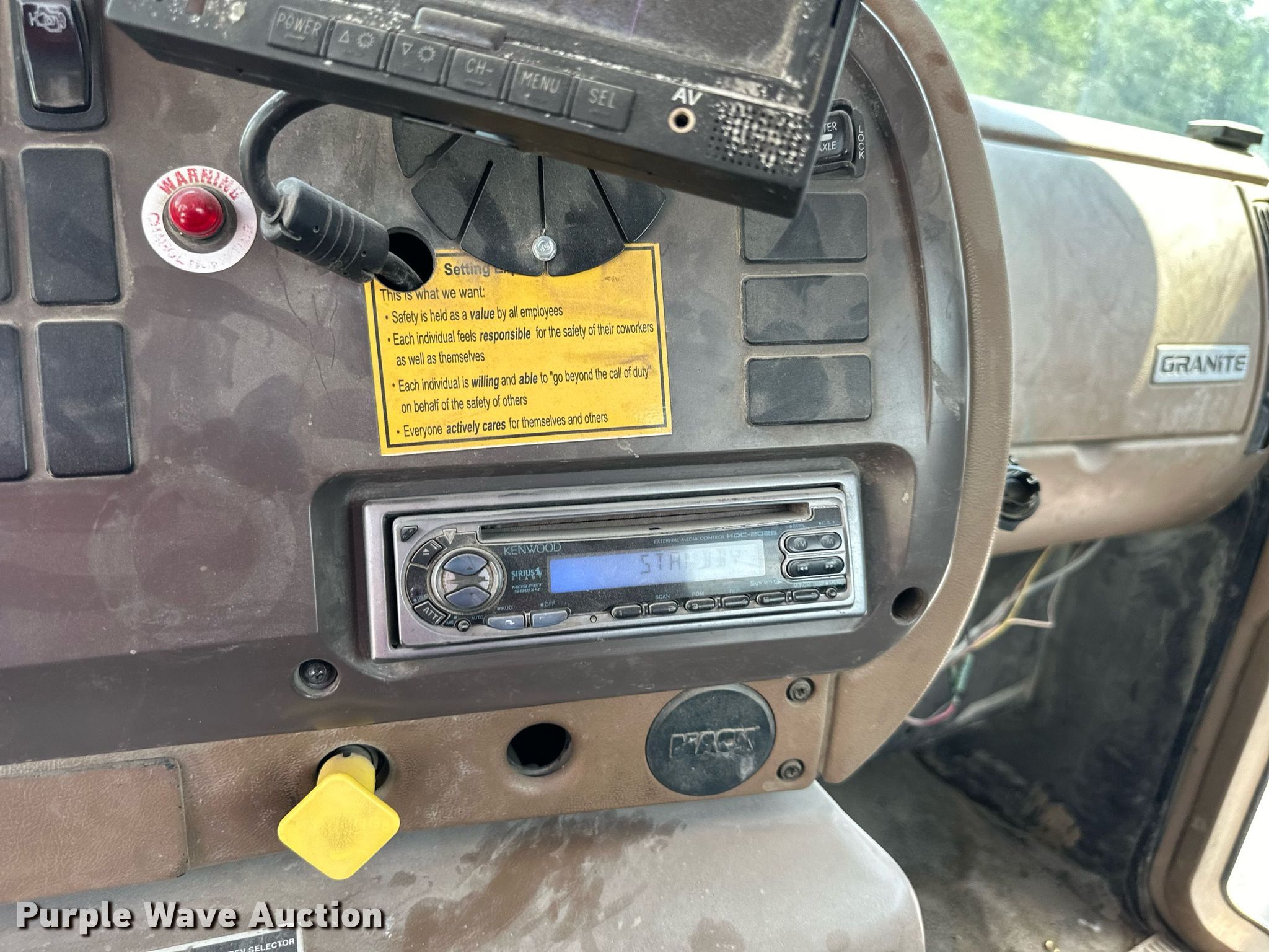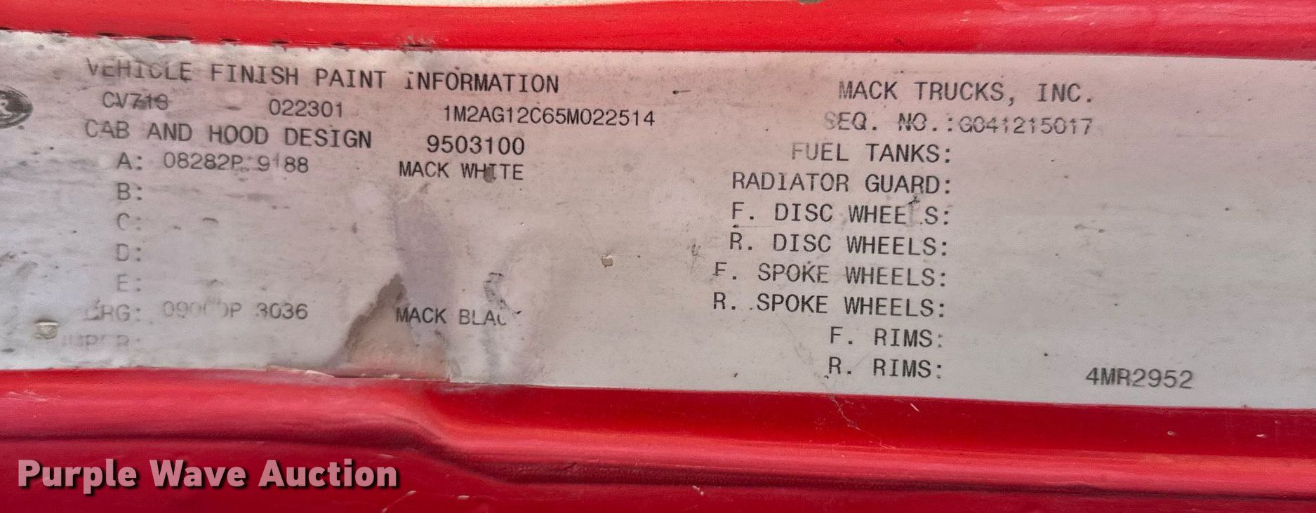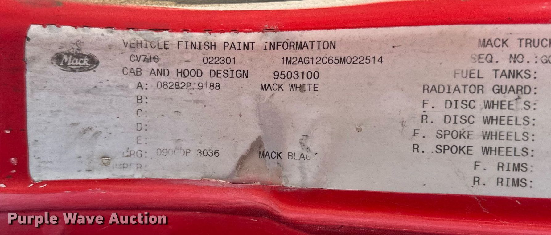 2005 Mack CV713 ready mix truck. Miles: Unknown, VIN: 1M2AG12C65M022514. Engine Mack, Displacement: 12.0L, Cylinders: 6, Fuel type: Diesel. Transmission Mack Maxitorque ES, Manual, Speed: 9. Chassis Axles: Tandem, Tag axle Steerable, Differential lock: Inter-axle, Suspension: Spring, Brakes: Air, PTO. Interior AC, Heat, Heated mirrors. Features Mixer Kimble K2000, Discharge: Rear, In-cab controls, Rear drum controls, Chute Chute type: Steel.. Tires Front: 425/65R22.5, Rear: 11R22.5, Lift axle: 235/70R22.5. Notes Possible instrument cluster issues, Dead battery. Missouri title. Mileage has not been verified. Exempt will be written in the odometer disclosure on the title. Builders Choice Concrete. Saint Joseph, MO 64503