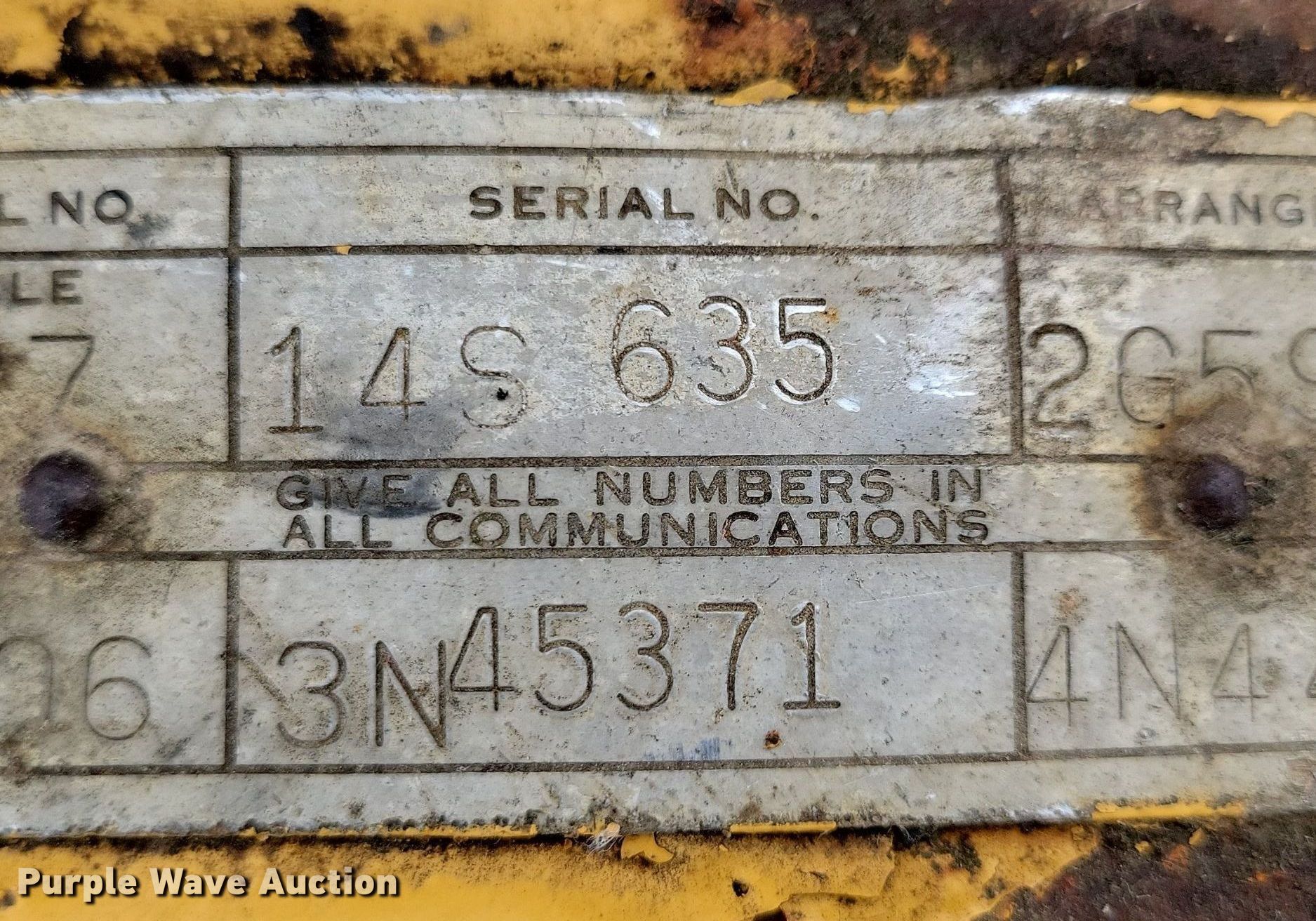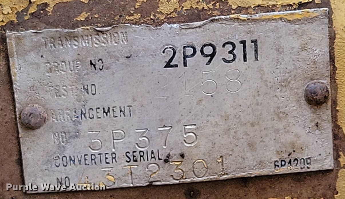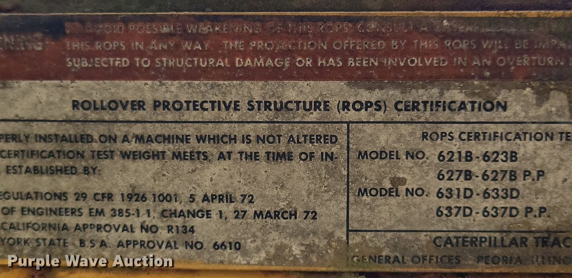 1976 Caterpillar 627B conventional scraper. Hours: 5,530 on meter, Serial: 14S635, Unit #: 102. Engine Caterpillar, Cylinders: 6, Fuel type: Diesel. Second engine Caterpillar, Cylinders: 6, Fuel type: Diesel. Transmission Powershift, 8F - 1R. Chassis Brakes: Air. Operators station OROPS. Features Cushion hitch, Hydraulic lift, Scraper controls: Lever controls No. of controls: 3, Rear push block. Tires Size: 33.25-29, Brand: Firestone. McCleary Excavating Co Inc. Blue Grass, IA 52726