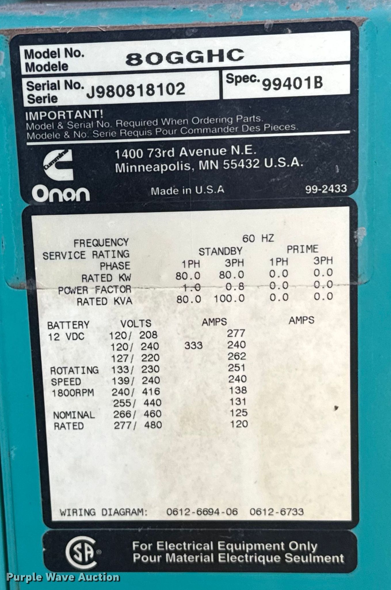 Purple Wave is selling a used Generator Set in Kansas. This item is a Onan 80GGHC generator with the following: Hours: 721 on meter, Serial: J980818102