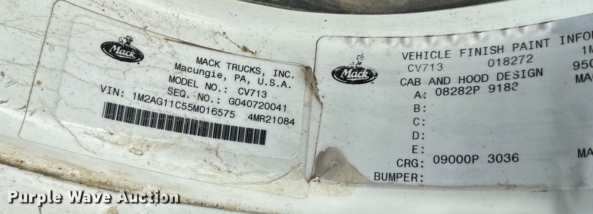 Purple Wave is selling a used Construction Dump Truck in Kansas. This item is a 2005 Mack CV713 dump truck with the following: Miles: 536,060 on odometer, VIN: 1M2AG11C55M016575