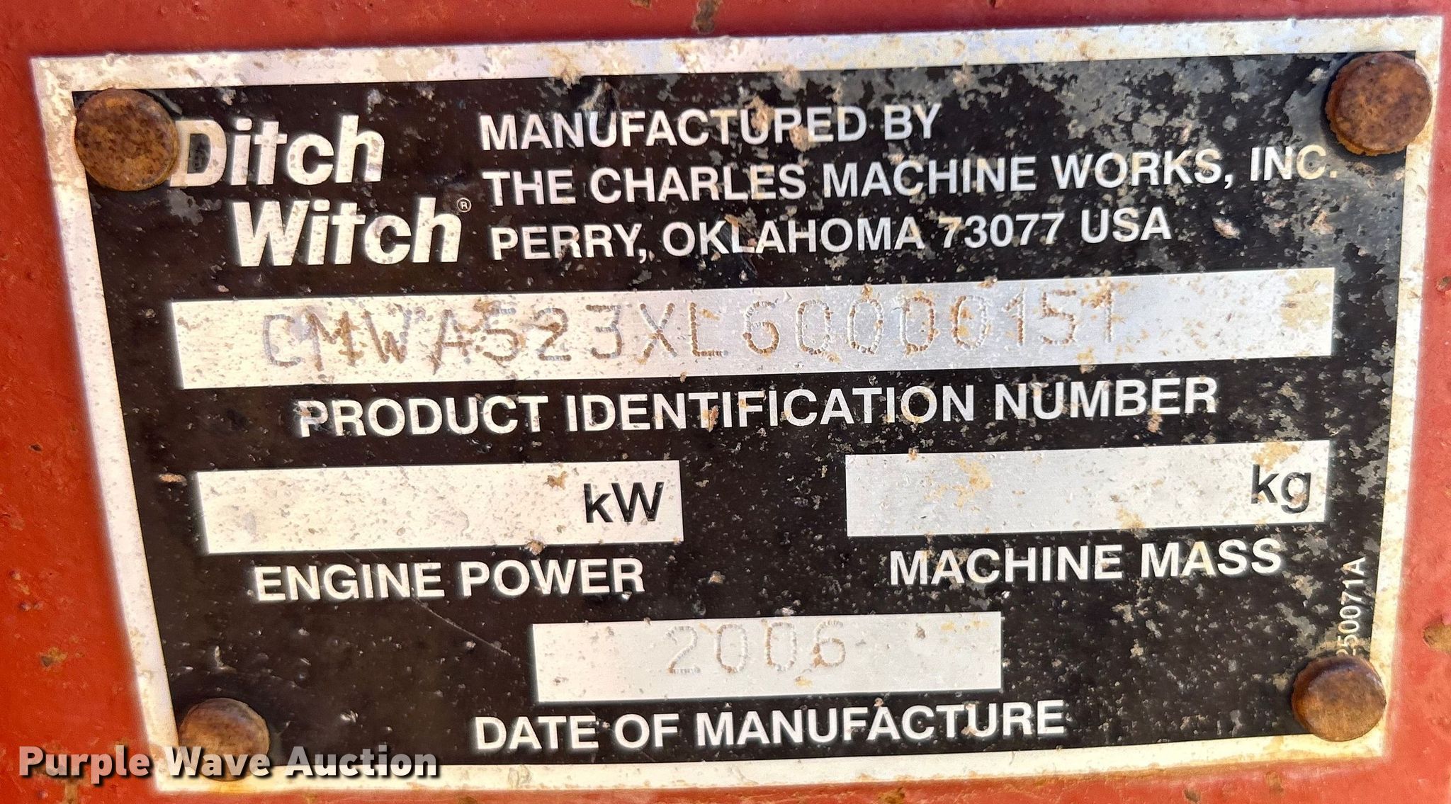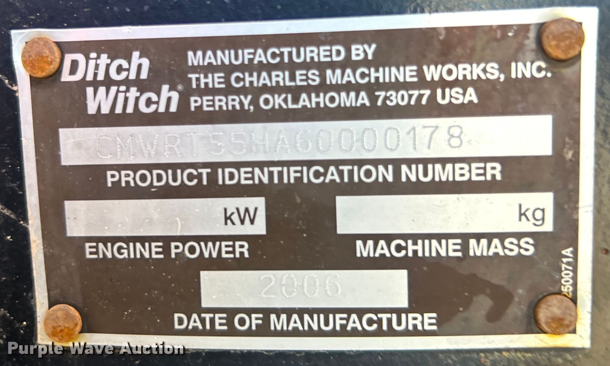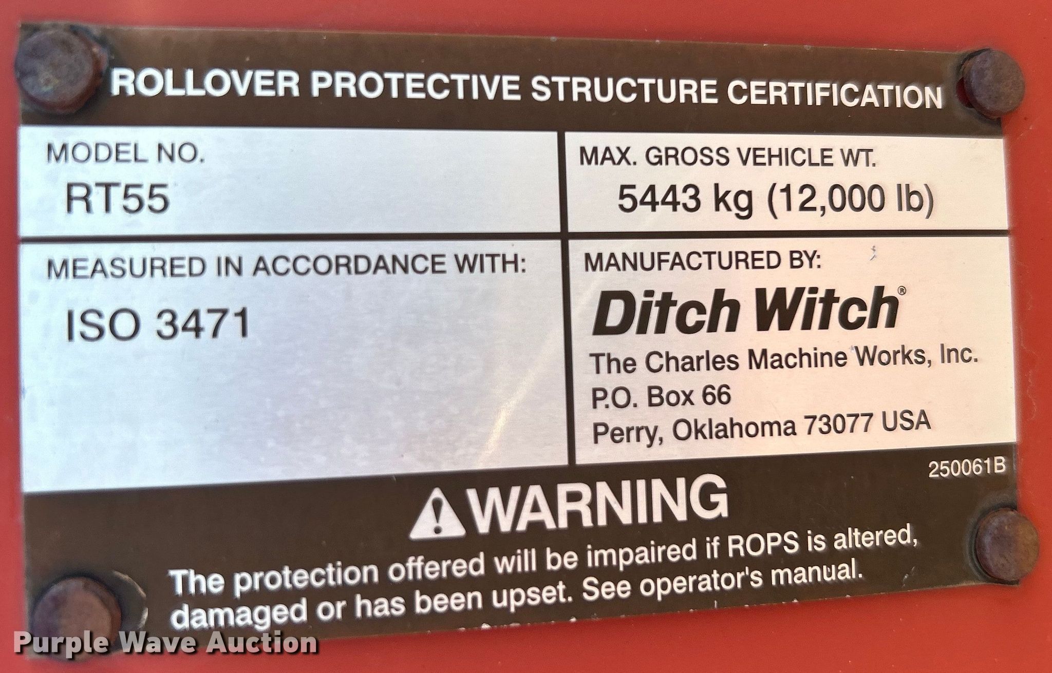 Purple Wave is selling a used Trencher or Rock Saw in Oklahoma. This item is a 2006 Ditch Witch RT55 trencher with the following: Hours: 1,344 on meter, Serial: CMWRT55HA60000178