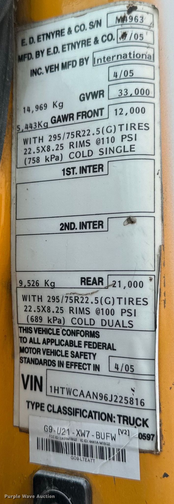 2006 International 7400 oil distributor truck. Miles: 108,796 on odometer, Hours: 12,479 on meter, VIN: 1HTWCAAN96J225816. Engine International DT466, Displacement: 7.6L, Cylinders: 6, Fuel type: Diesel, HP: 225. Transmission Allison, Automatic. Chassis Axles: Single, Suspension: Spring, Brakes: Air, PTO, GVWR: 33,000 lbs, Wheelbase: 188". Interior AC, Heat. Features Bed / tank Capacity: 2,000 gallons, 17' 4" L x 7' 7" W, Burner: LPG, In-cab controls, Spray wand, Spray boom Folding, Side shift, Nozzles: 42.. Tires Size: 11R22.5. Notes Dash warning indicator: ABS. Wisconsin title. Title has a lien that will be released following the close of the auction. Title distribution may be delayed up to 30 days from verification of funds. whisler farms. Genoa, WI 54632