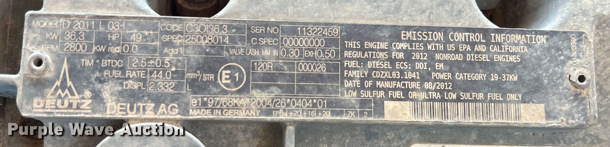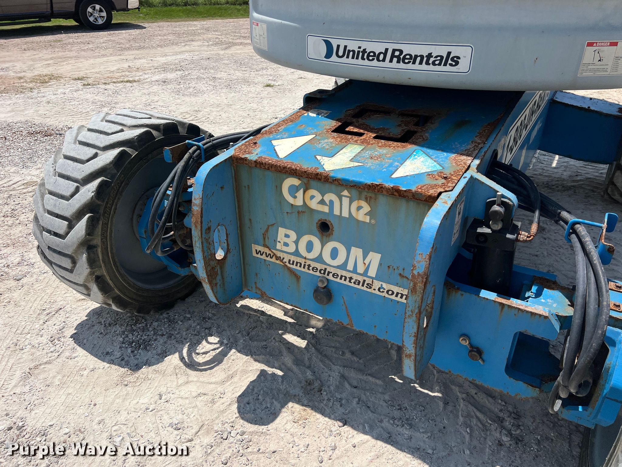 2013 Genie Z-60/34 boom lift. Hours: 3,107 on meter, Serial: Z6013-12114, Unit #: 10110874. Engine Deutz, Cylinders: 3, Fuel type: Diesel. Chassis Four wheel drive. Features Rough terrain, Boom type: Articulating, Telescopic, Maximum lift capacity: 500 lbs, Maximum reach length: 36' 3", Maximum lift height: 60' 4", Platform: 96" L x 36" W, AC power outlet, Controls: Platform, Ground, Platform rotation: Hydraulic. Tires Tire size: 355/55D625, Foam filled. Notes Non-operational line guide, damaged, Non-operational left and center basket joysticks. Plunkett Enterprises. Angleton, TX 77515