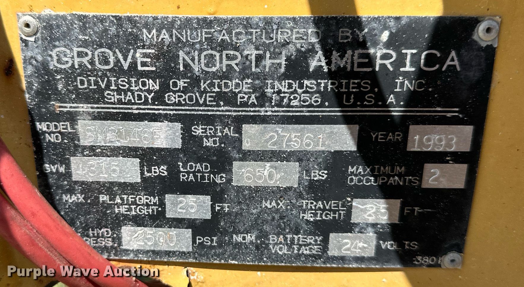 1993 Grove SM3146E scissor lift. Serial: 27561. Electric Motor Volts: 24. Features Maximum lift capacity: 650 lbs, Maximum lift height: 25', Platform: 92" L x 38" W, Controls: Platform, Platform extensions: Manual, On board charger. Tires Tire size: 4.00x8x3.75, Solid. Notes Unknown operating condition. McLouth, KS 66054