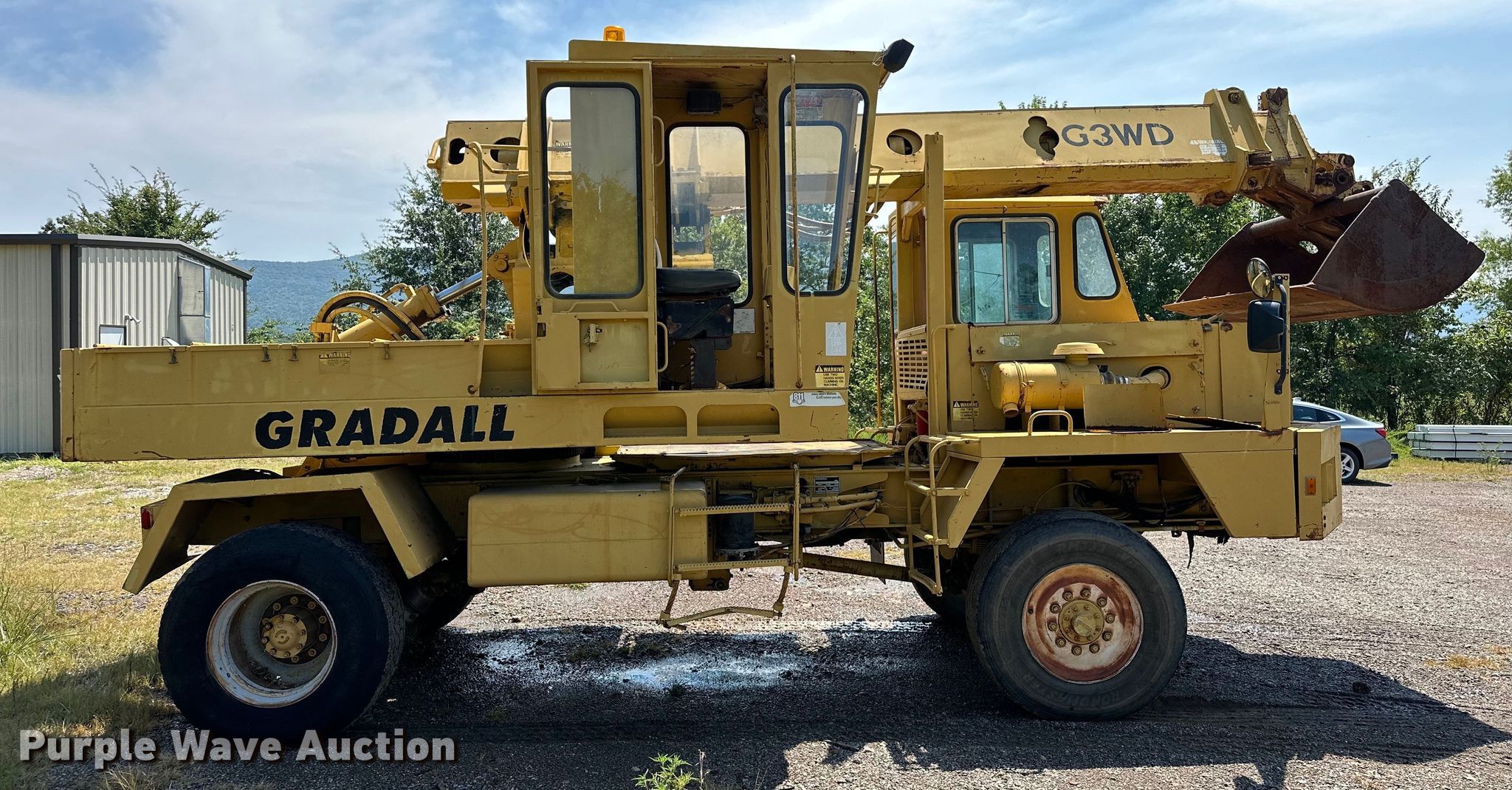 1997 Gradall G3WD wheeled excavator. Miles: 16,581 on odometer, Hours: 9,373 on meter, Serial: 0133257. Engine Cummins 6BT-5.9, Serial: 44293614, Displacement: 5.9L, Cylinders: 6, Fuel type: Diesel. Transmission Powershift, 6F - 3R. Operators station Enclosed cab. Features Boom Standard, Stick Stick length: 23', Bucket Width: 66", Cutting edge: Bolt-on. Tires Size: 385/65R22.5. Hartford, AR 72938