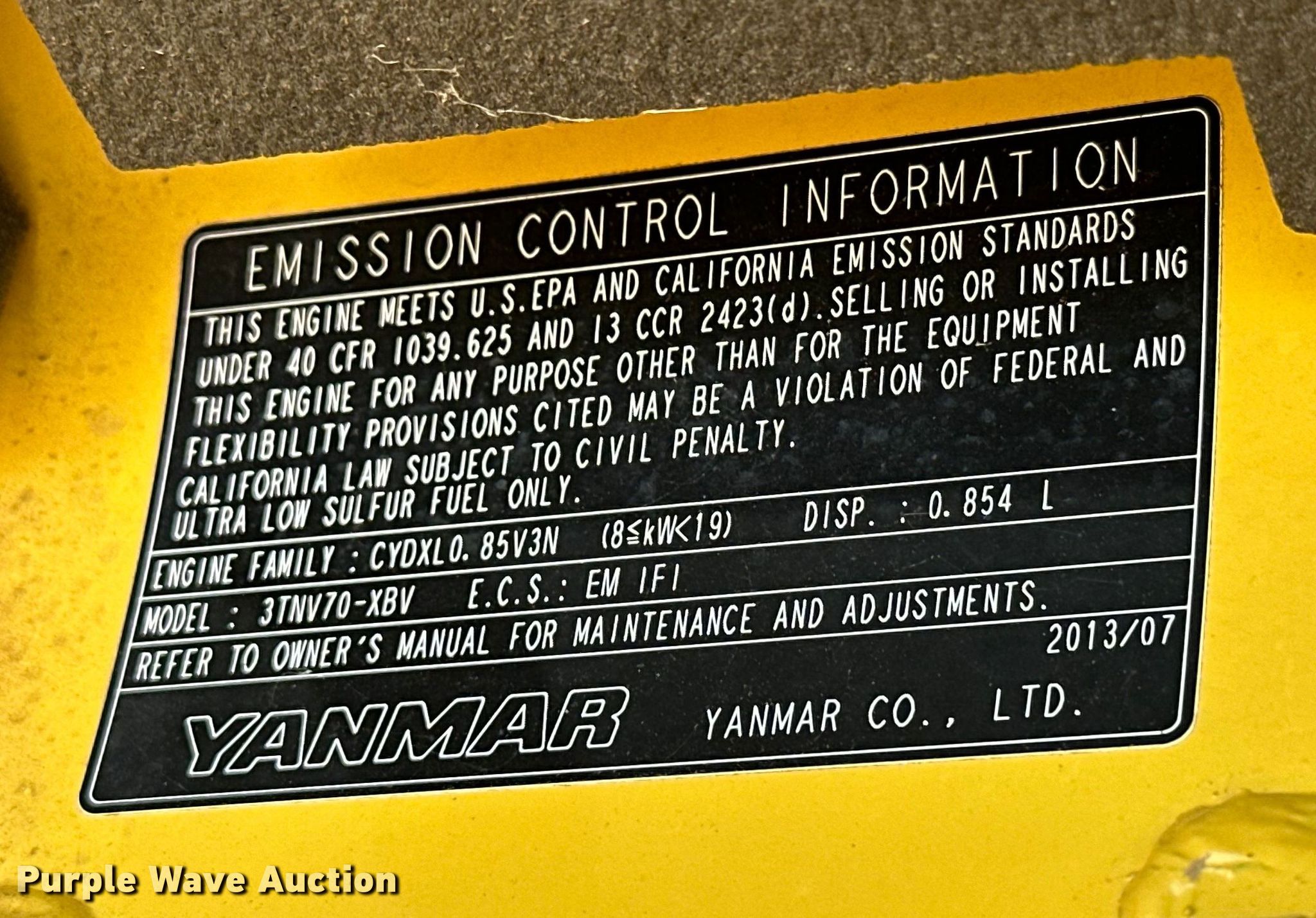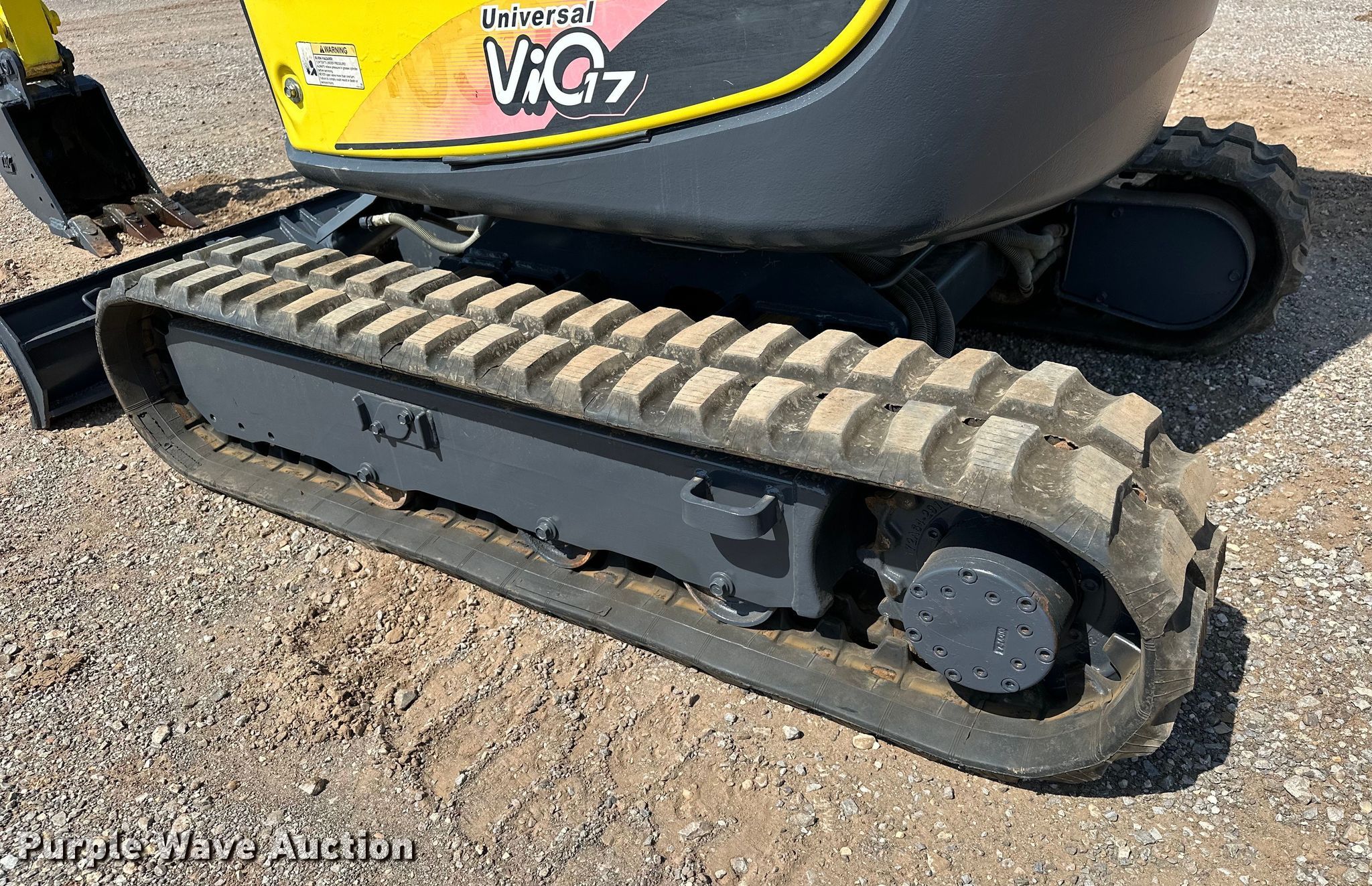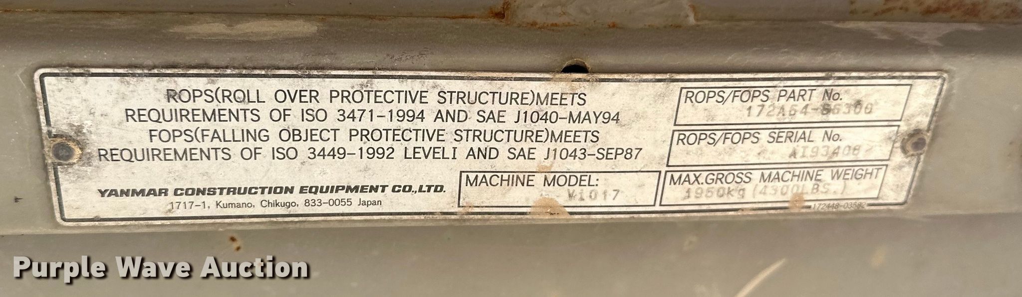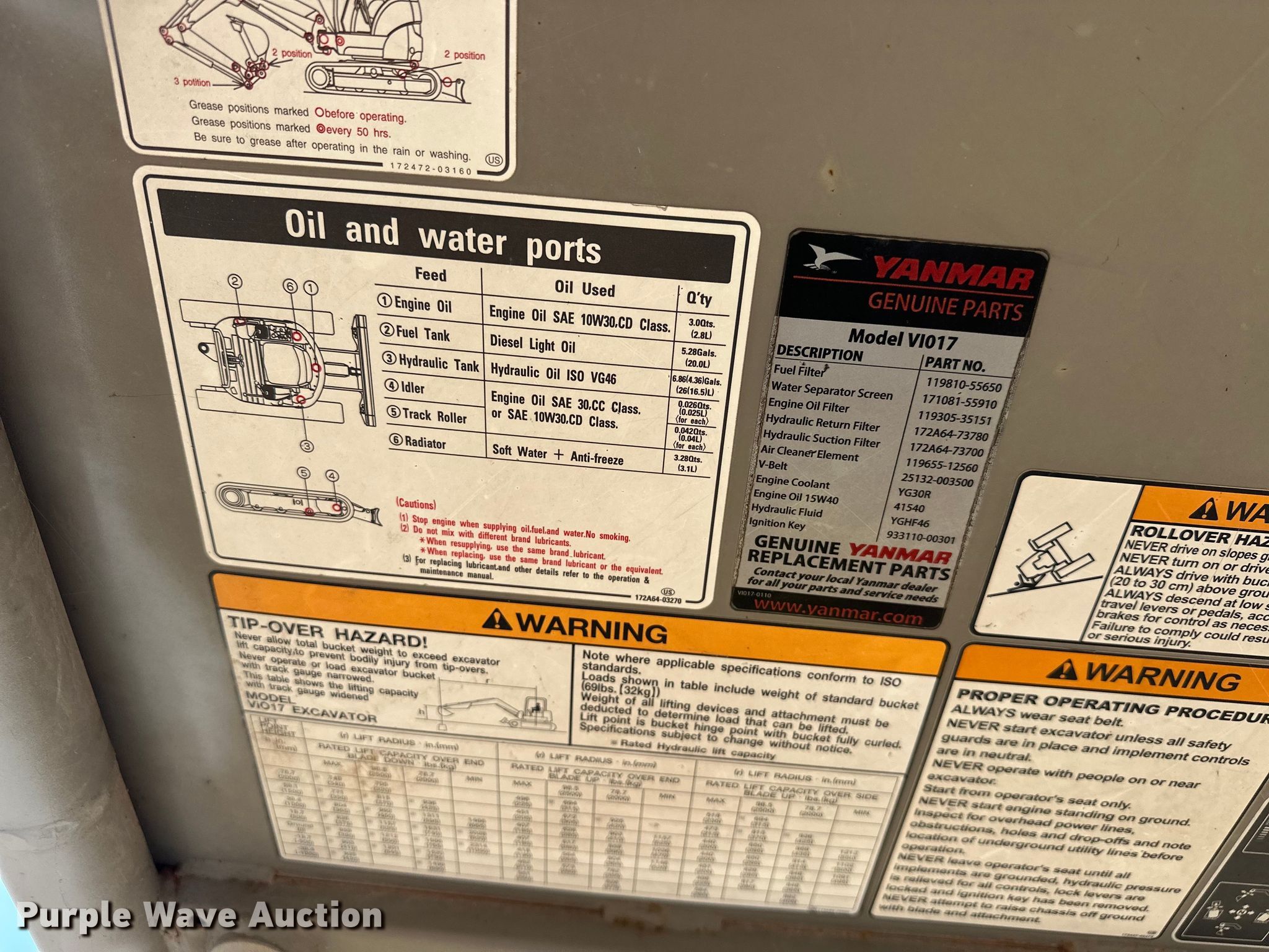 2014 Yanmar VI017 mini excavator. Hours: 2,008 on meter, Serial: YMRVI017VDYJ09380. Engine Yanmar 3TNV70-XBV, Serial: A1151, Displacement: 0.854L, Cylinders: 3, Fuel type: Diesel. Transmission Hydrostatic. Operators station OROPS, Pattern changer. Features Auxiliary hydraulics Standard, Two-way, Backfill blade Width: 50.5", Boom Swing, Stick Stick length: 3' 2", Quick coupler: Mechanical, Bucket TAG, Width: 12", Teeth: 3. Tracks Width: 9", Rubber. Norman, OK 73072