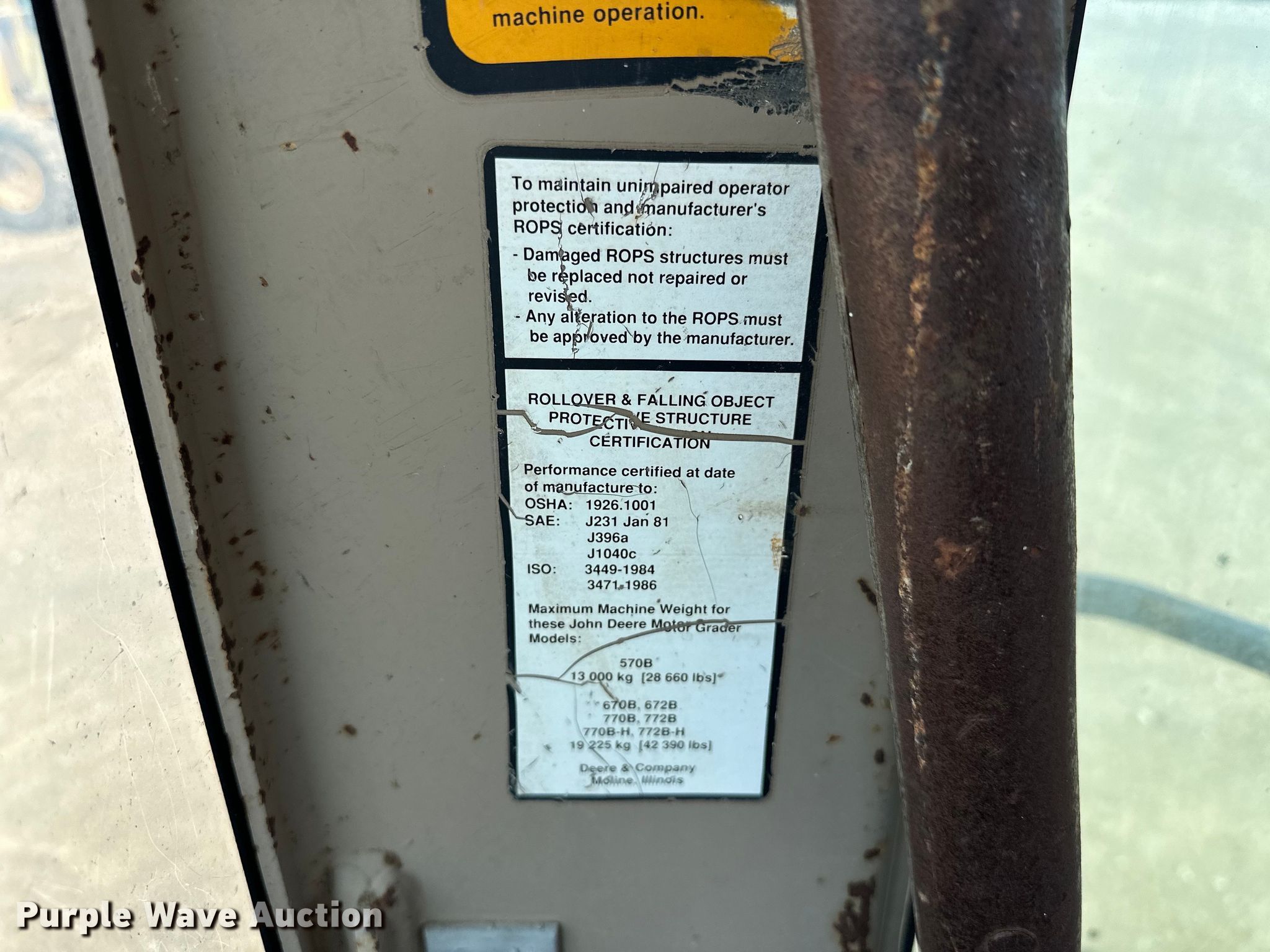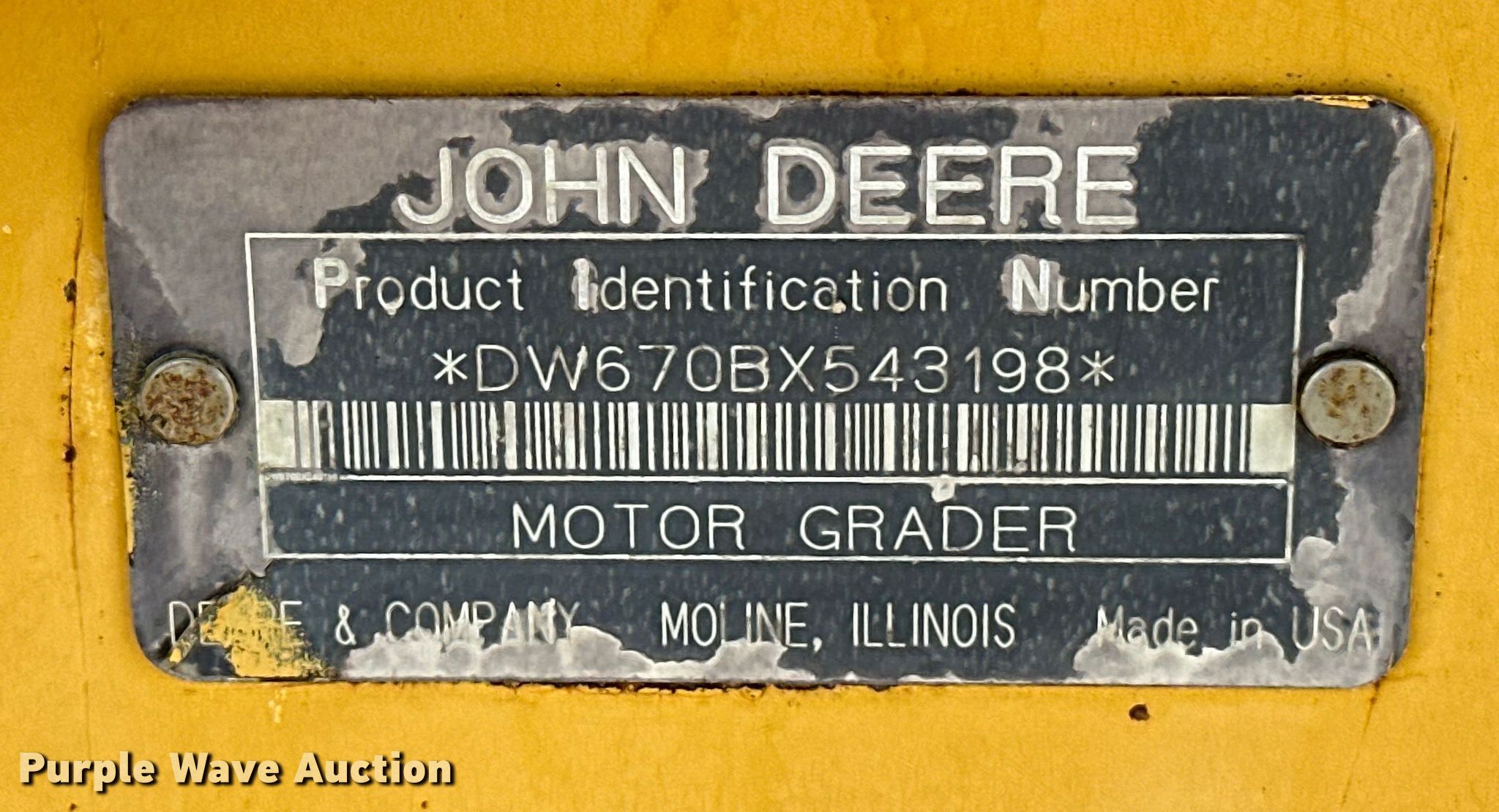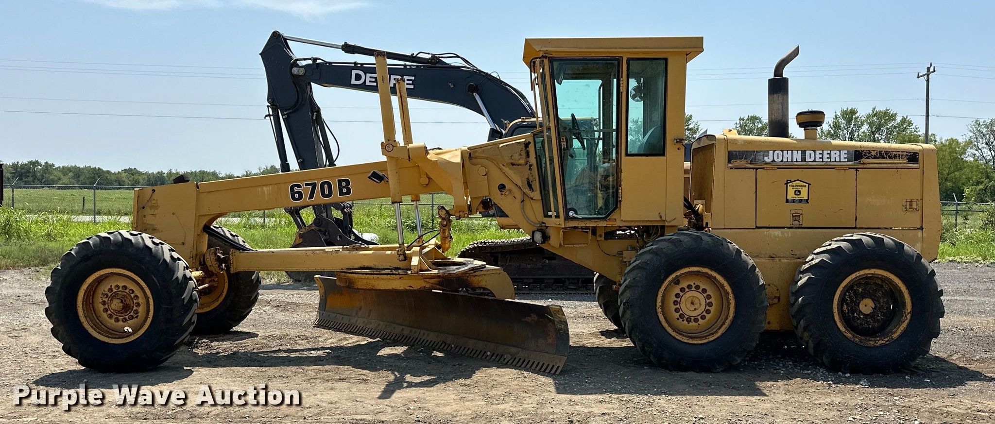 Purple Wave is selling a used Motor Grader in Oklahoma. This item is a 1993 John Deere 670B motor grader with the following: Hours: 14,172 on meter, Serial: DW670BX543198
