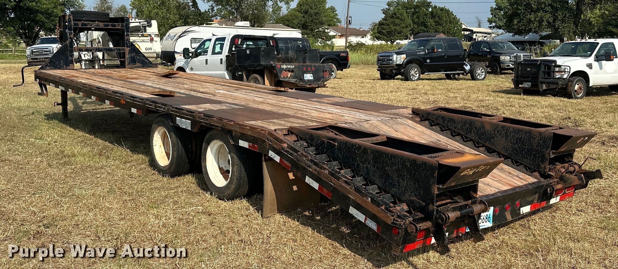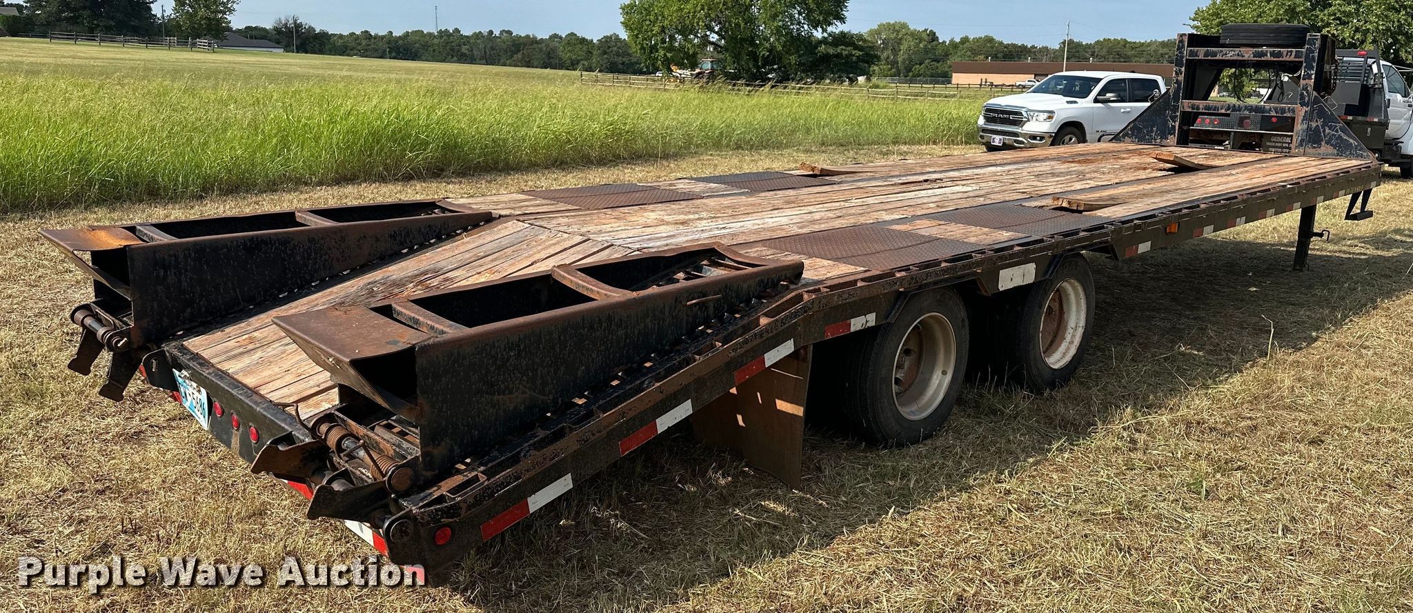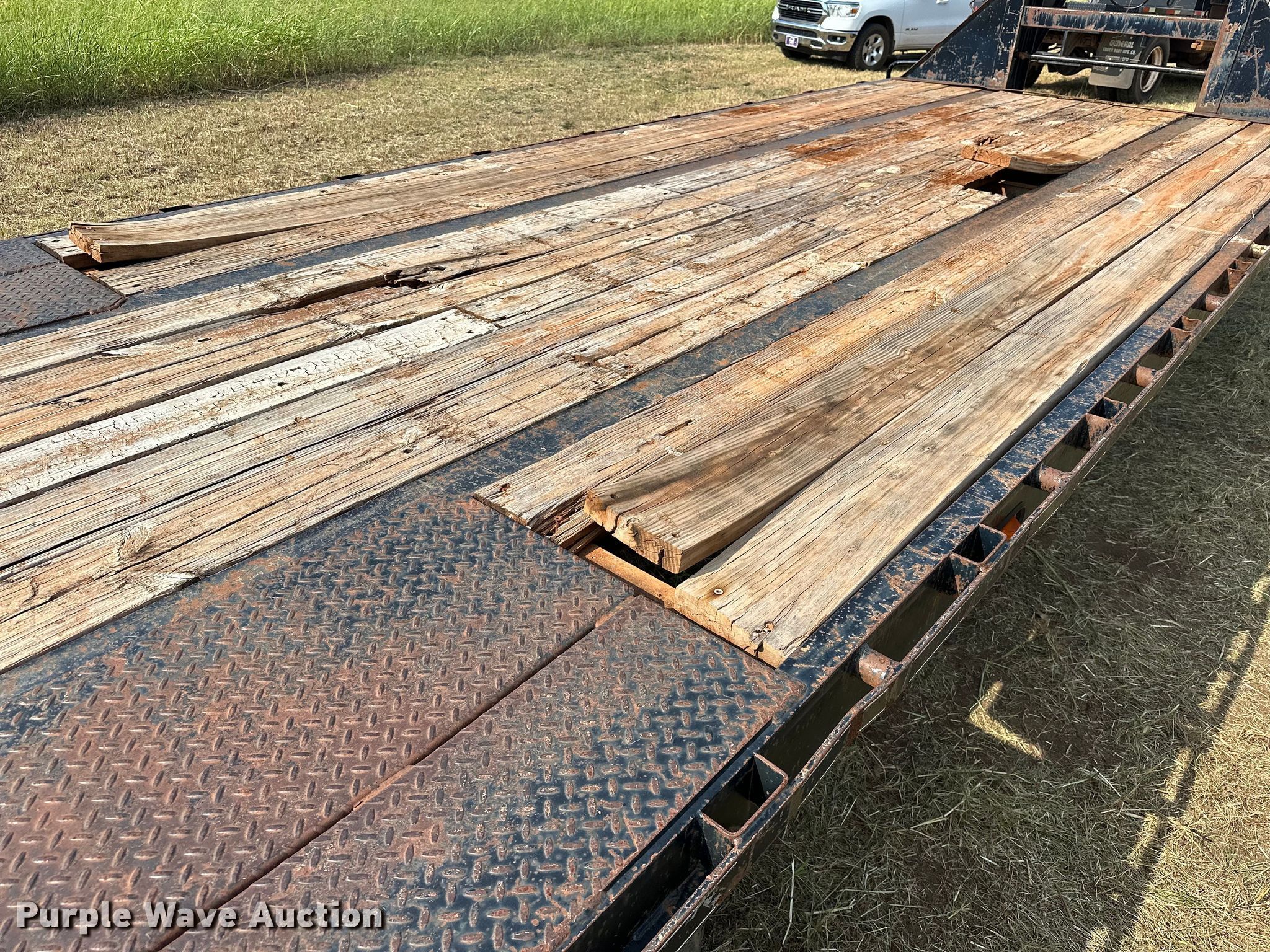 2012 Big Tex 3XGN equipment trailer. VIN: 16VGX2527C2732574. Dimensions Overall: 38' L x 101.5" W, Deck: 25' L x 97" W, Tail length: 5', Ramps: Manual Length: 5' 3". Features Deck type: Steel, Wood. Chassis Hitch: Gooseneck, Landing gear: Dual, Suspension: Spring, Brakes: Electric, Axles: Tandem, GVWR: 30,000 lbs, GAWR: 15,000 lbs. Tires Steel wheels, Size: 215/75R17.5. Notes Ramp issues, cross brace welds broke. Oklahoma title. Patriot Environmental, LLC. Meeker, OK 74855