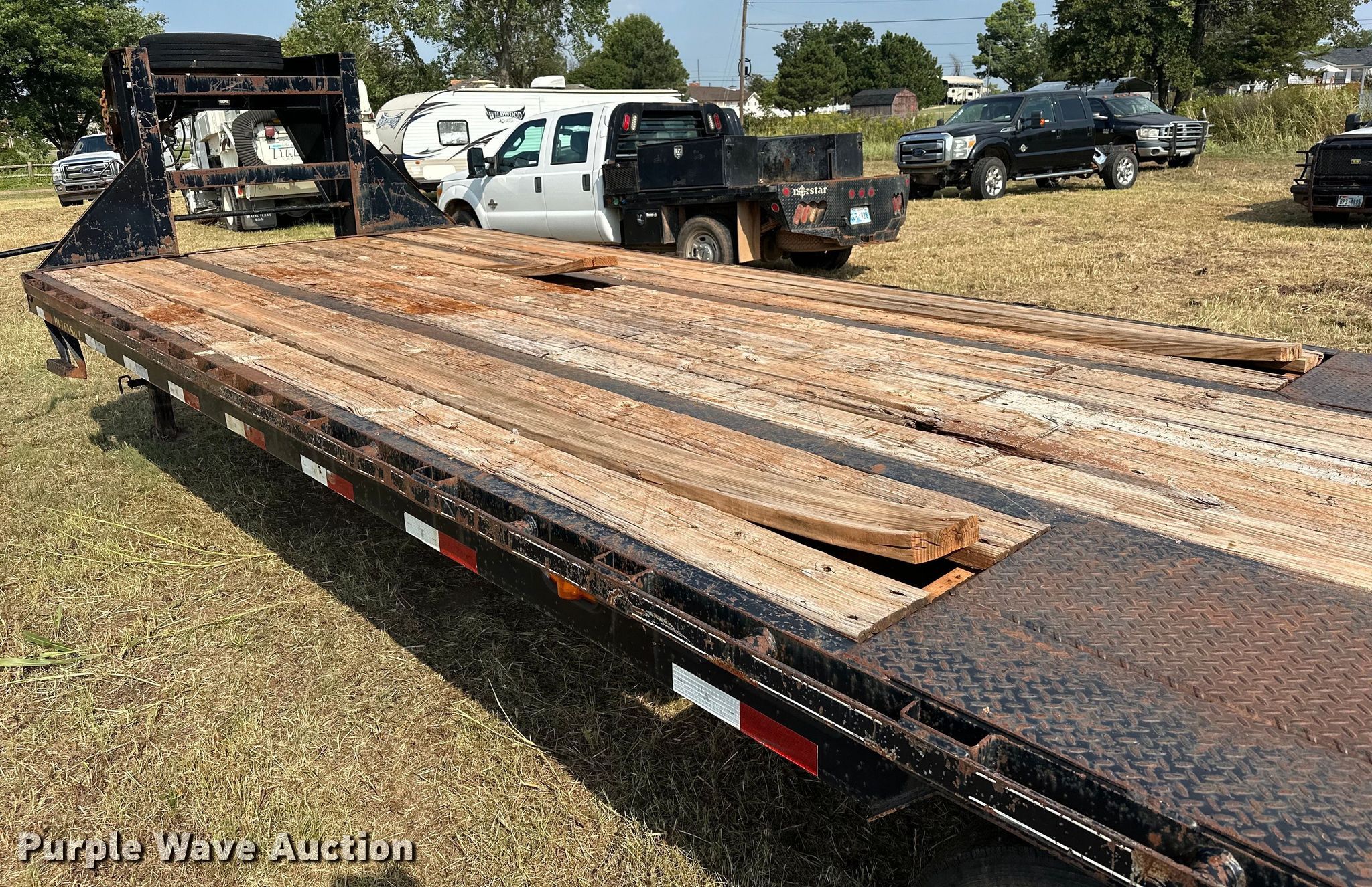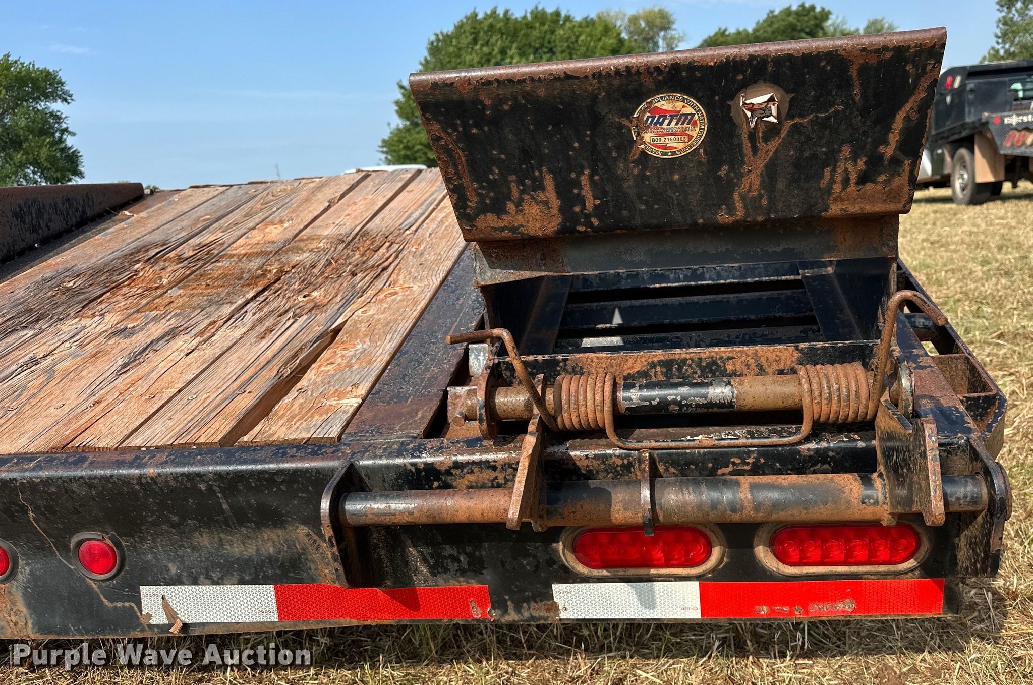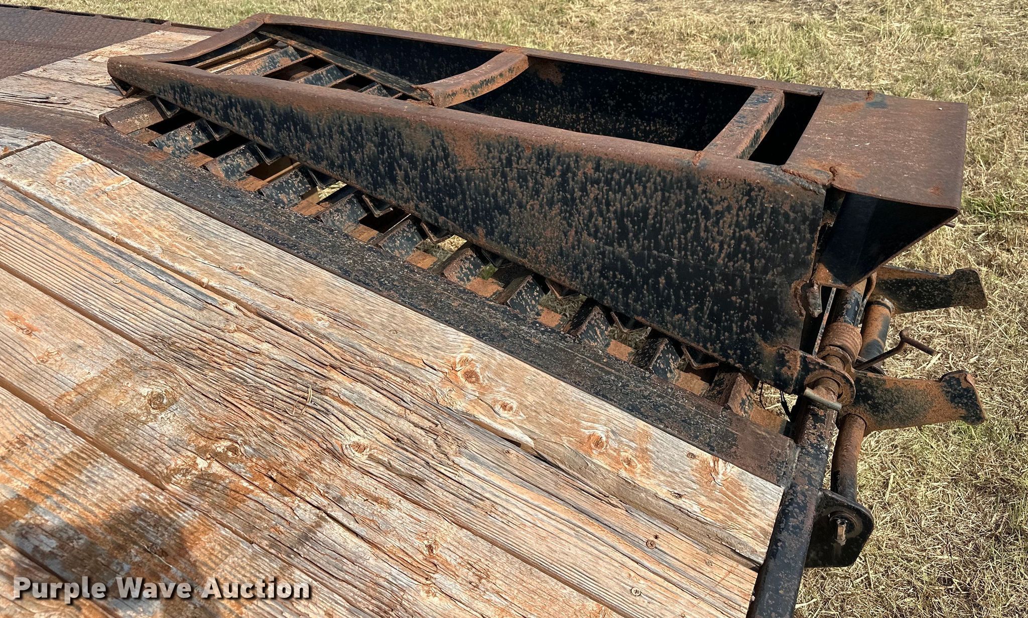2012 Big Tex 3XGN equipment trailer. VIN: 16VGX2527C2732574. Dimensions Overall: 38' L x 101.5" W, Deck: 25' L x 97" W, Tail length: 5', Ramps: Manual Length: 5' 3". Features Deck type: Steel, Wood. Chassis Hitch: Gooseneck, Landing gear: Dual, Suspension: Spring, Brakes: Electric, Axles: Tandem, GVWR: 30,000 lbs, GAWR: 15,000 lbs. Tires Steel wheels, Size: 215/75R17.5. Notes Ramp issues, cross brace welds broke. Oklahoma title. Patriot Environmental, LLC. Meeker, OK 74855