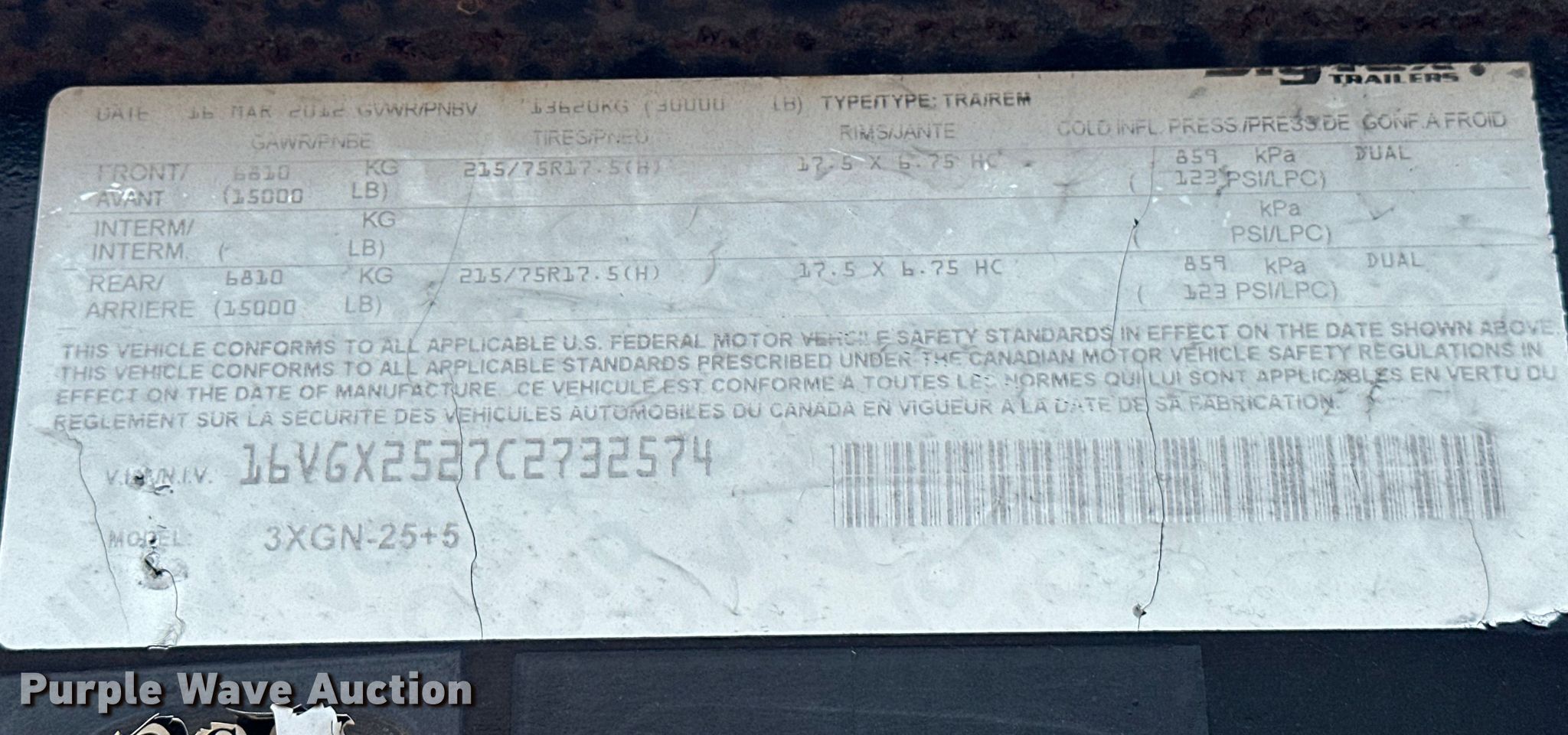 Purple Wave is selling a used Equip. Trailer in Oklahoma. This item is a 2012 Big Tex 3XGN equipment trailer with the following: VIN: 16VGX2527C2732574