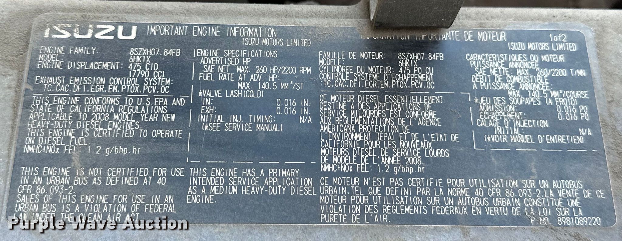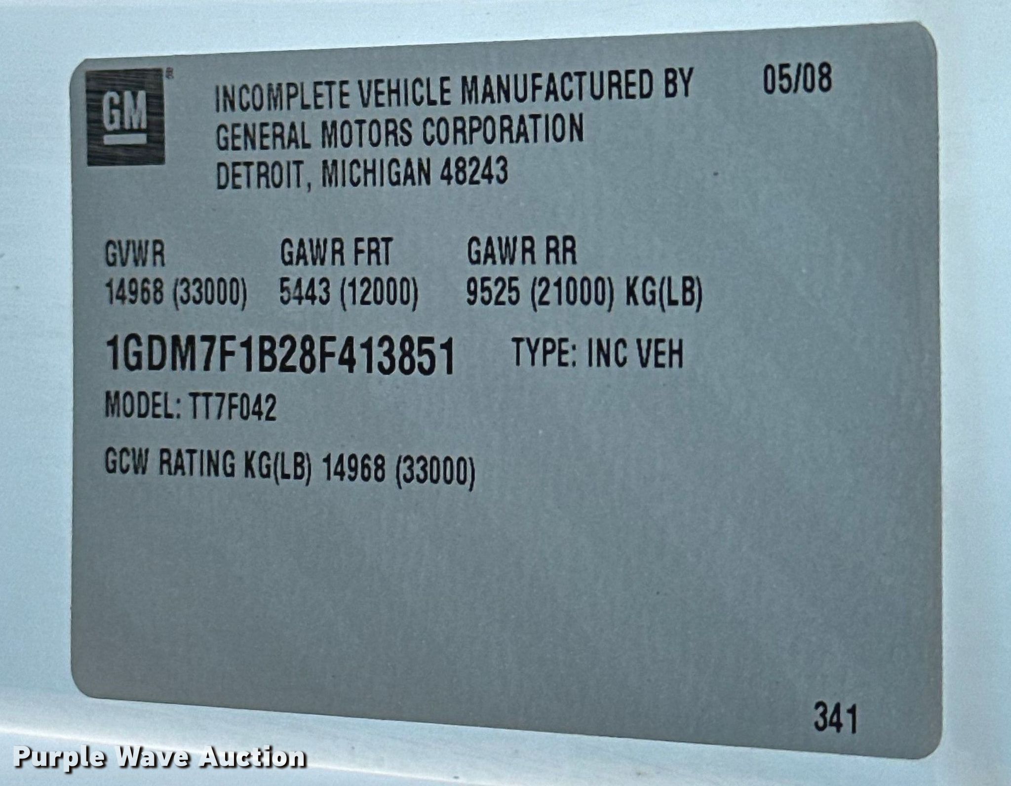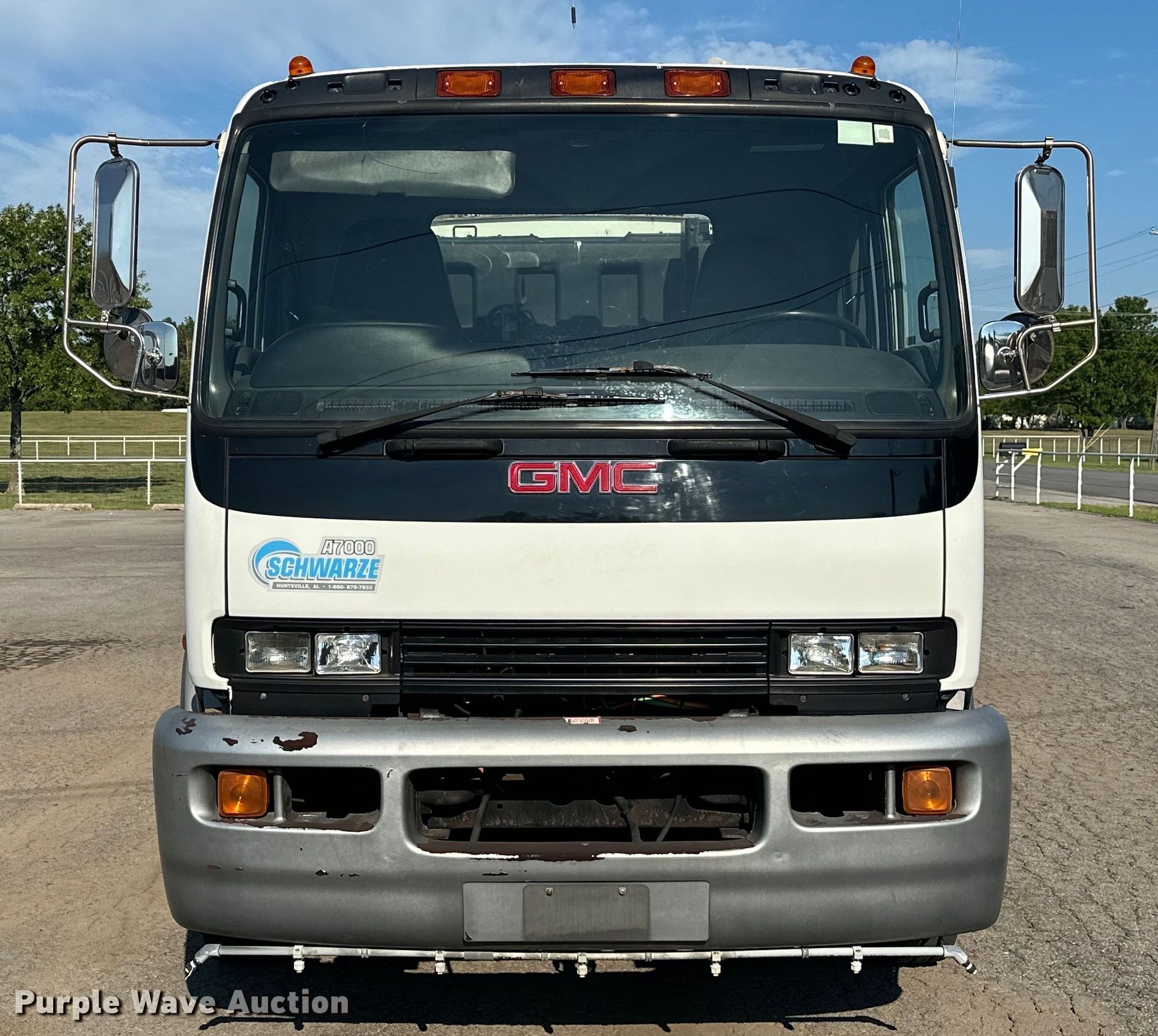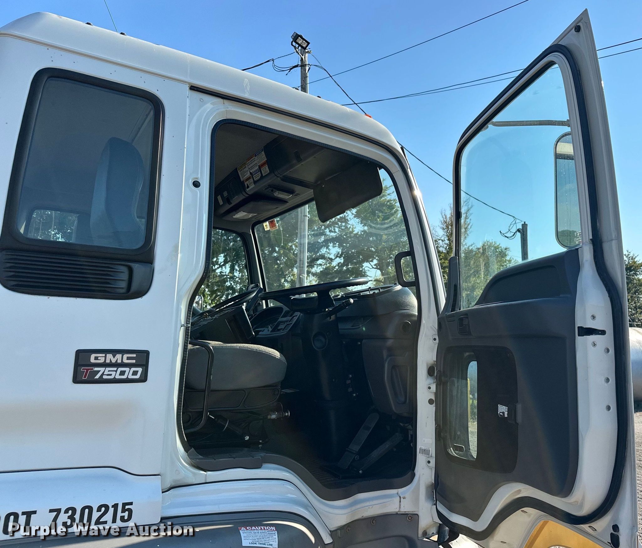 2008 GMC T7500 street sweeper truck. Miles: 17,966 on odometer, VIN: 1GDM7F1B28F413851. Engine Isuzu 6HK1X, Displacement: 475 C.I.D., Cylinders: 6, Fuel type: Diesel. Transmission Automatic. Chassis Suspension: Air, Brakes: Air, Dump valves, GVWR: 33,000 lbs. Operators station AC, Heat, Dual operating station, Video monitoring system. Features Sweeper bed Sweeper bed type: Vacuum Schwarze A7000, Serial: 09A70000365, Left gutter broom Diameter: 32", Right gutter broom Diameter: 32", Engine John Deere, Engine hours: 1564, Cylinders: 4. Tires Size: 11R22.5. Notes Dash warning indicator: Brake, Windshield chipped or cracked. Oklahoma title. Title distribution may be delayed up to 14 days from verification of funds. Moore Contracting Co. inc.. Pocola, OK 74902