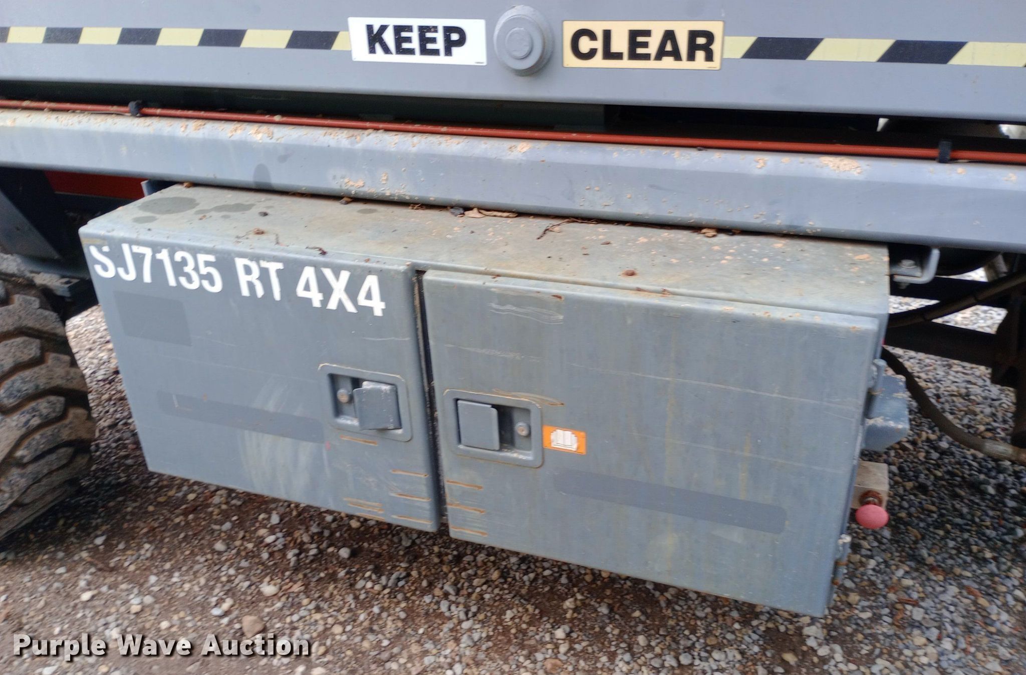 2003 Skyjack SJ7135 scissor lift. Hours: 3,752 on meter, Serial: 34000137R. Engine Kubota DF972-ES, Cylinders: 3, Fuel type: Dual fuel. Chassis Four wheel drive. Features Rough terrain, Maximum lift capacity: 1,000 lbs, Maximum lift height: 35', Platform: 115" L x 67" W, AC power outlet, Controls: Platform, Platform extensions: Manual. Tires Tire size: 10-16.5, Foam filled. Augusta Rental. Augusta, KS 67010
