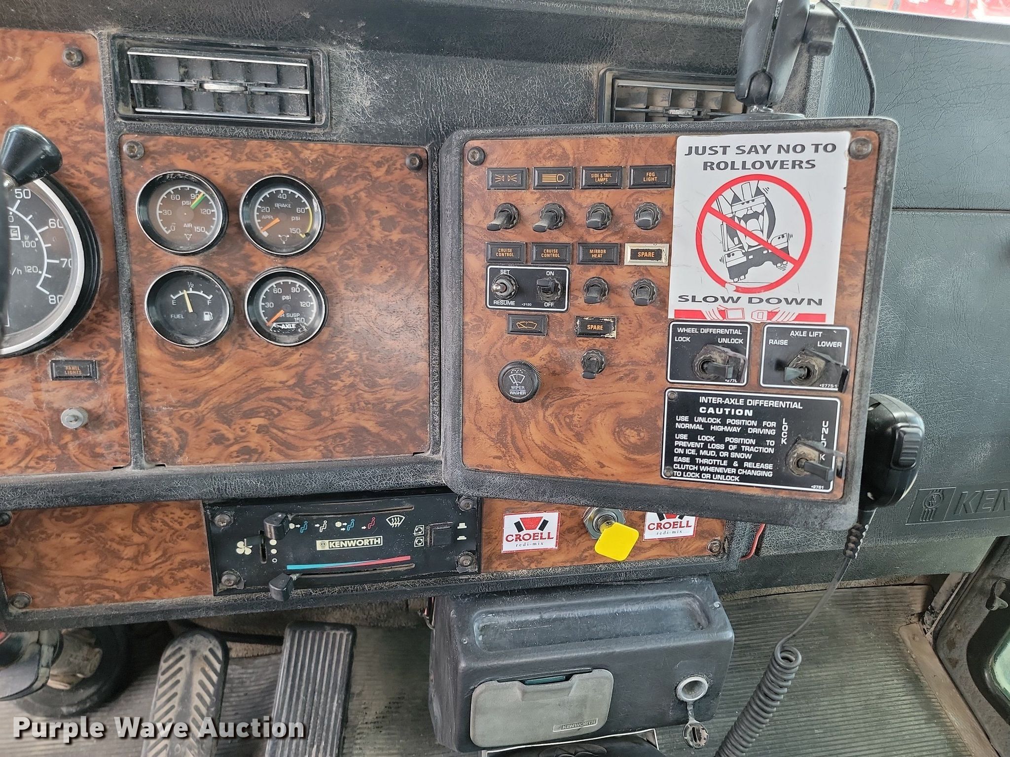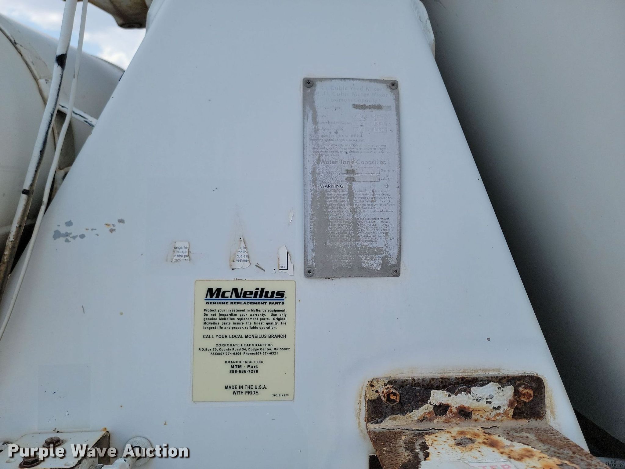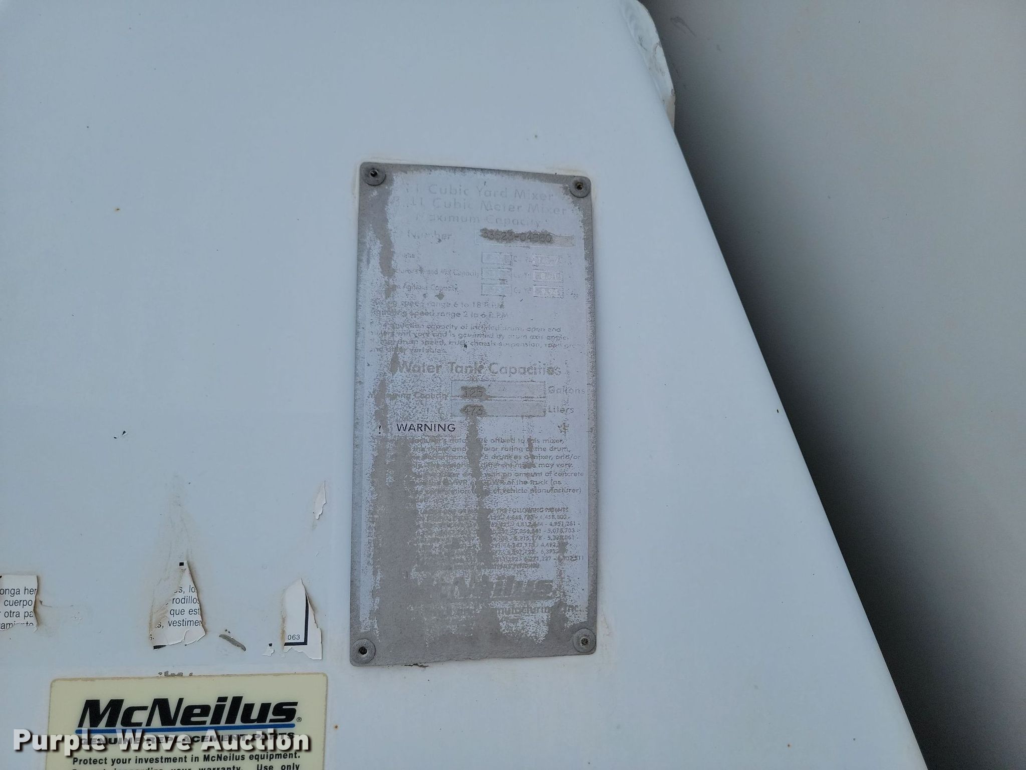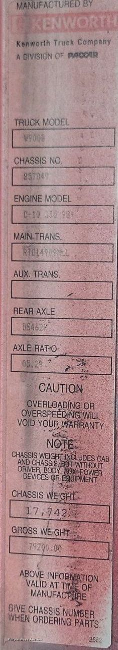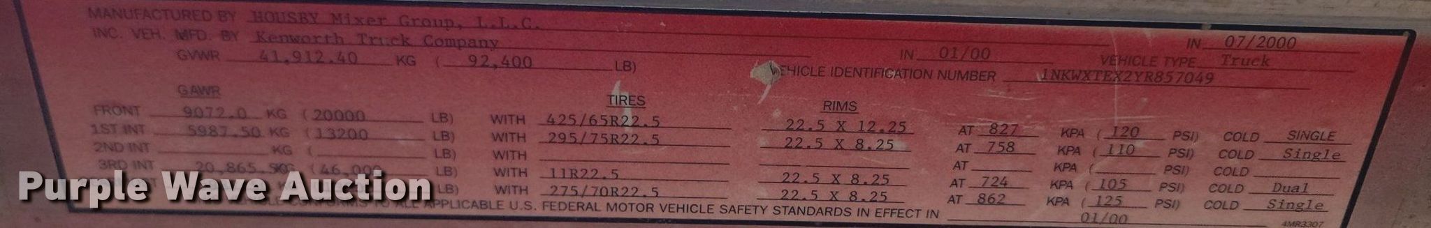2000 Kenworth W900B ready mix truck. Miles: 182,763 on odometer, VIN: 1NKWXTEX2YR857049. Engine Caterpillar C10, Displacement: 10.3L, Cylinders: 6, Fuel type: Diesel. Transmission Manual. Chassis Axles: 4, Pusher axle Steerable, Tag axle Steerable, Differential lock: Inter-axle, Suspension: Spring over walking beam, Brakes: Air, PTO, GVWR: 92,400 lbs FAWR: 20,000 lbs, IAWR: 13,200 lbs, RAWR: 23,000 lbs, Lift axle GAWR: 13,200 lbs. Interior AC, Heat, Heated mirrors, Cruise control. Features Mixer McNelius, Capacity: 11 cu.yd., Discharge: Rear, In-cab controls, Rear drum controls, Water tank capacity: 125 gallons, Chute Extensions: 3, Chute type: Steel.. Tires Front: 425/65R22.5, Rear: 11R22.5, Lift axle: 255/70R22.5. Iowa title. Title distribution may be delayed up to 30 days from verification of funds. Croell Redi-Mix. Sundance, WY 82729