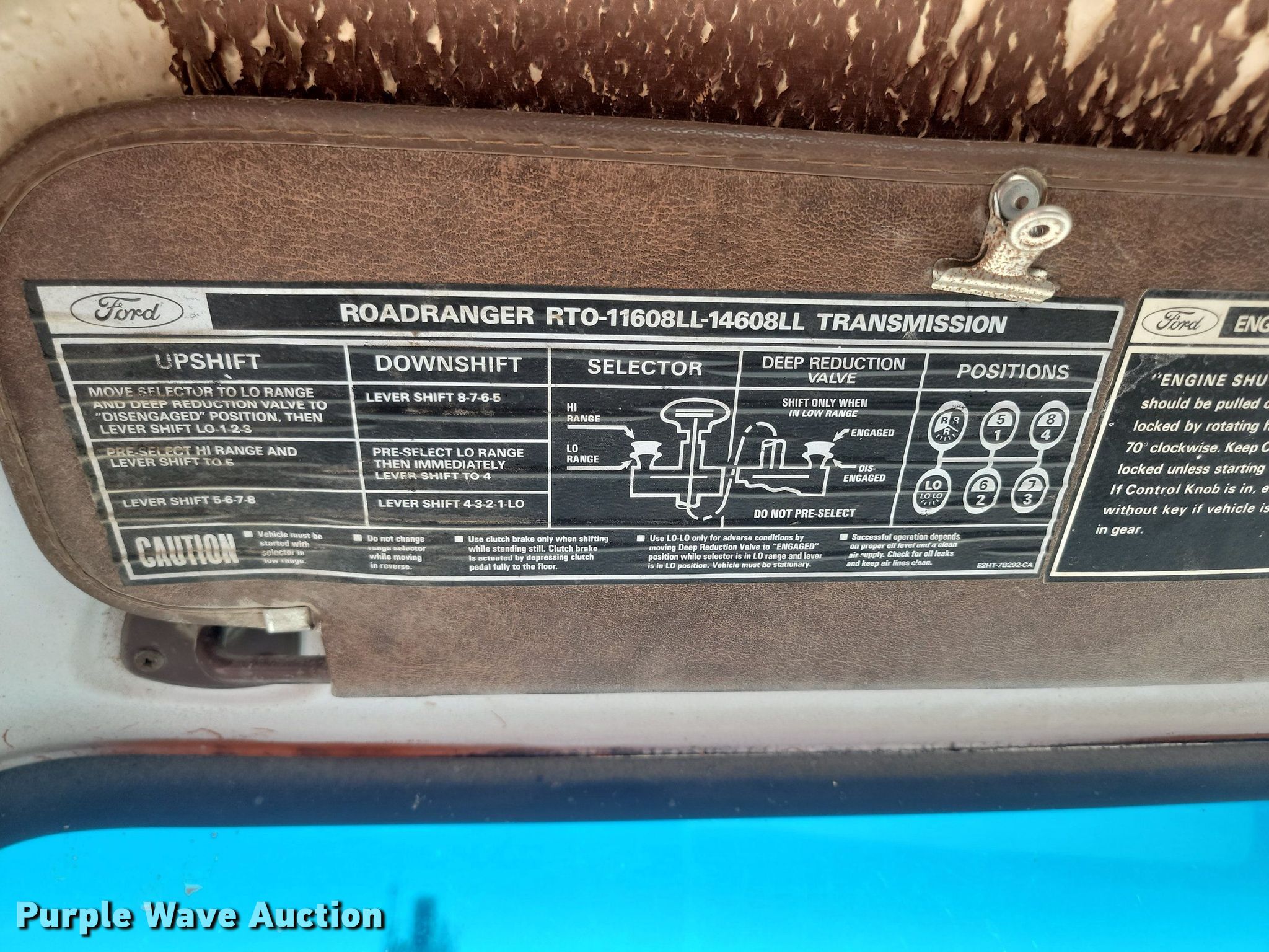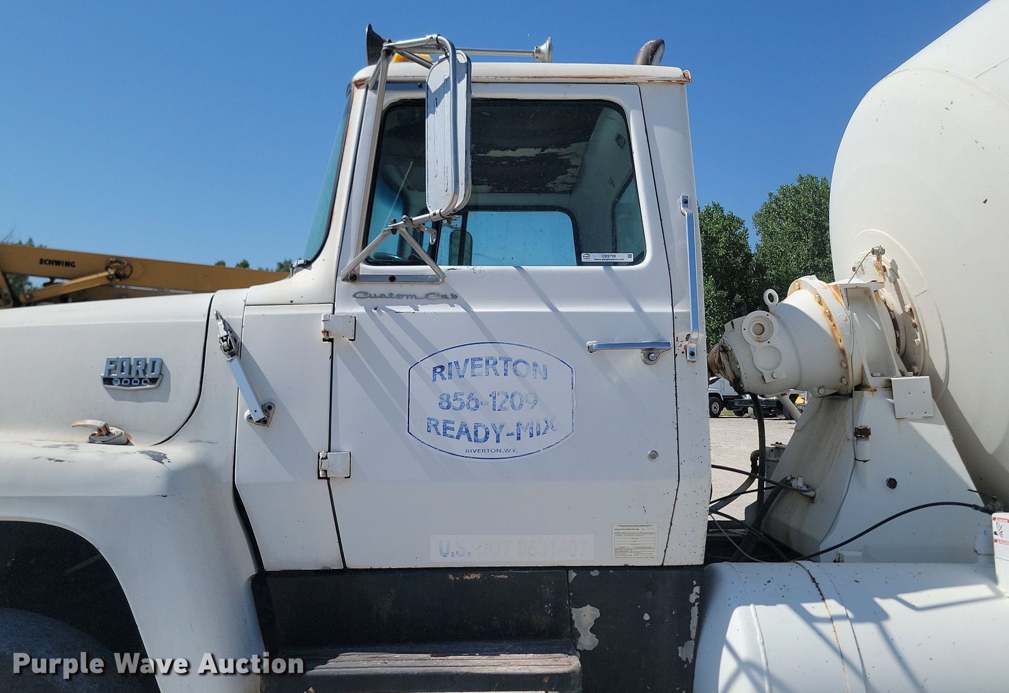 1982 Ford 8000 ready mix truck. Miles: 288,356 on odometer, VIN: 1FDYU90R1CVA27737. Engine Detroit Diesel, Displacement: 9.0L, Fuel type: Diesel. Transmission Ford Roadranger, Manual. Chassis Axles: Tandem, Differential lock: Inter-axle, Suspension: Spring over walking beam, Front mount PTO, GVWR: 50,000 lbs. Interior Heat. Features Mixer Discharge: Rear, In-cab controls, Rear drum controls, Water tank capacity: 150 gallons, Chute Extensions: 3, Chute type: Steel.. Tires Front: 315/80R22.5, Rear: 11R22.5. Notes Engine issues, blow by. Iowa title. Title distribution may be delayed up to 30 days from verification of funds. Croell Redi-Mix. Riverton, WY 82501