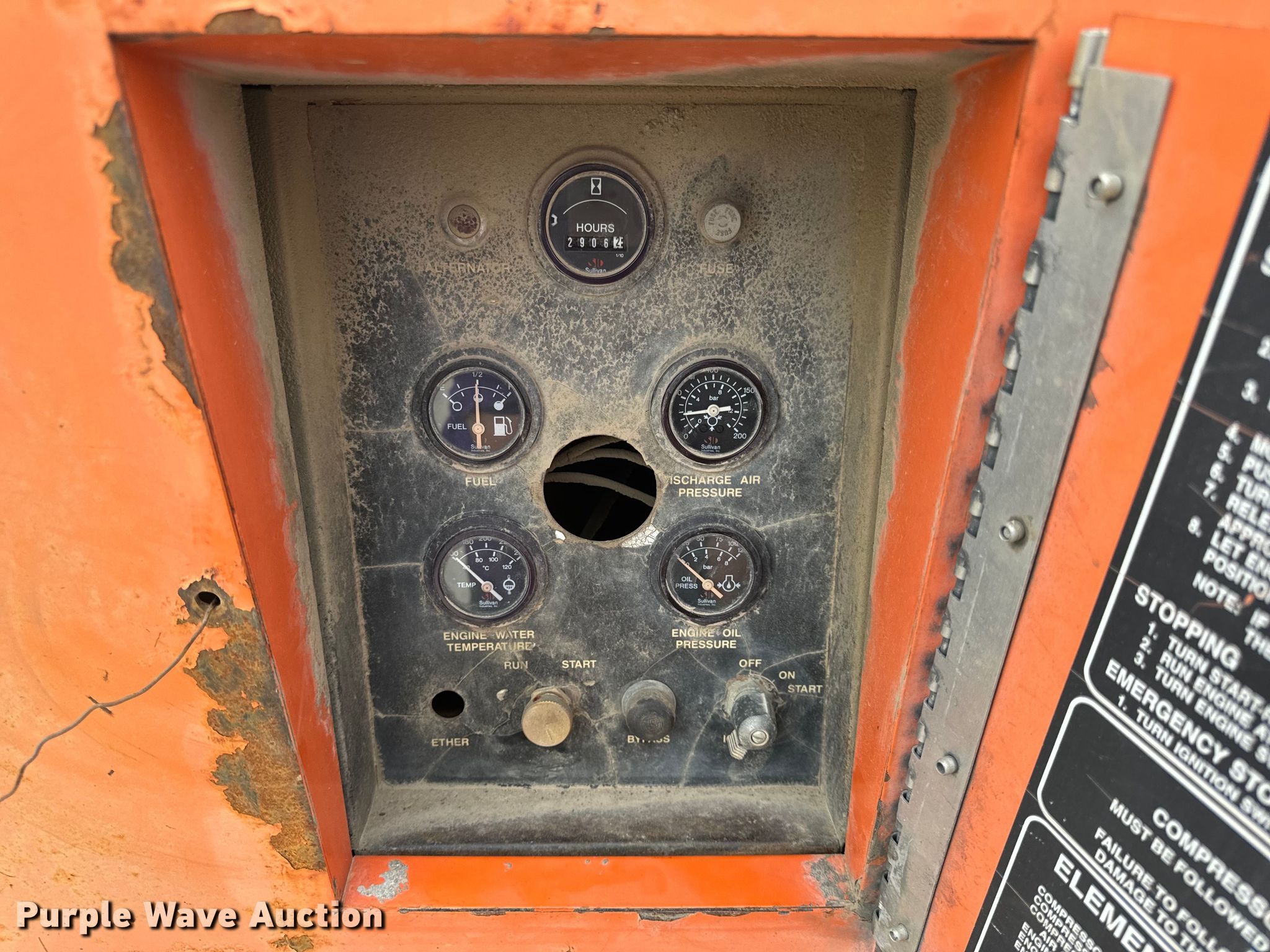 Purple Wave is selling a used Air Compressor in Missouri. This item is a Sullivan D185QV air compressor with the following: Hours: 2,906 on meter, Serial: 16542A