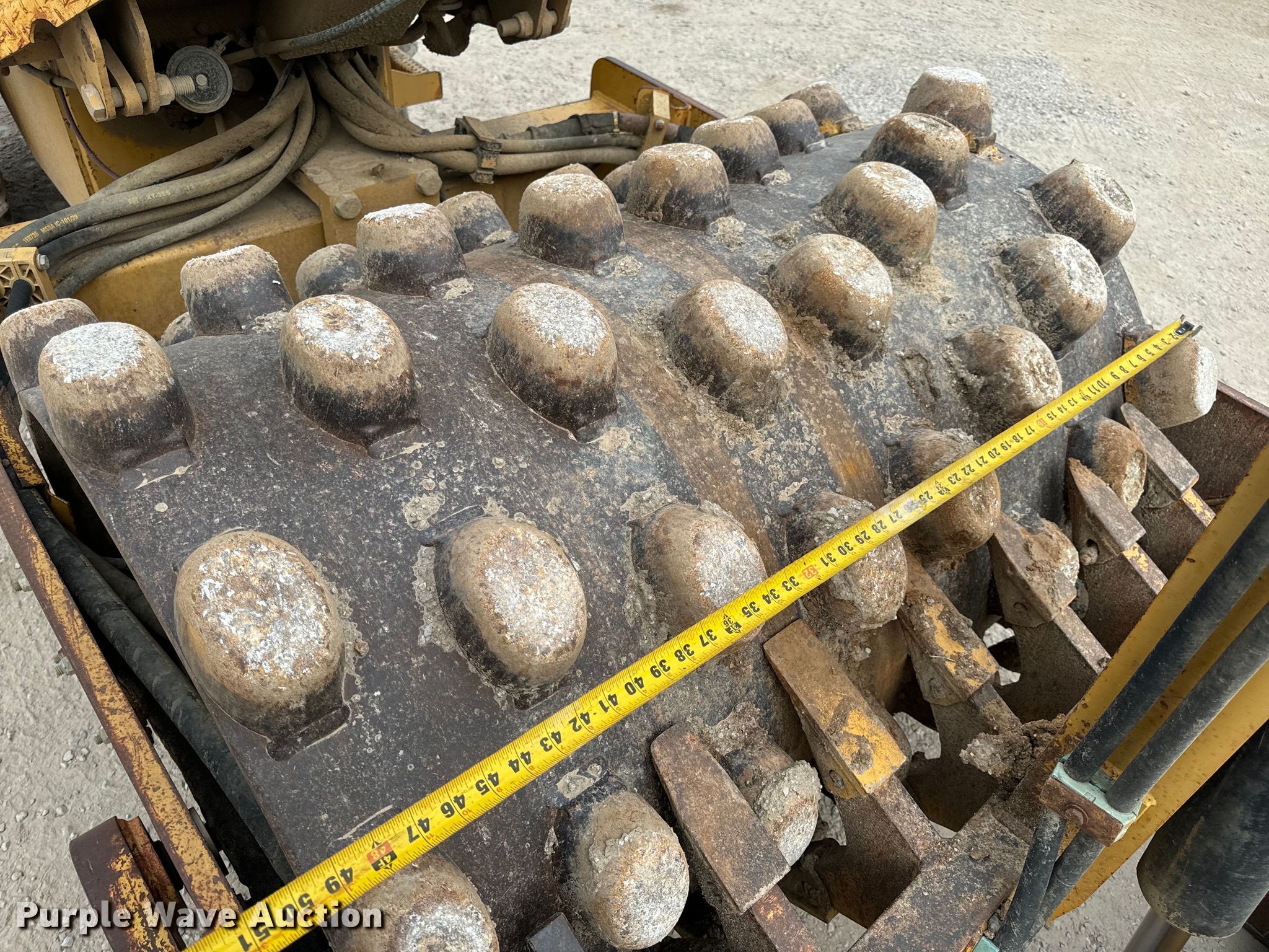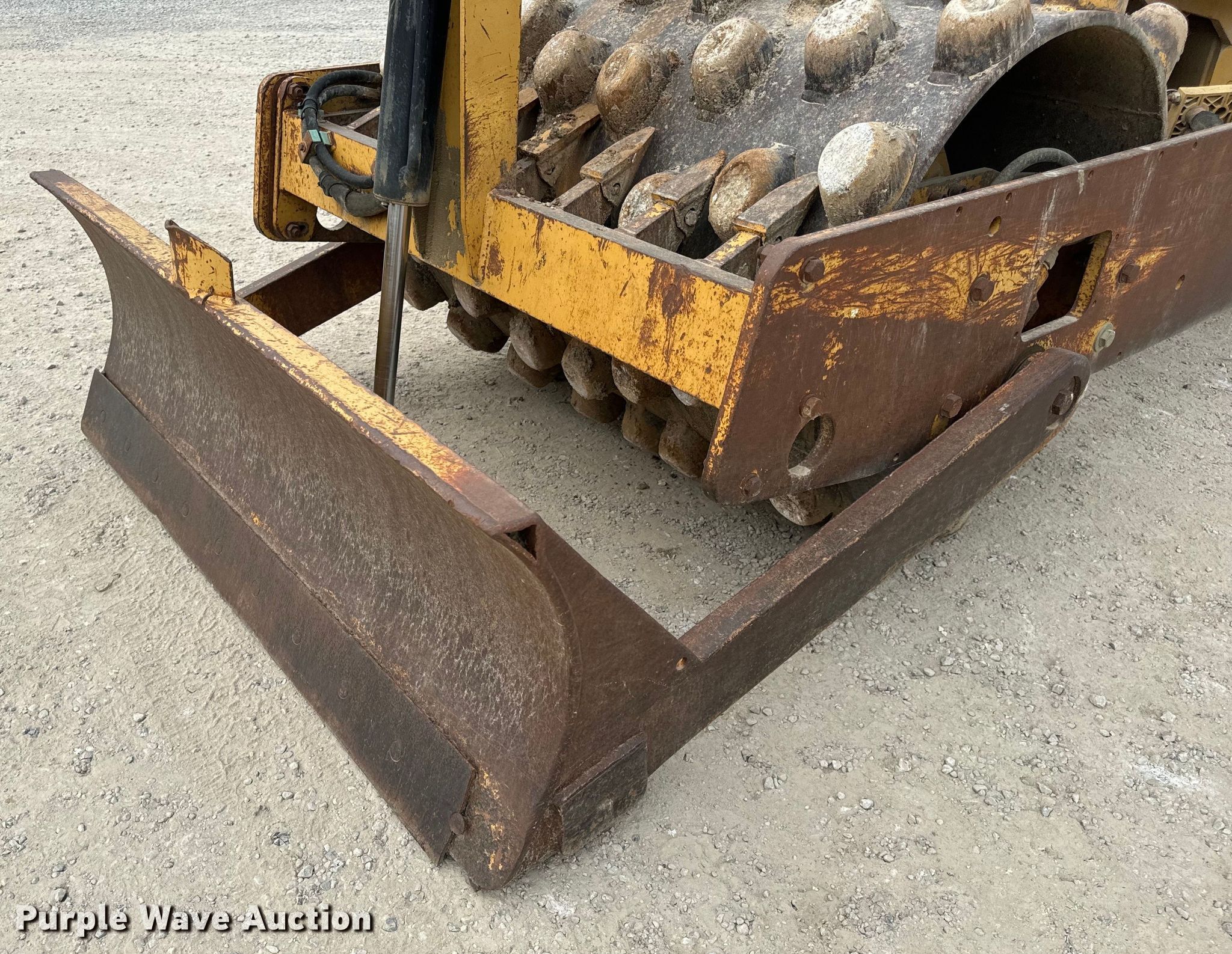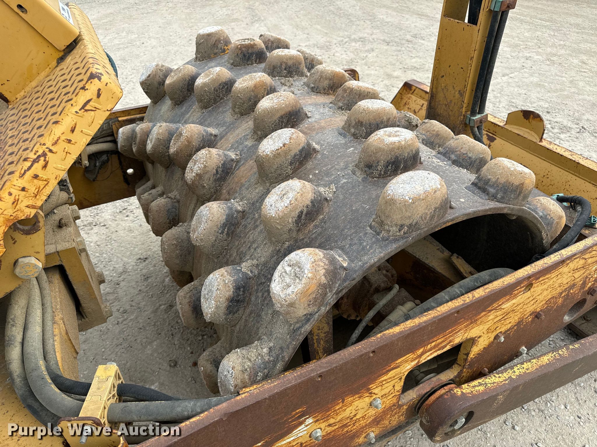 2002 Caterpillar CP-323C single drum vibratory roller. Hours: 4,574 on meter, Serial: CATCP323L6DM00554. Engine Caterpillar 3054, Serial: 7BJ52756, Cylinders: 4, Fuel type: Diesel. Transmission Hydrostatic. Operators station OROPS, Vandal cover. Features Drum: Padfoot, Vibratory system: Single, Front drum Width: 50", Diameter: 33", Drum scrapers: Front, Front blade width: 62". Tires Size: 11.2-24. Notes Front blade cutting edge broken. Kissick Construction Company. Kansas City, MO 64132