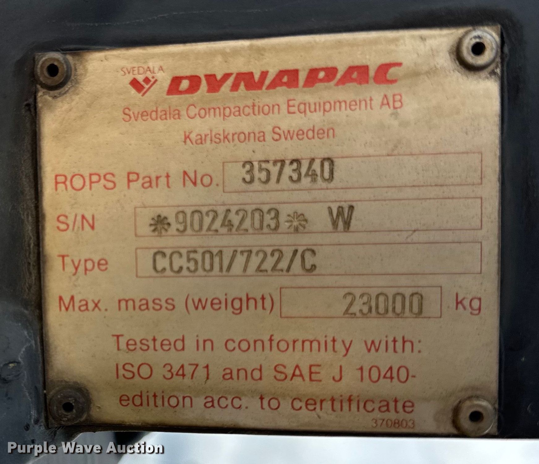 2003 Dynapac CC722 double drum vibratory roller has sold in Fort Wayne, Indiana for $4510. Item OG9634 sold on September 19th, 2024.